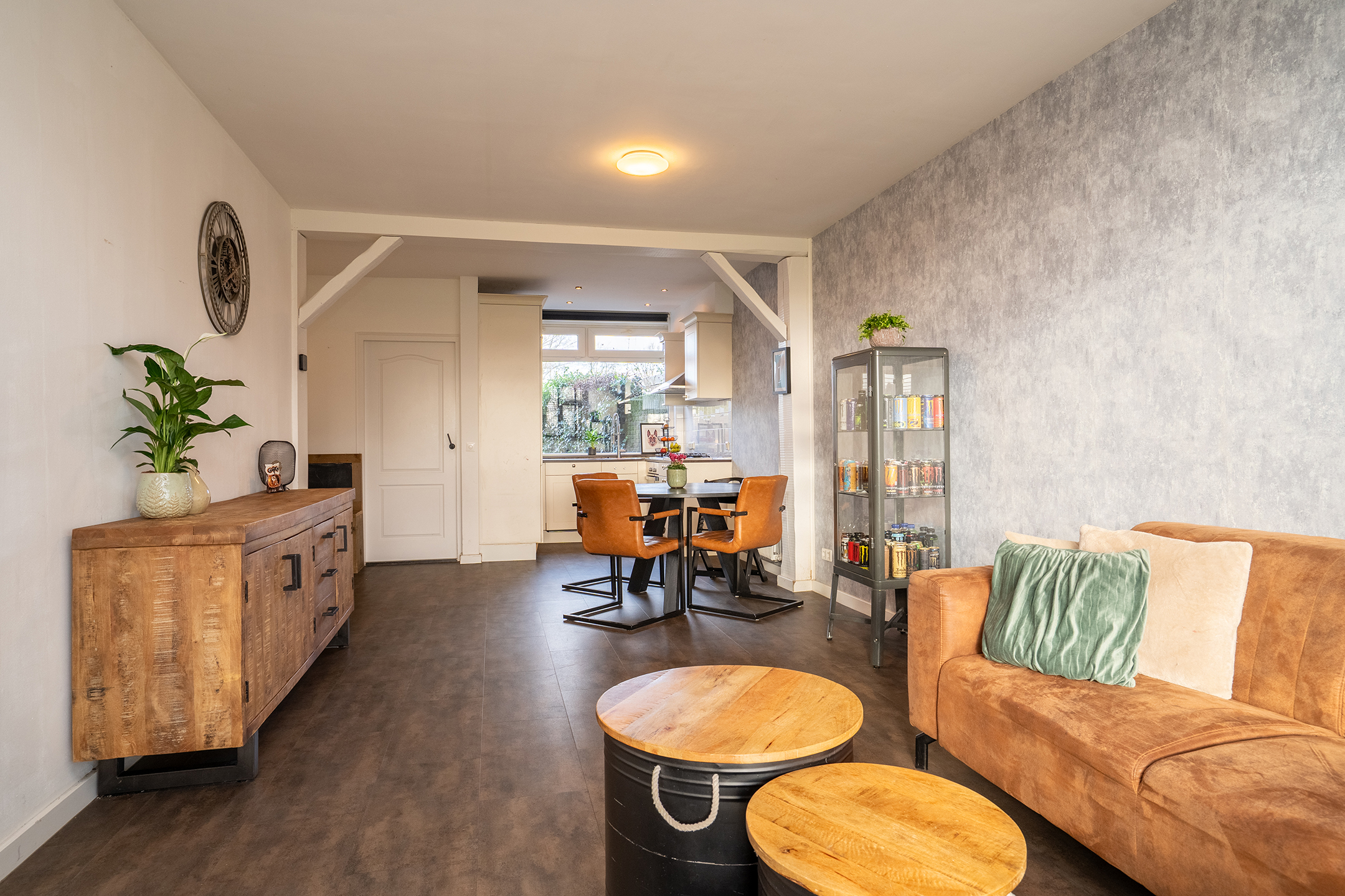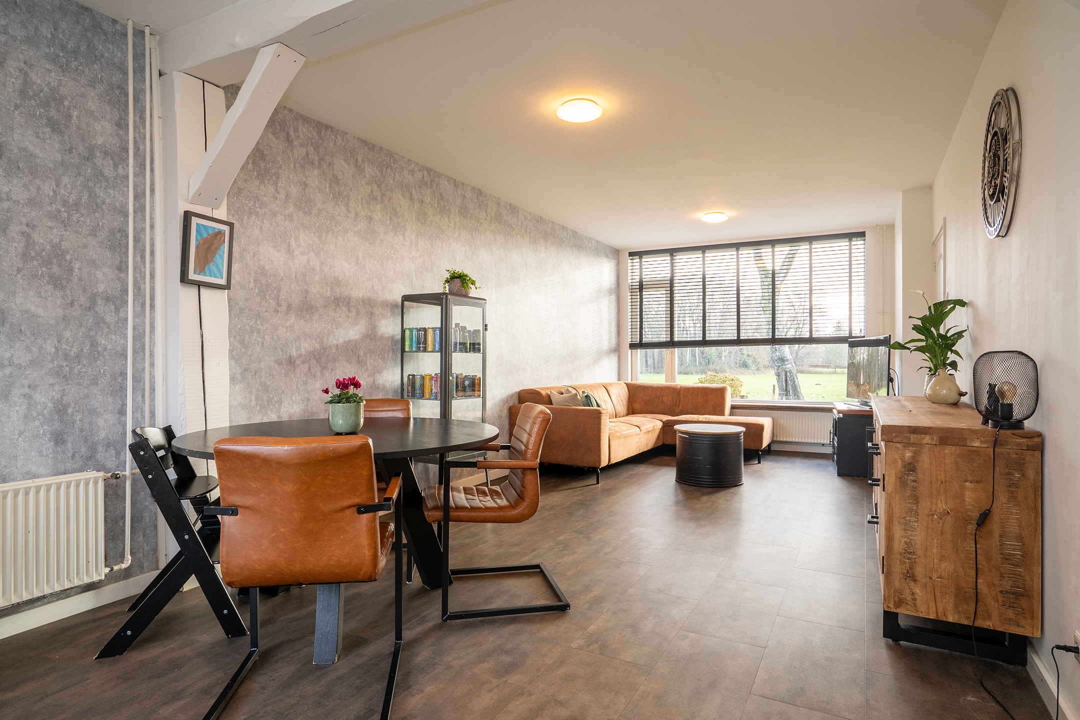De doorzonwoonkamer beschikt over grote raampartijen aan zowel de voor- als achterzijde, wat zorgt voor een prettige lichtinval gedurende de dag.