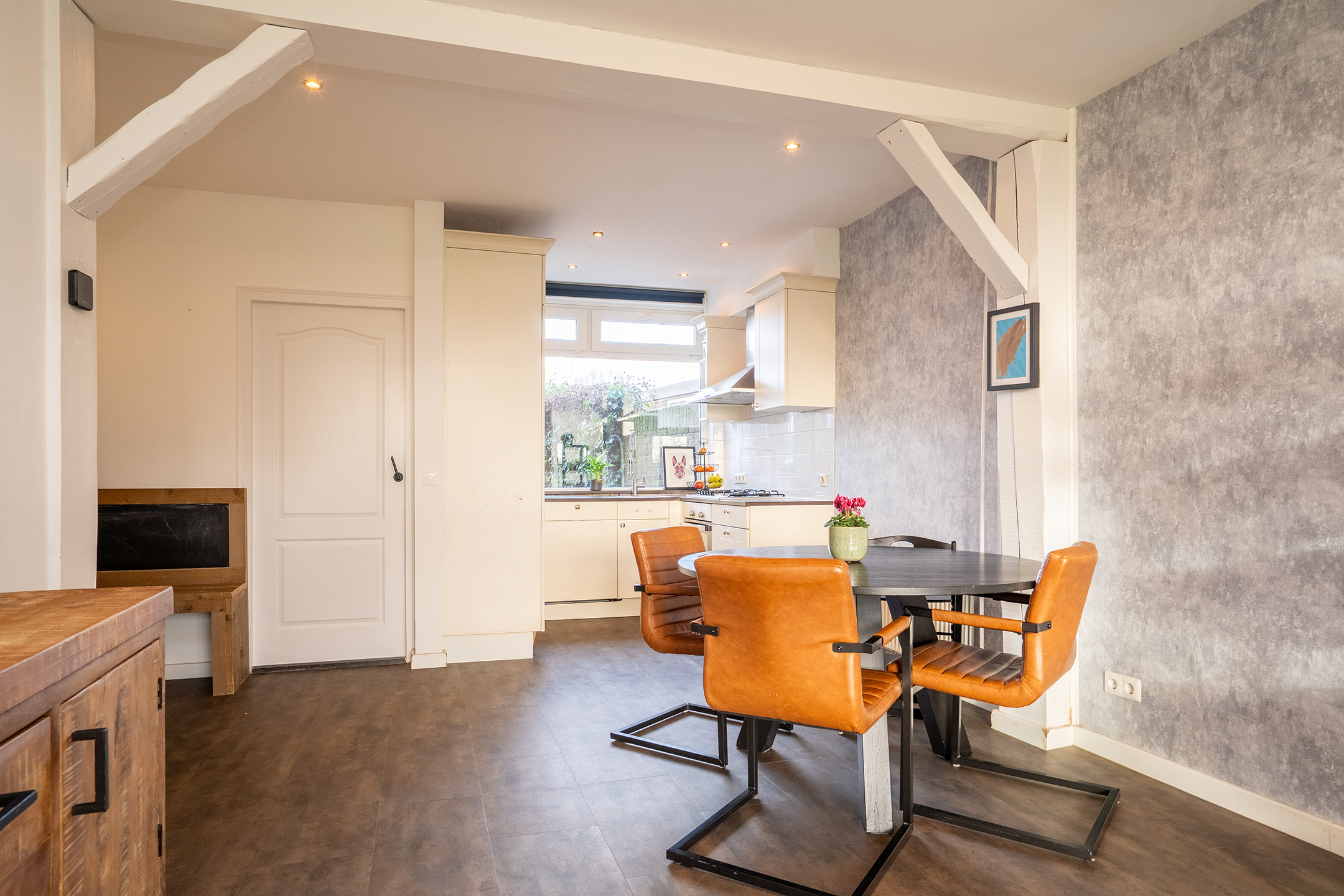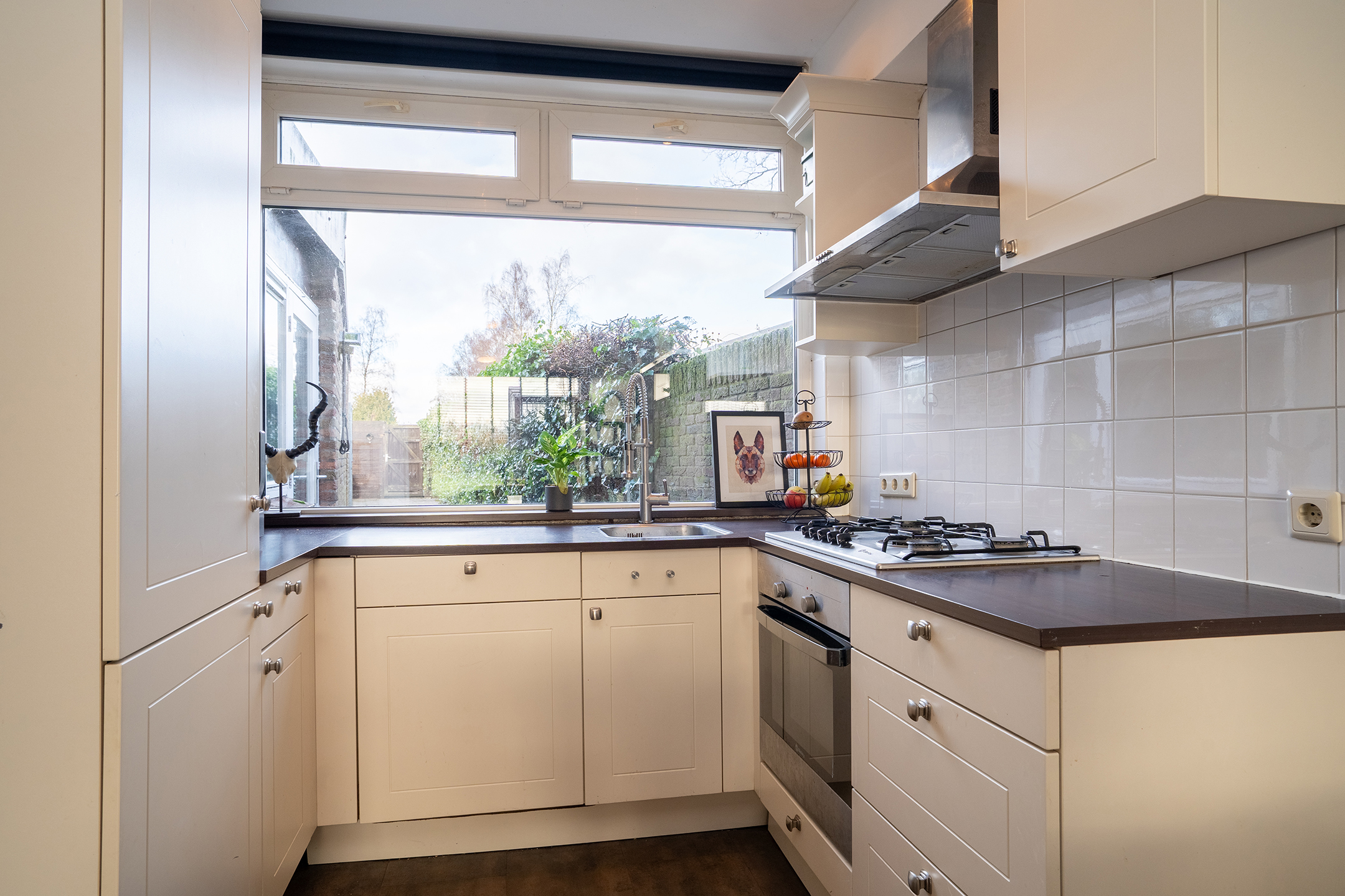 Aan de achterzijde van de woning bevindt zich de keuken, ingericht in een praktische opstelling. Hier kook je met uitzicht op de tuin. De keuken is onder andere voorzien van een vaatwasser, gasfornuis met afzuigkap, oven, koelkast en een vriezer.