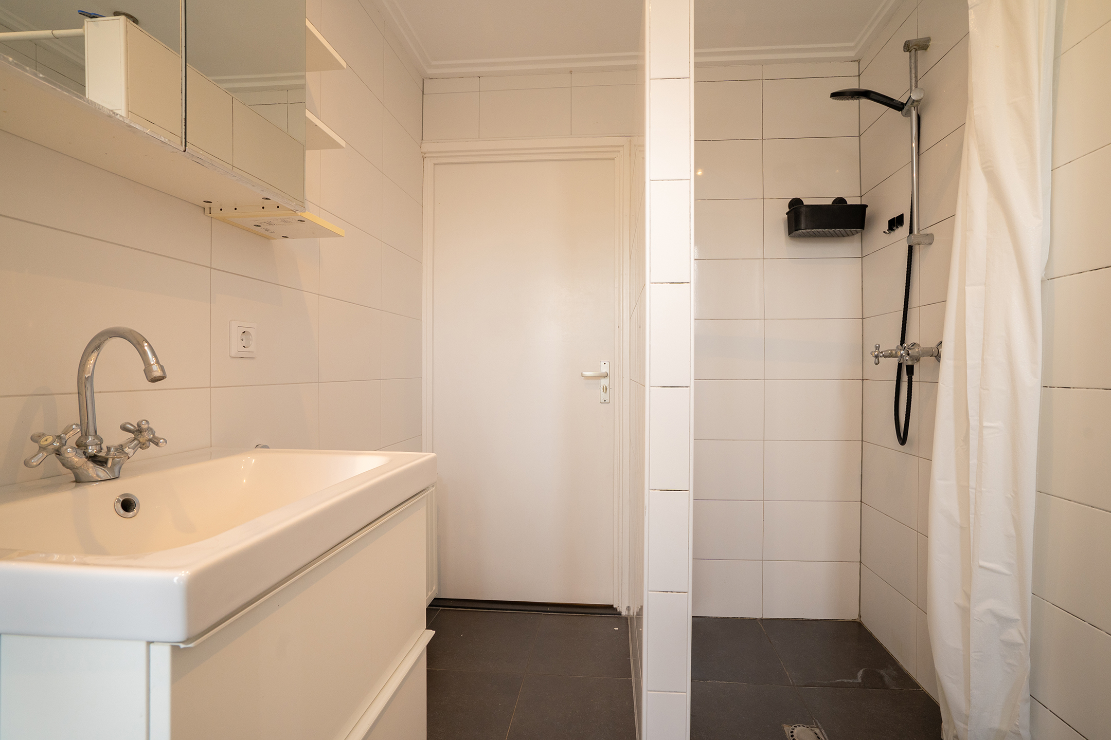 De badkamer is volledig betegeld en praktisch ingericht. Deze is voorzien van een toilet, een inloopdouche en een wastafelmeubel met opbergruimte. In de badkamer bevindt zich een raam en een separate deur naar buiten, wat zorgt voor natuurlijke ventilatie en extra daglicht.