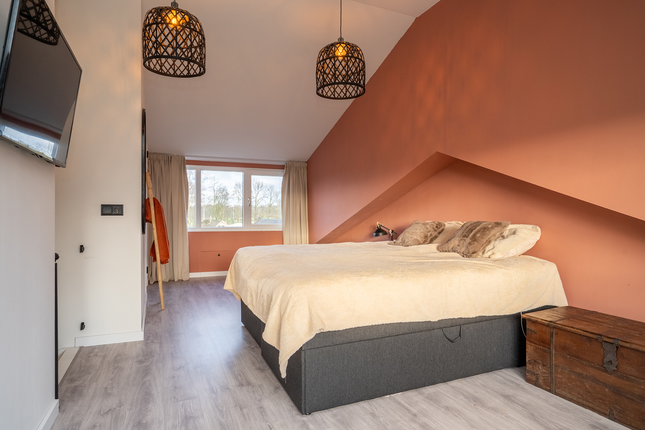 2e verdieping: Via de vaste trap bereik je de tweede verdieping. Deze verdieping is volledig aangepakt door het verhogen van de nok (muren omhoog en een nieuw dak), wat resulteert in een bijzonder ruime en sfeervolle master bedroom met een warme en verzorgde uitstraling.