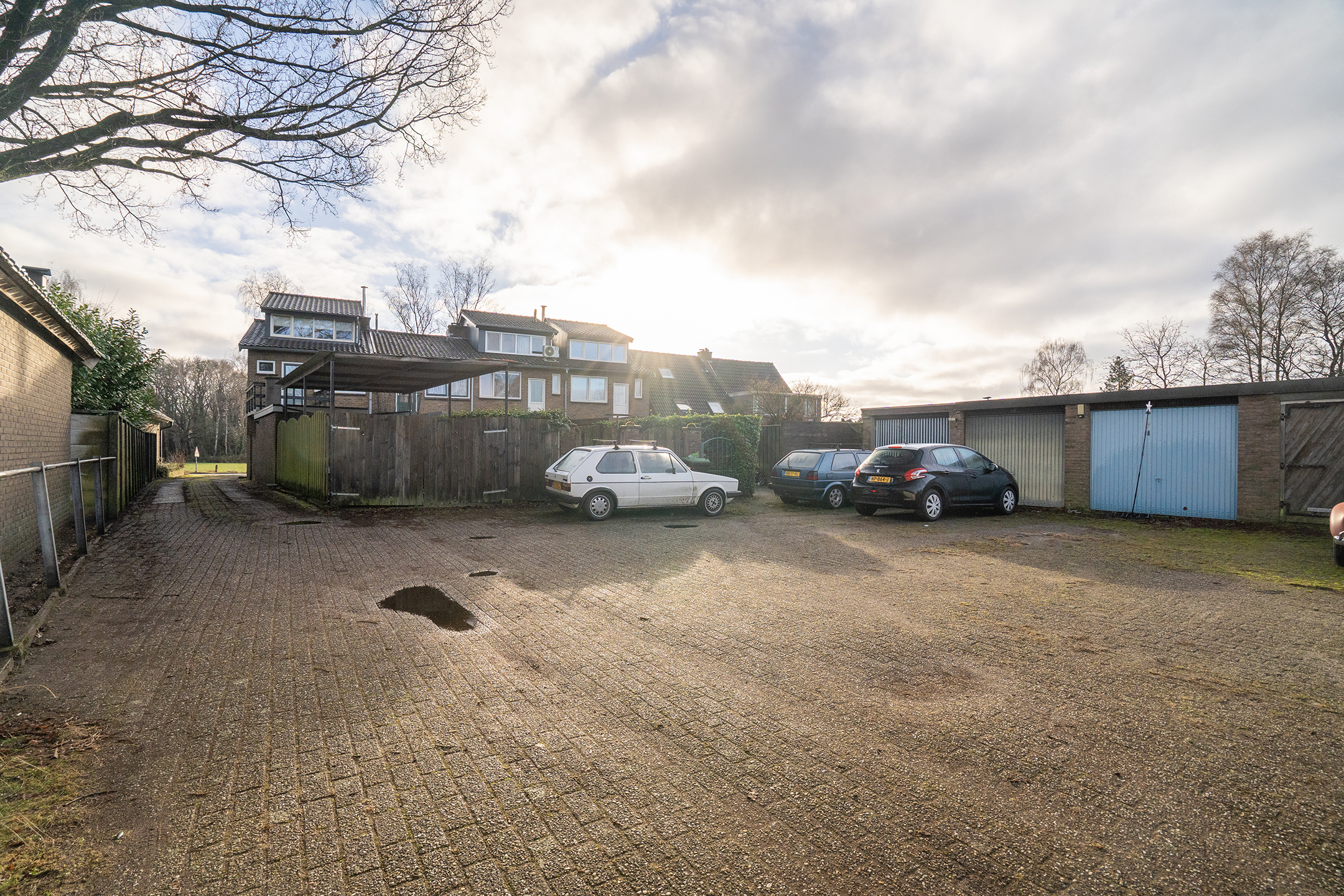 Achter deze poort bevinden zich de garageboxen. De garagebox is aan de achterzijde gelegen en bereikbaar via een gezamenlijke binnenplaats met weg. Achter de garage is ruimte om twee auto’s op eigen terrein te parkeren.