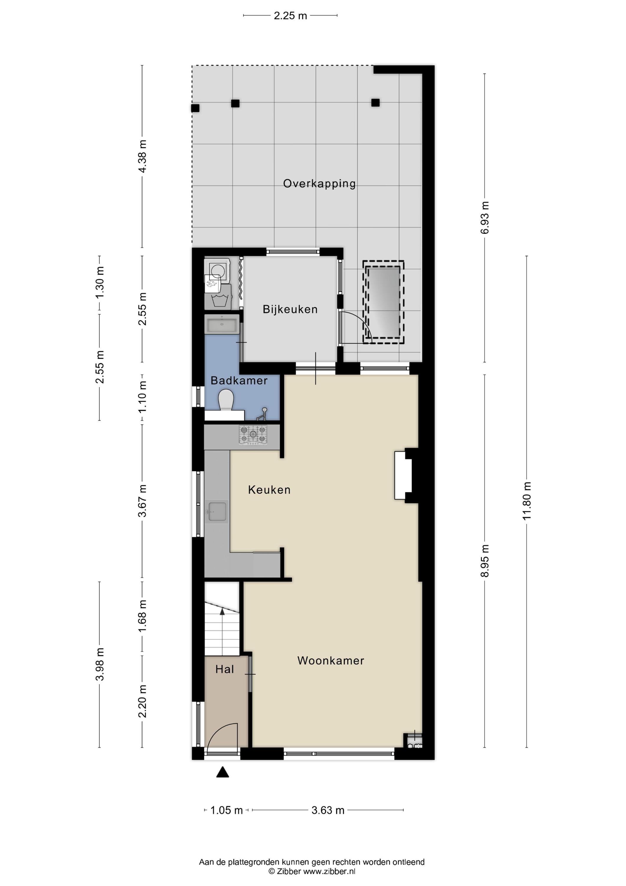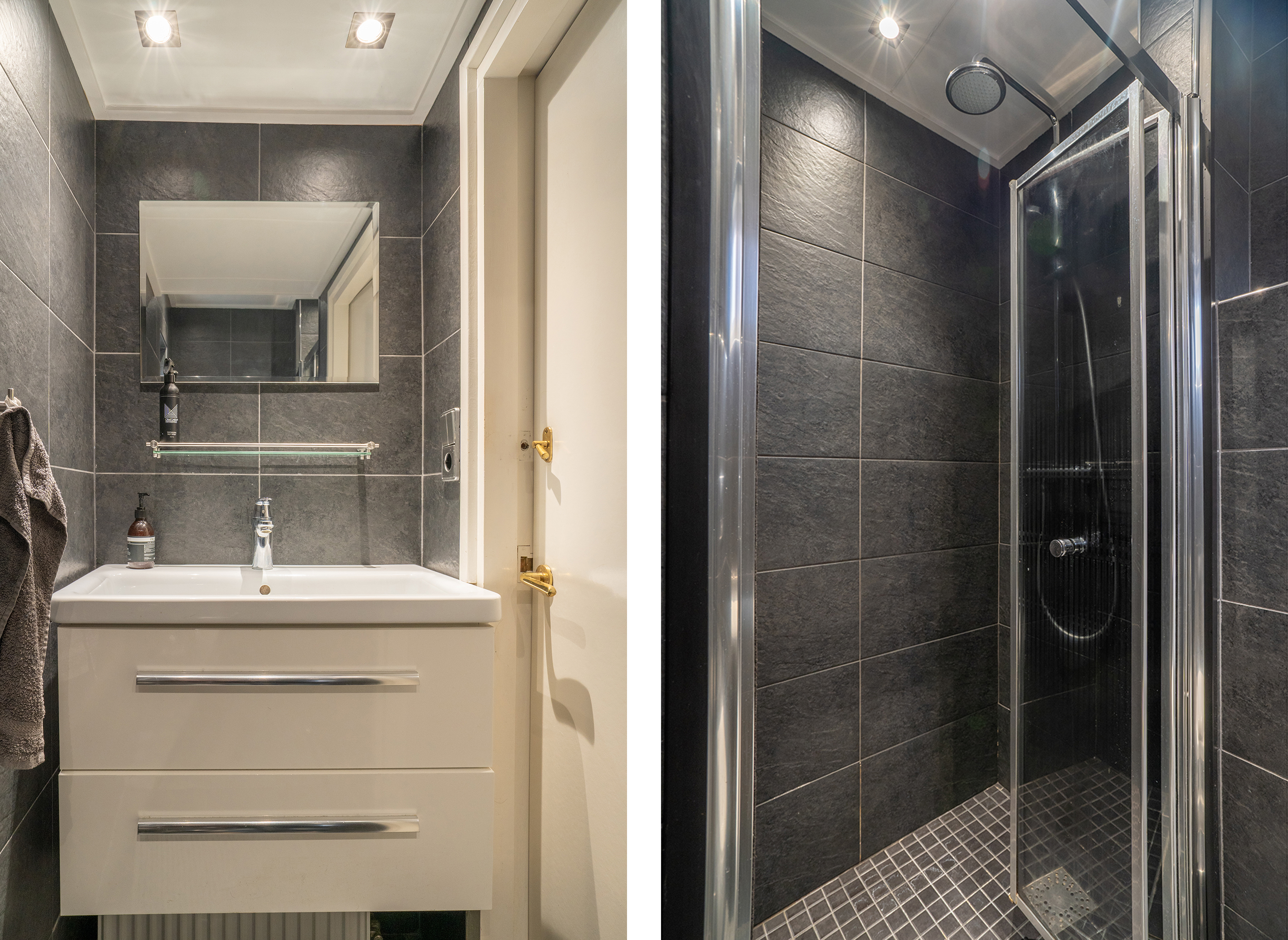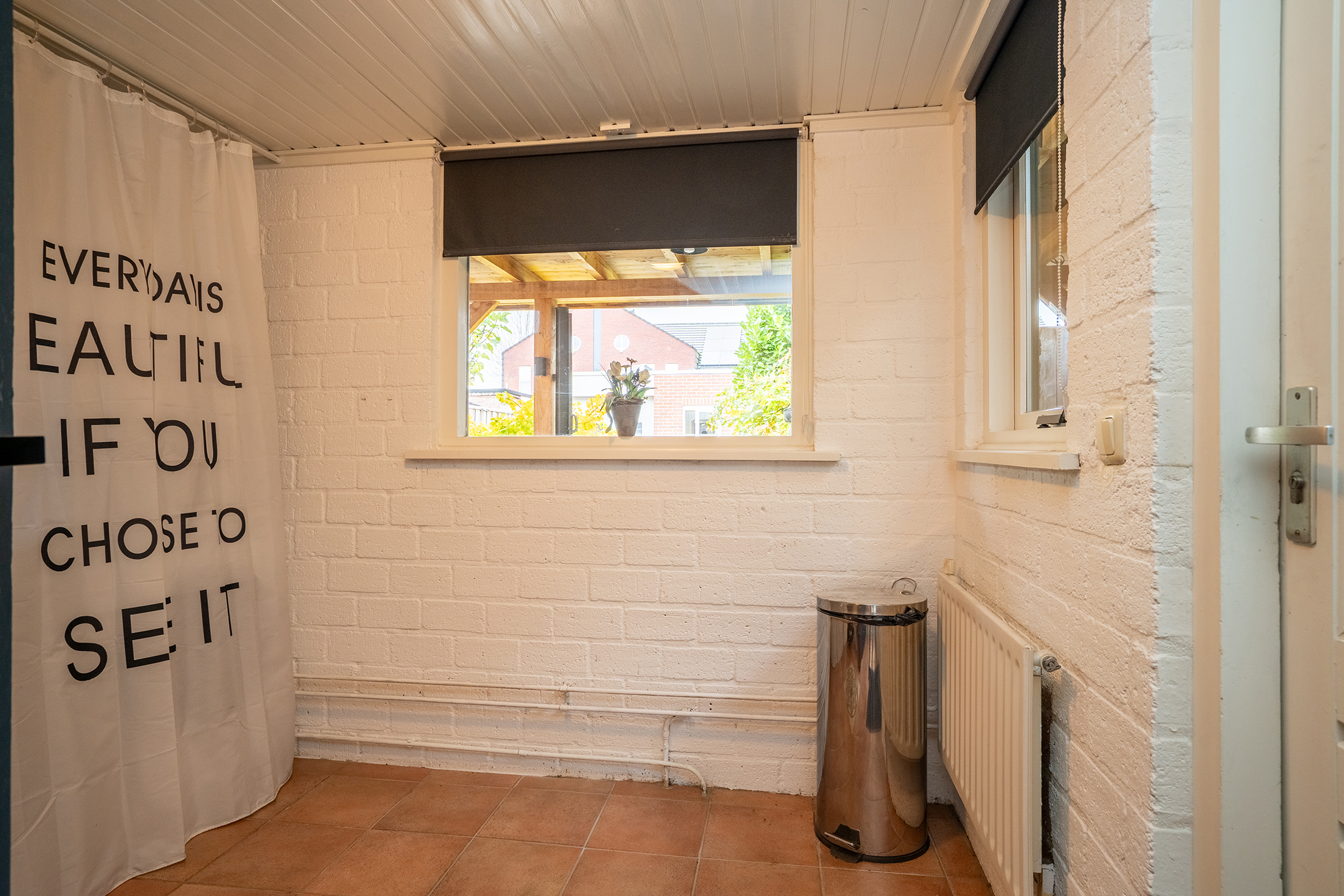 Achter de keuken bevindt zich de bijkeuken met witgoedaansluitingen en extra bergruimte. Vanuit hier heb je toegang tot de volledig betegelde badkamer, uitgerust met een douche, wastafel en toilet. Ook kun je via de bijkeuken direct naar buiten, waar je meteen onder de overkapping stapt.