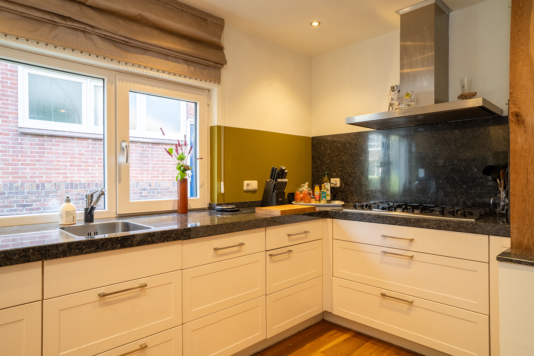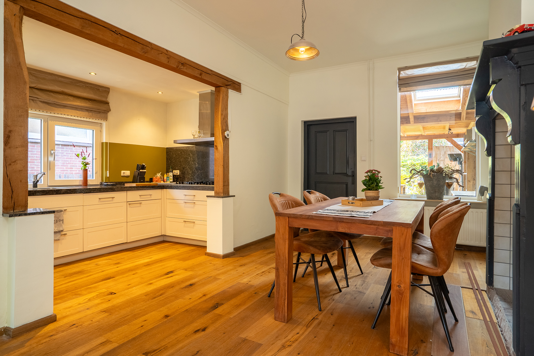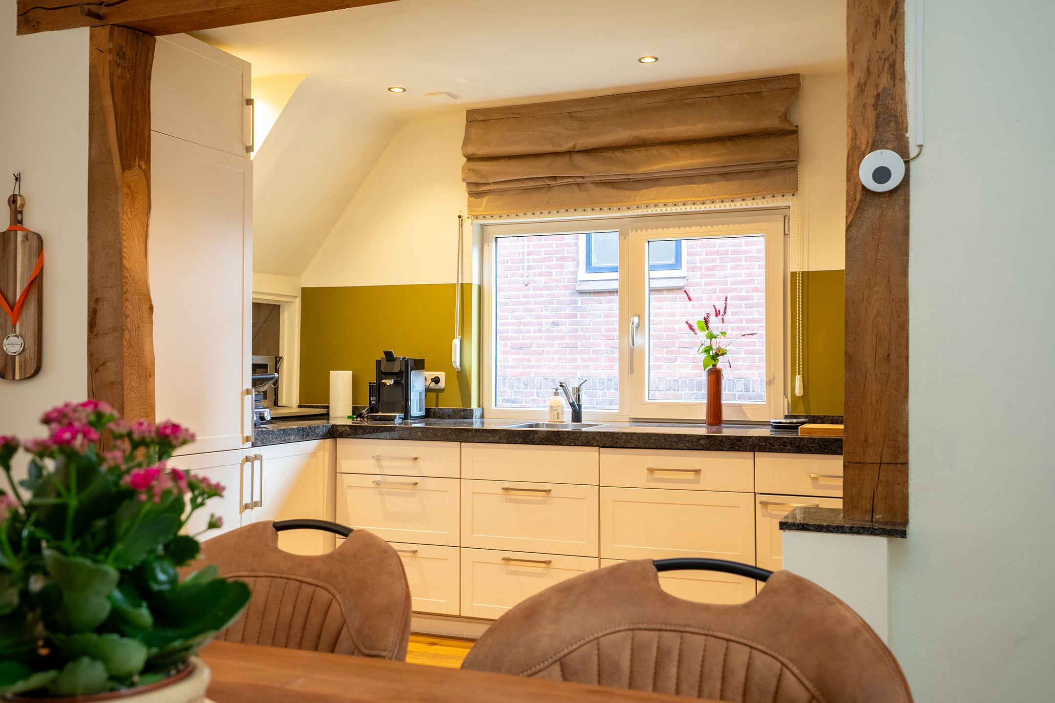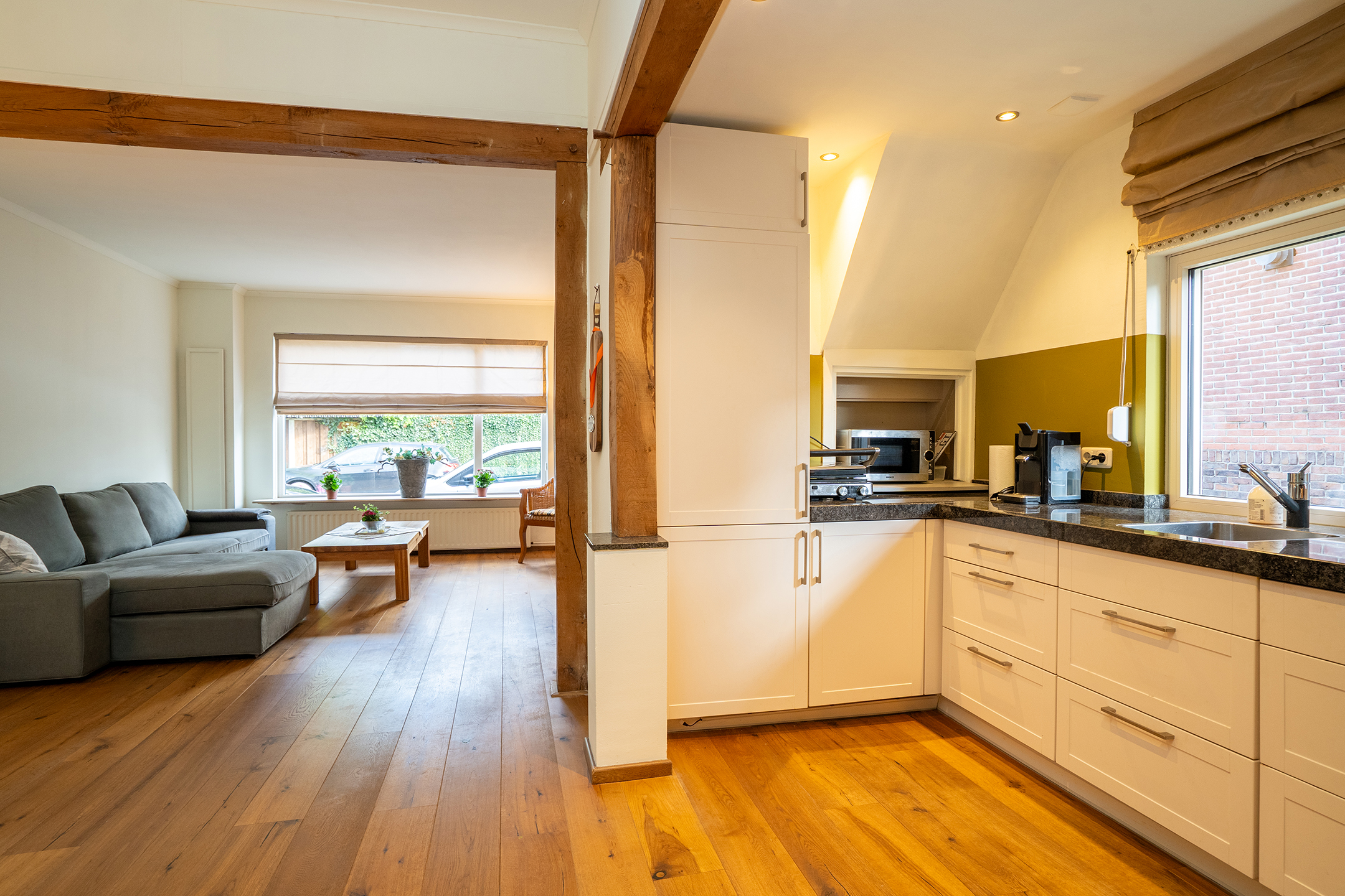 De open keuken is uitgevoerd in lichte kleuren met een donker werkblad en voorzien van onder andere een gasfornuis met afzuiging en een koelkast. Dankzij de praktische opstelling is er veel werk- en opbergruimte. De authentieke schouw vormt hier een echte eyecatcher en geeft de ruimte extra charme. Een heerlijke plek waar koken, gezelligheid en samenzijn samenkomen. Vanaf de eettafel blijf je altijd in contact met de woonkamer.