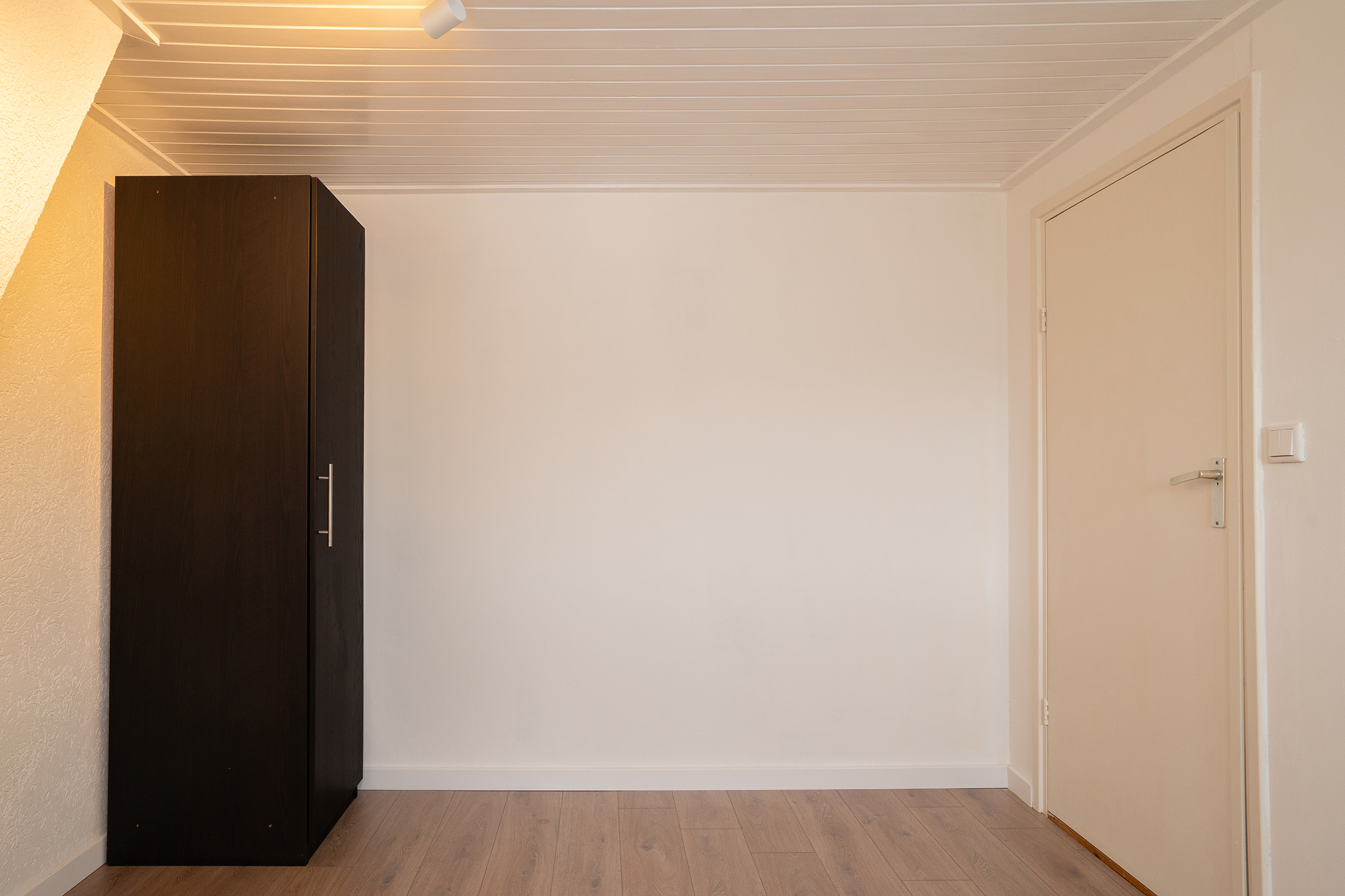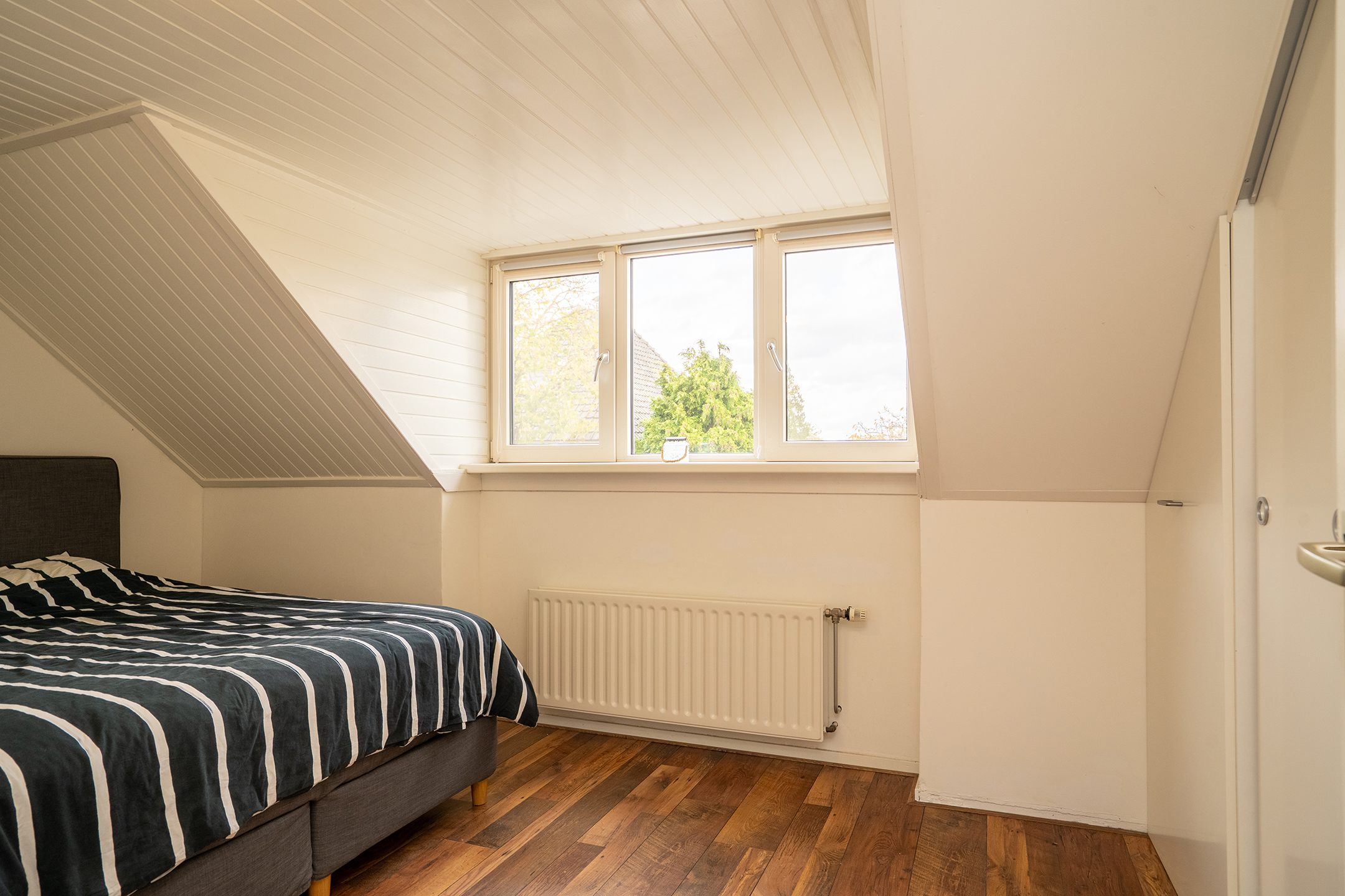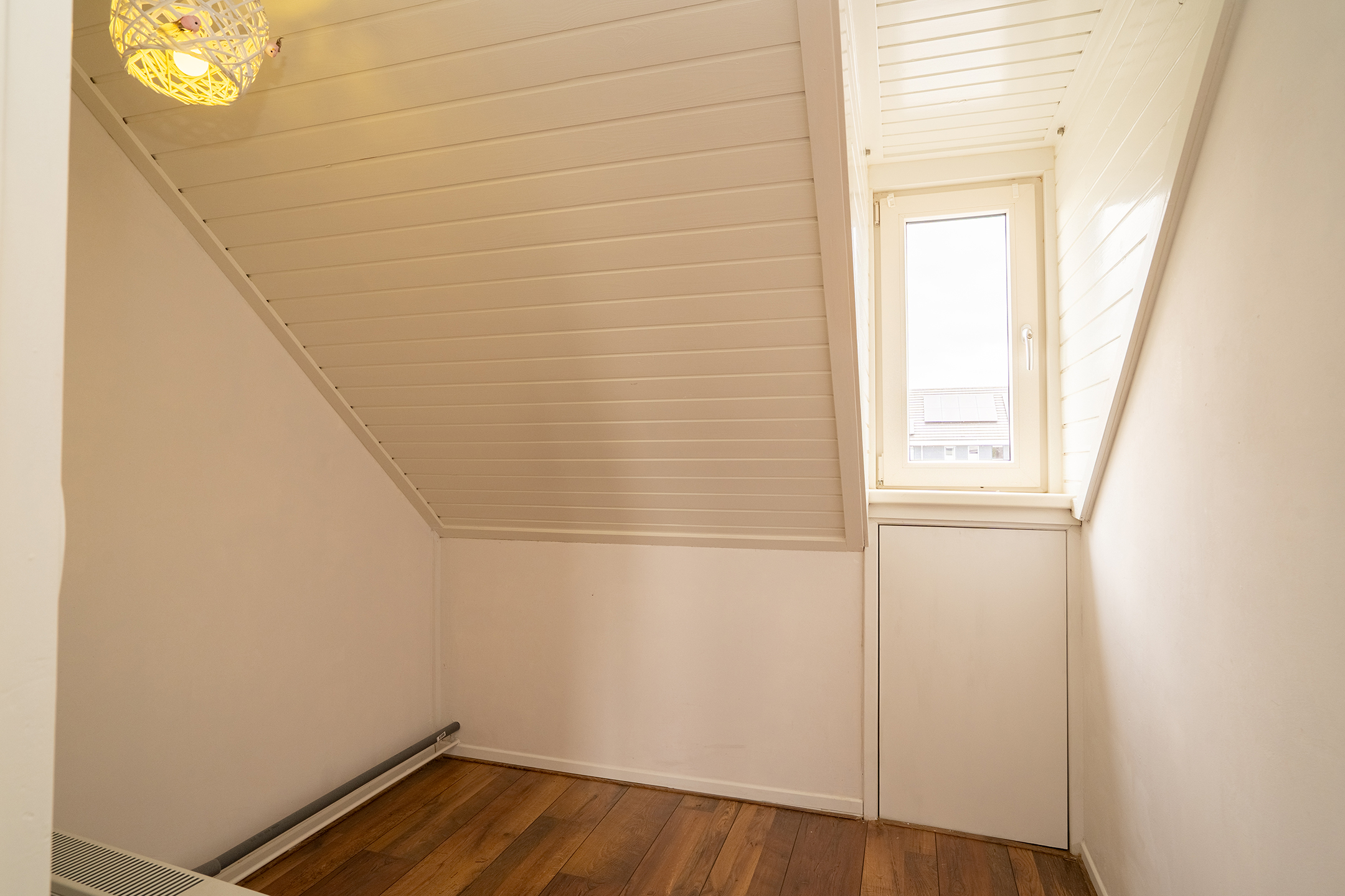 1e verdieping: Vanaf de overloop zijn drie slaapkamers bereikbaar. Alle kamers zijn netjes afgewerkt met lichte wanden en een laminaatvloer. De grootste slaapkamer ligt aan de voorzijde van de woning en beschikt over praktische inbouwkasten. Aan de achterzijde liggen twee slaapkamers: één is eveneens ruim en ideaal als slaapkamer, de derde kamer is kleiner van formaat, maar prima geschikt als werkkamer, opbergruimte of kinderkamer. Dankzij de dakkapellen aan zowel de voor- als achterzijde is er volop lichtinval.