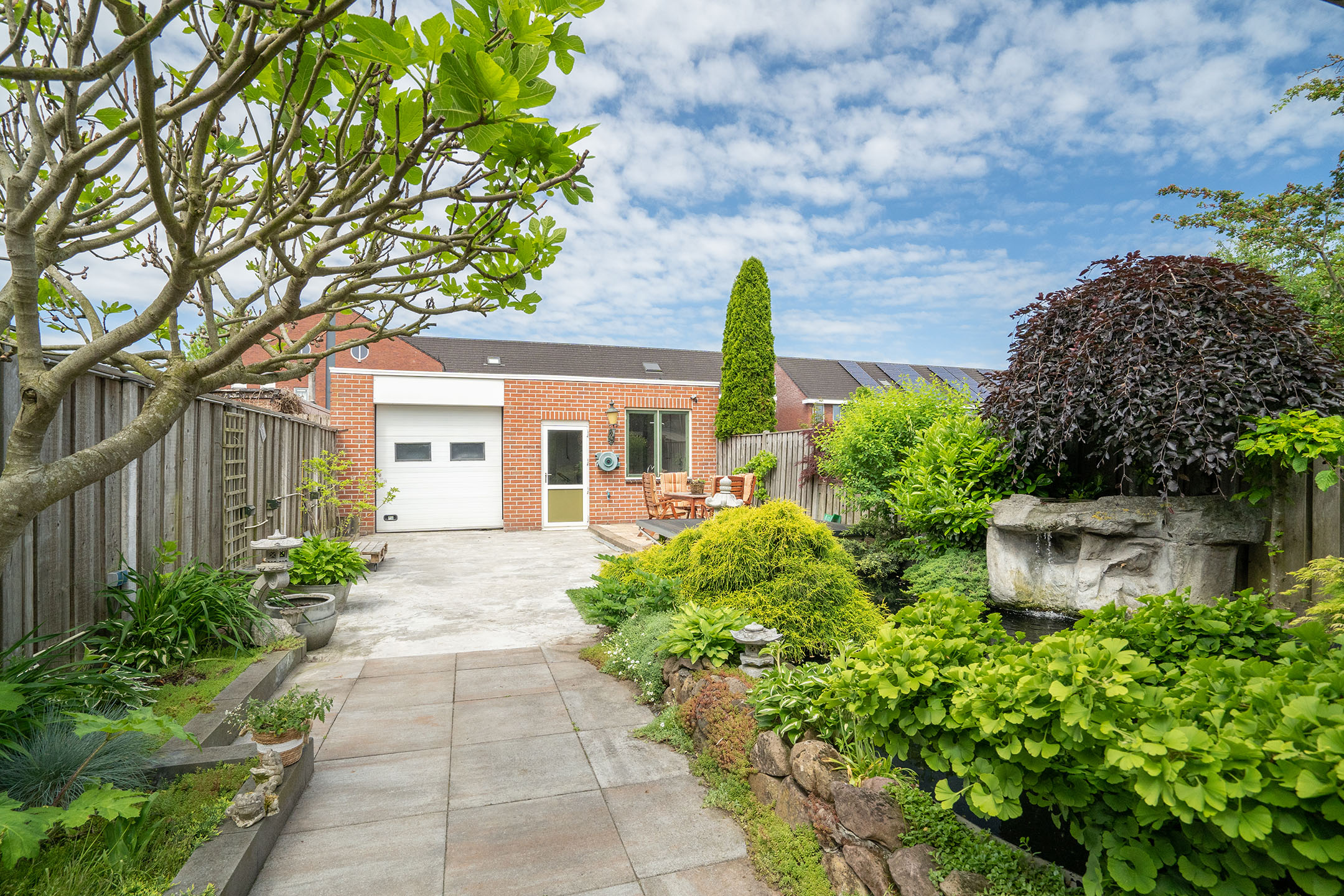 De tuin is bereikbaar via de poort aan de zijkant van de woning.