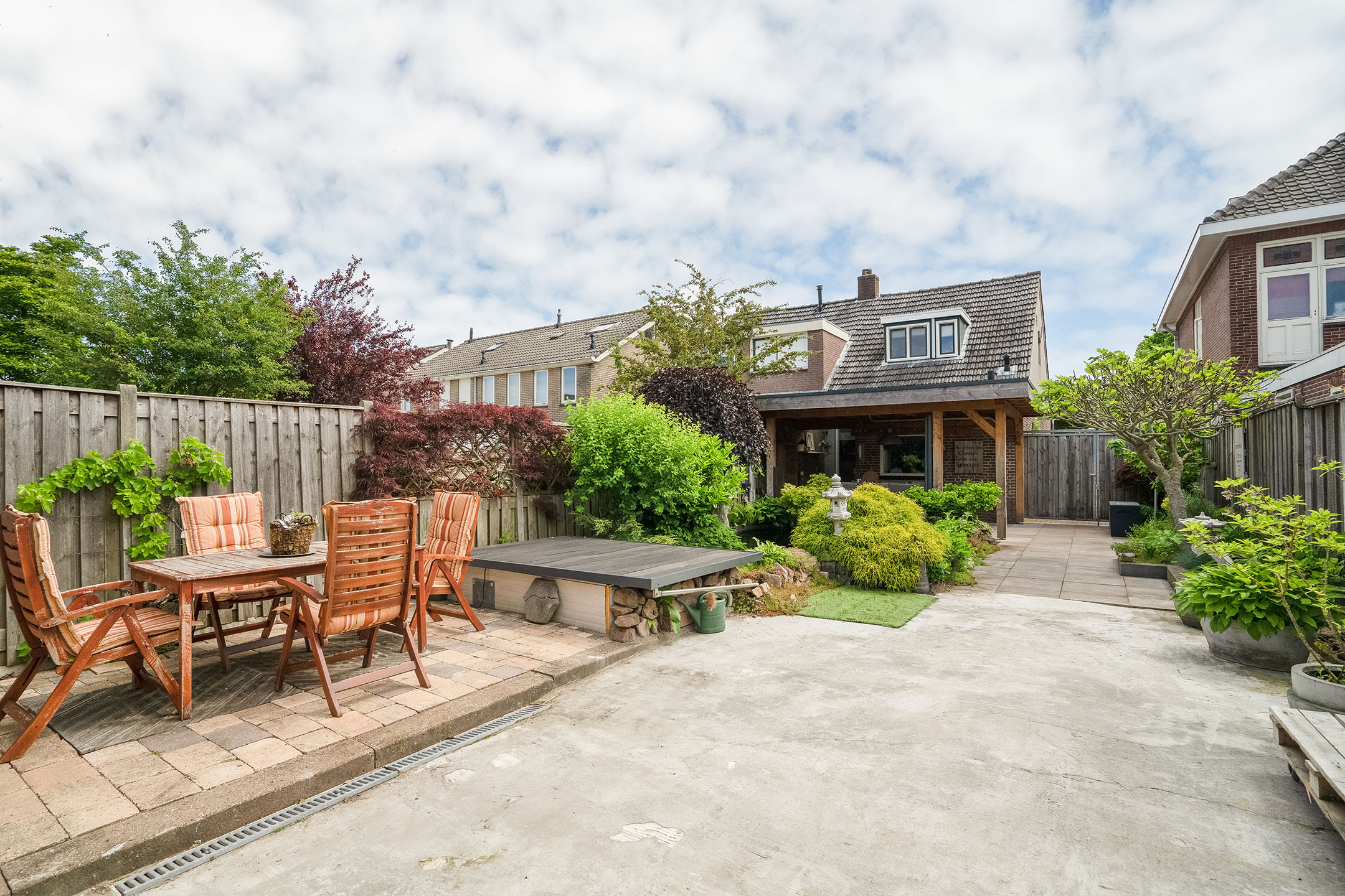 Tuin: De tuin is een heerlijke verrassing achter de woning. Via de bijkeuken stap je direct onder de ruime overkapping, waar je in alle seizoenen fijn kunt zitten. De overkapping is stevig uitgevoerd met een houten constructie en biedt ruimte voor een grote eettafel of loungeset. Dankzij de beschutte ligging geniet je hier in alle rust van privacy.