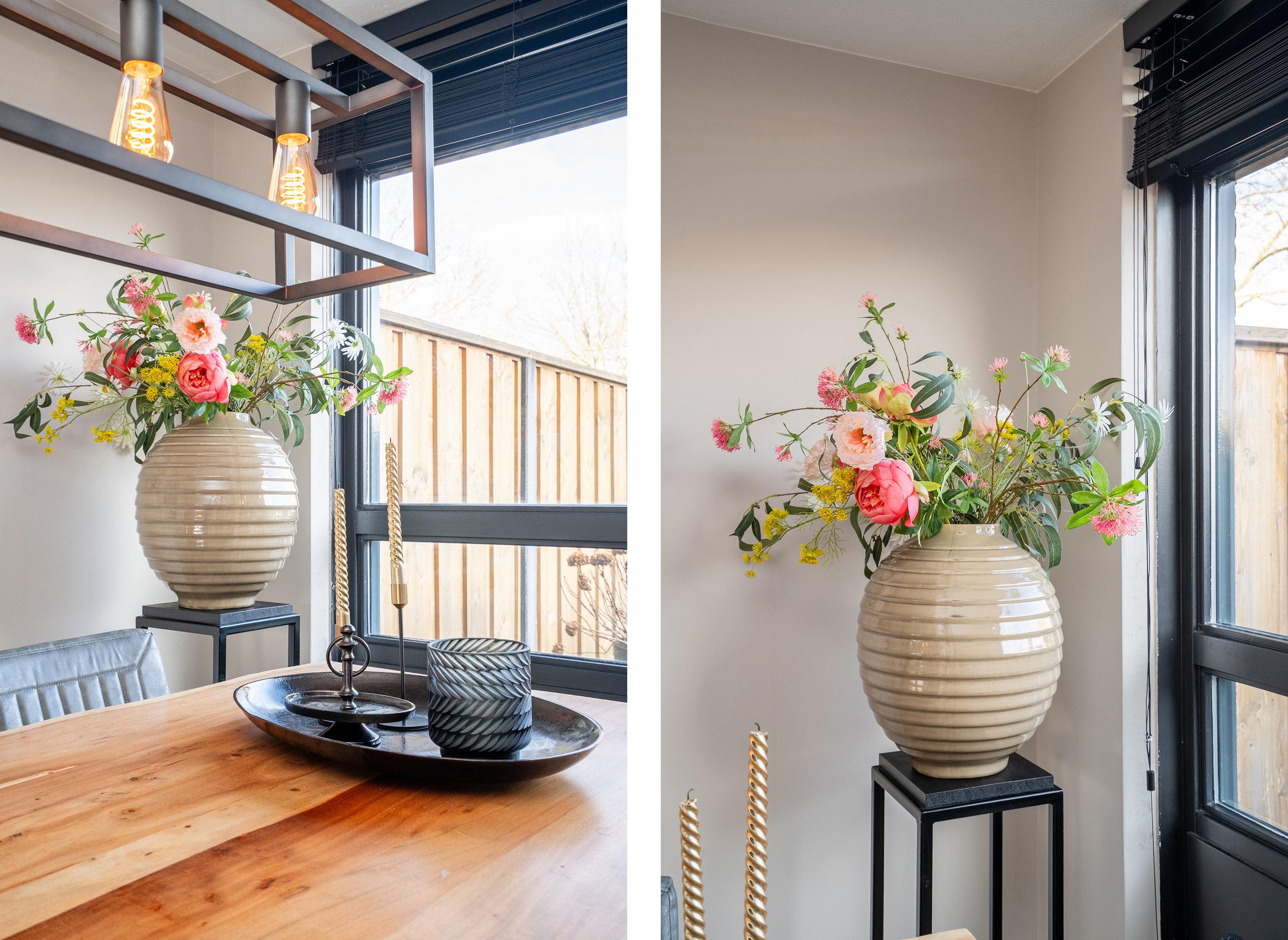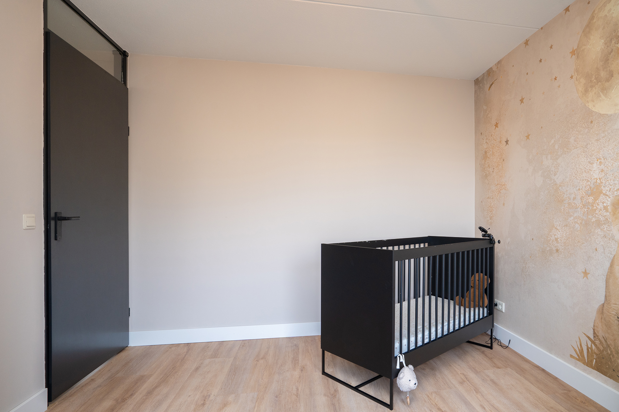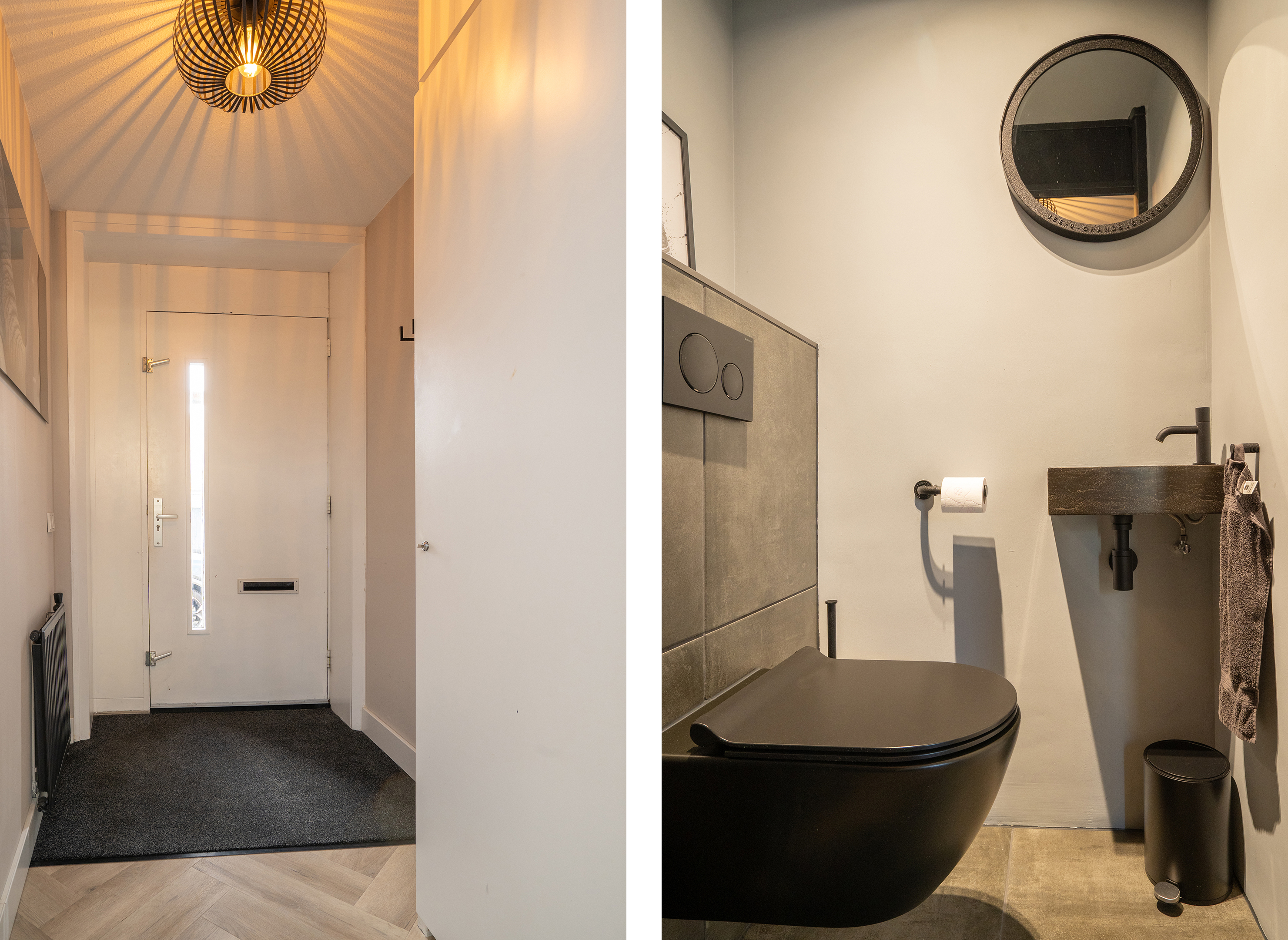 Centraal in de woning bevindt zich een tussenhal met de trapopgang naar de eerste verdieping en het moderne toilet, voorzien van een hangcloset en fontein. De zwarte accenten geven het geheel een luxe uitstraling.