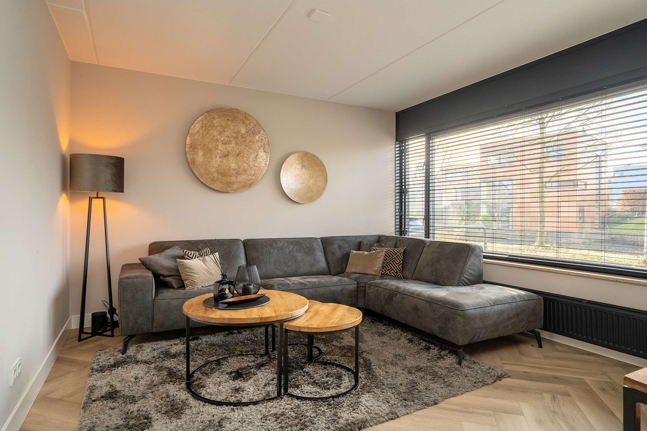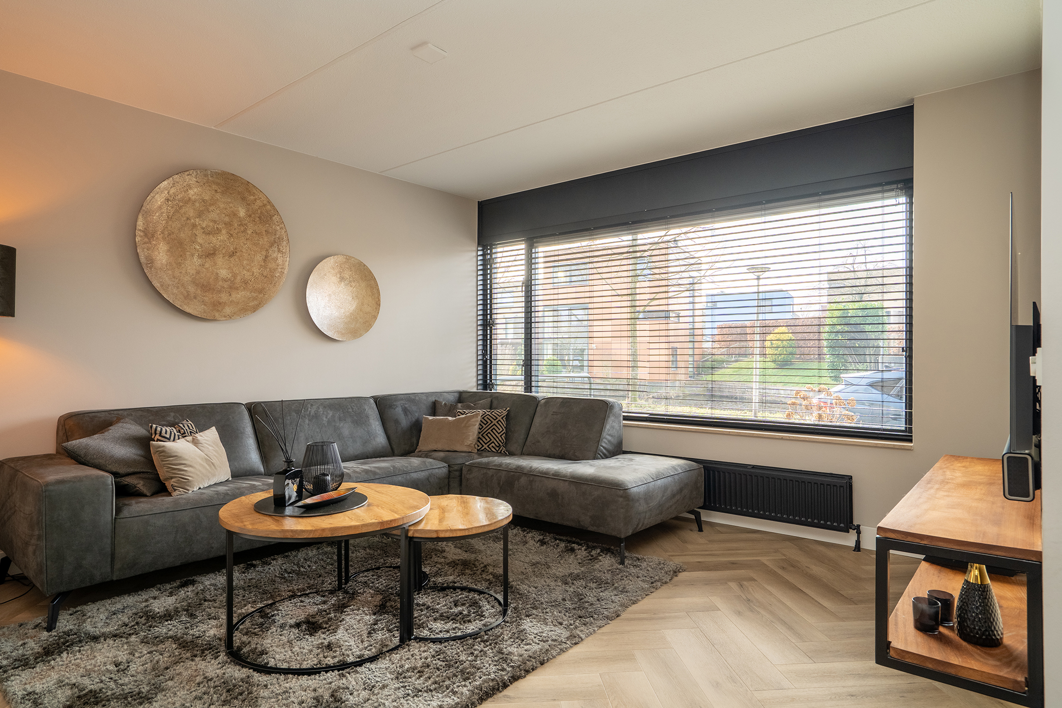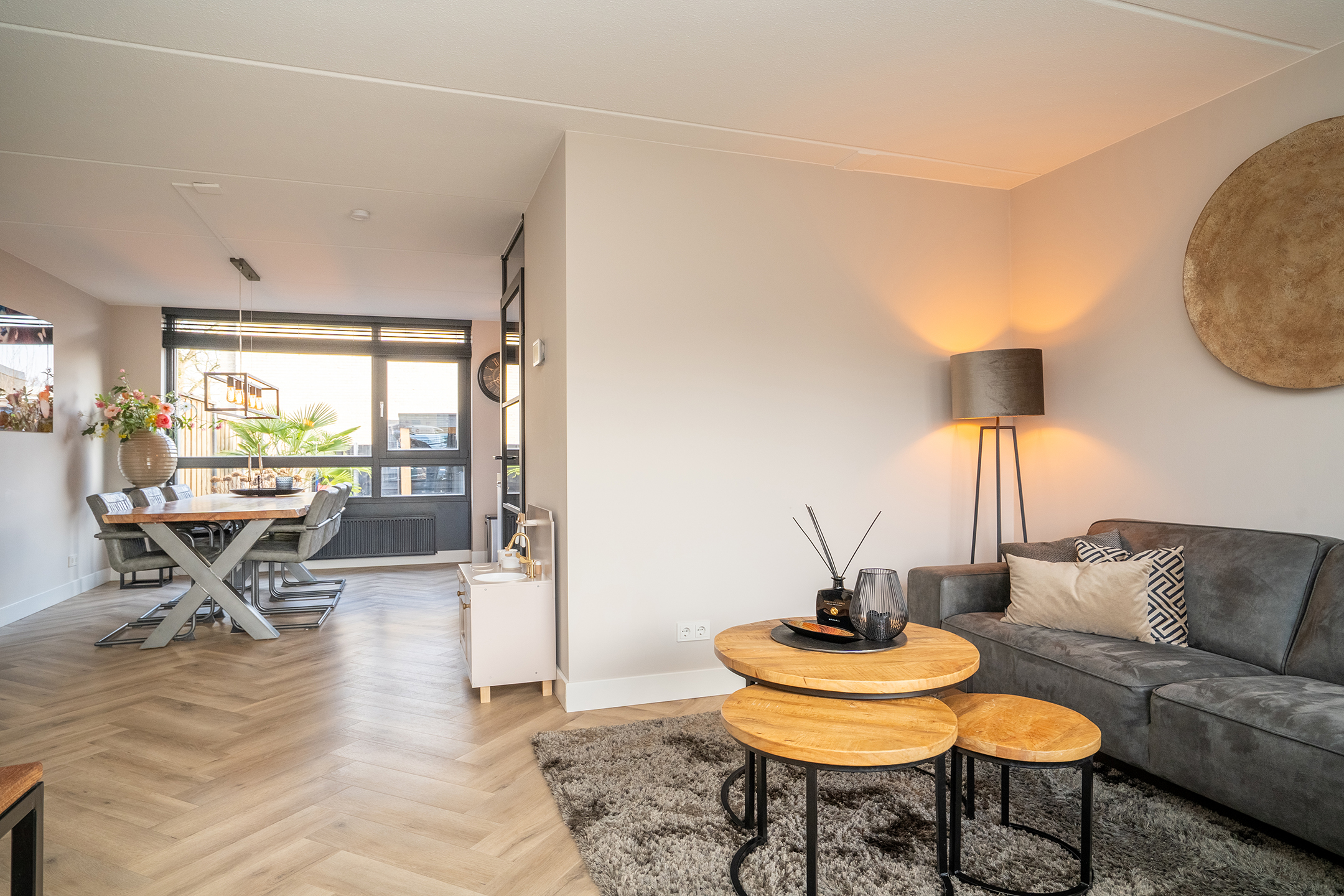 De ruime woonkamer is gelegen aan de voorzijde van de woning en kenmerkt zich door de grote raampartij, die zorgt voor veel daglicht.