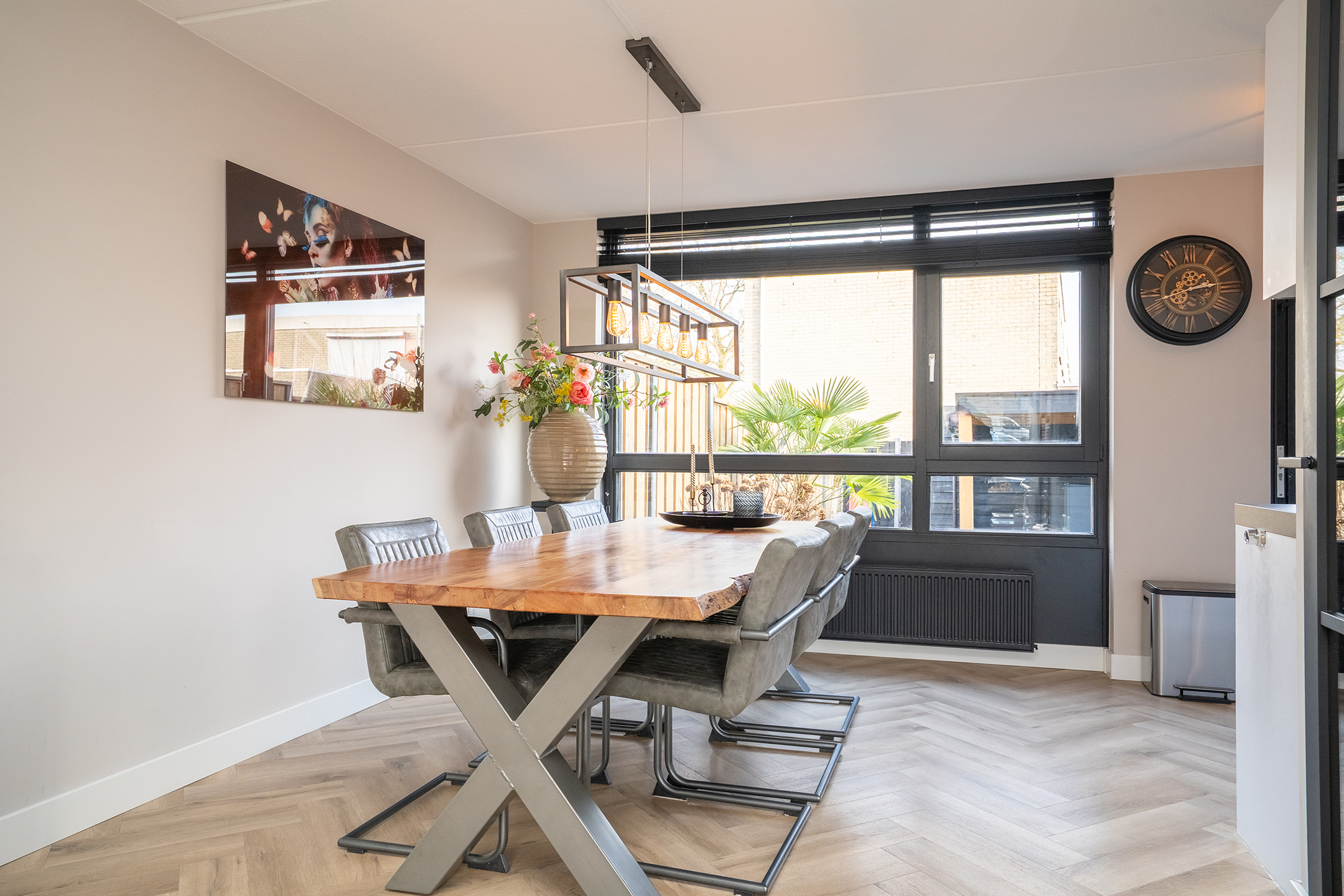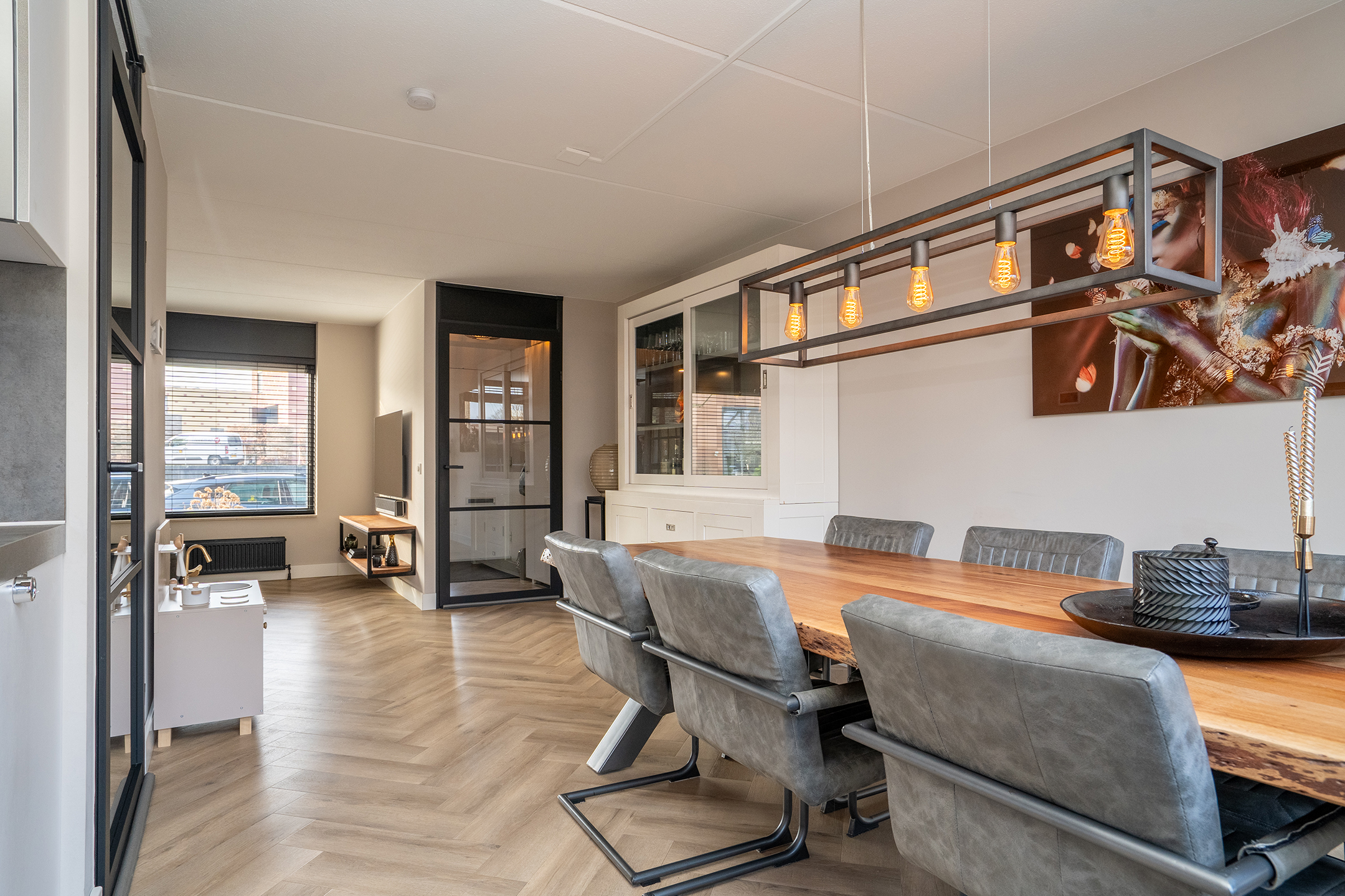 Begane grond: Via de trap bereik je de voordeur en stap je binnen in een verzorgde entree met garderoberuimte en meterkast. Vanuit hier loop je door naar de leefruimte, waar direct de strakke afwerking en de prachtige visgraatvloer in het oog springen.