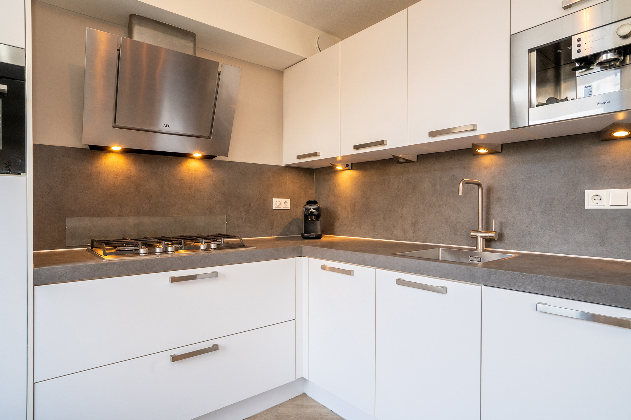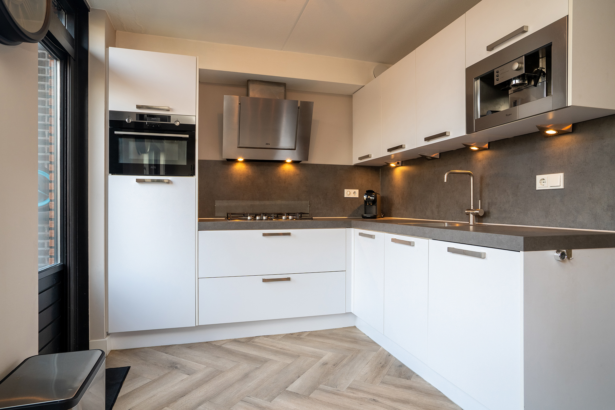 Aan de achterzijde bevindt zich de moderne open keuken, uitgevoerd in een lichte kleurstelling en volledig vernieuwd in 2017. De keuken is voorzien van diverse inbouwapparatuur, waaronder een gasfornuis met wandschouw, vaatwasser, oven, magnetron en koelkast. Dankzij de praktische opstelling en het directe contact met de eetkamer is dit een fijne plek om te koken en samen te komen. Vanuit de keuken is er via de achterdeur eveneens toegang tot de tuin.