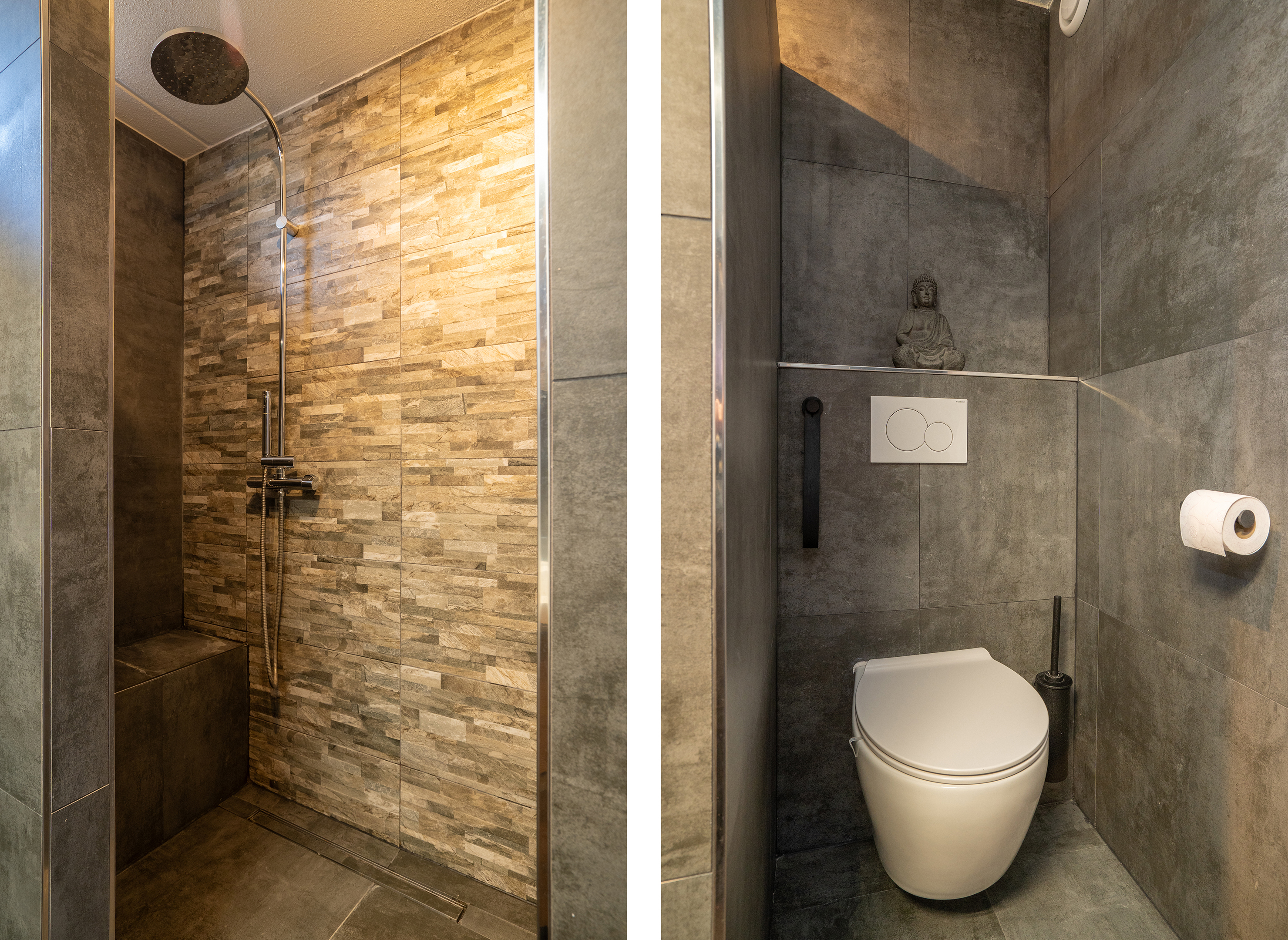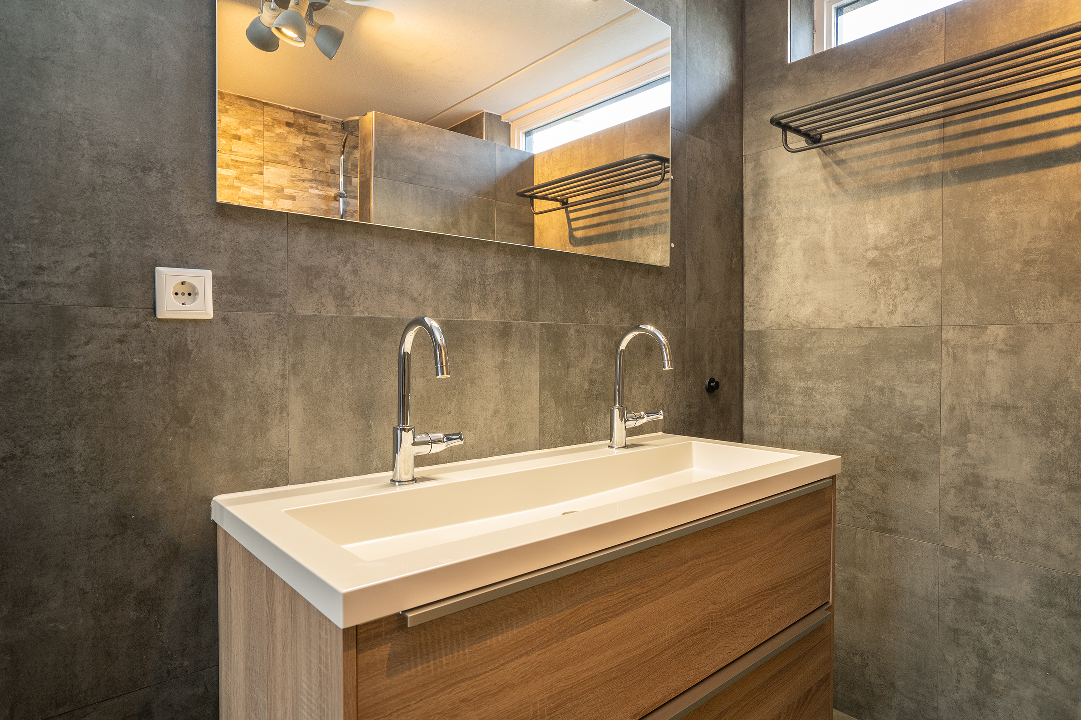 1e verdieping: Vanaf de overloop zijn twee ruime slaapkamers (voorheen 3) en de moderne badkamer bereikbaar. De badkamer is in 2017 volledig vernieuwd en uitgevoerd in een stijlvolle, eigentijdse uitstraling. De ruimte is volledig betegeld en beschikt over een comfortabele inloopdouche met zitbankje, handdouche én stortdouche. Daarnaast is de badkamer voorzien van een hangend toilet en een wastafelmeubel met dubbele lades. Kortom, een heerlijke, complete badkamer waar comfort en design samenkomen.