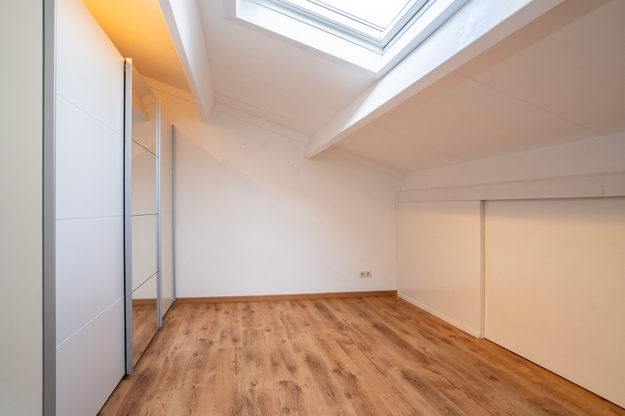 2e verdieping: Via een vaste trap bereik je de verrassend ruime tweede verdieping. Deze verdieping is praktisch ingedeeld en bestaat uit twee delen. Aan de ene zijde bevindt zich een ruime slaapkamer met veel daglicht. De andere ruimte is ingericht als bergruimte en biedt plaats aan de wasmachine en droger, met daarnaast een kastenwand voor extra opslag.