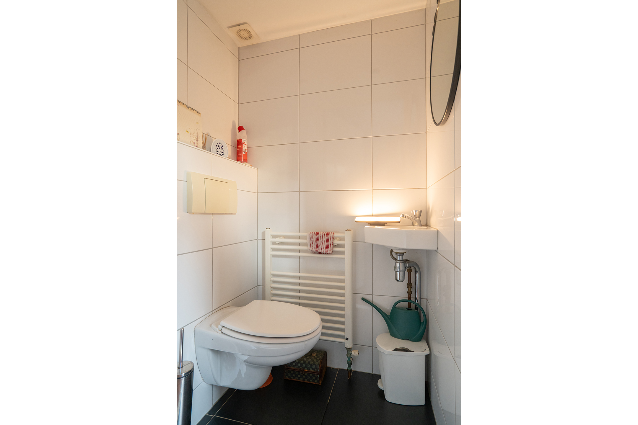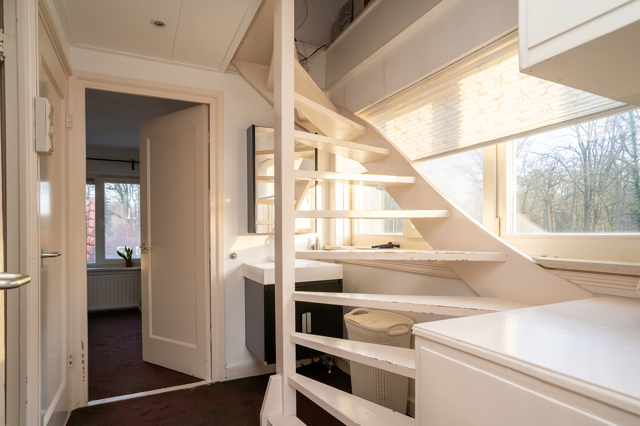 1e Verdieping: Overloop, toilet, wastafel en twee slaapkamers.
