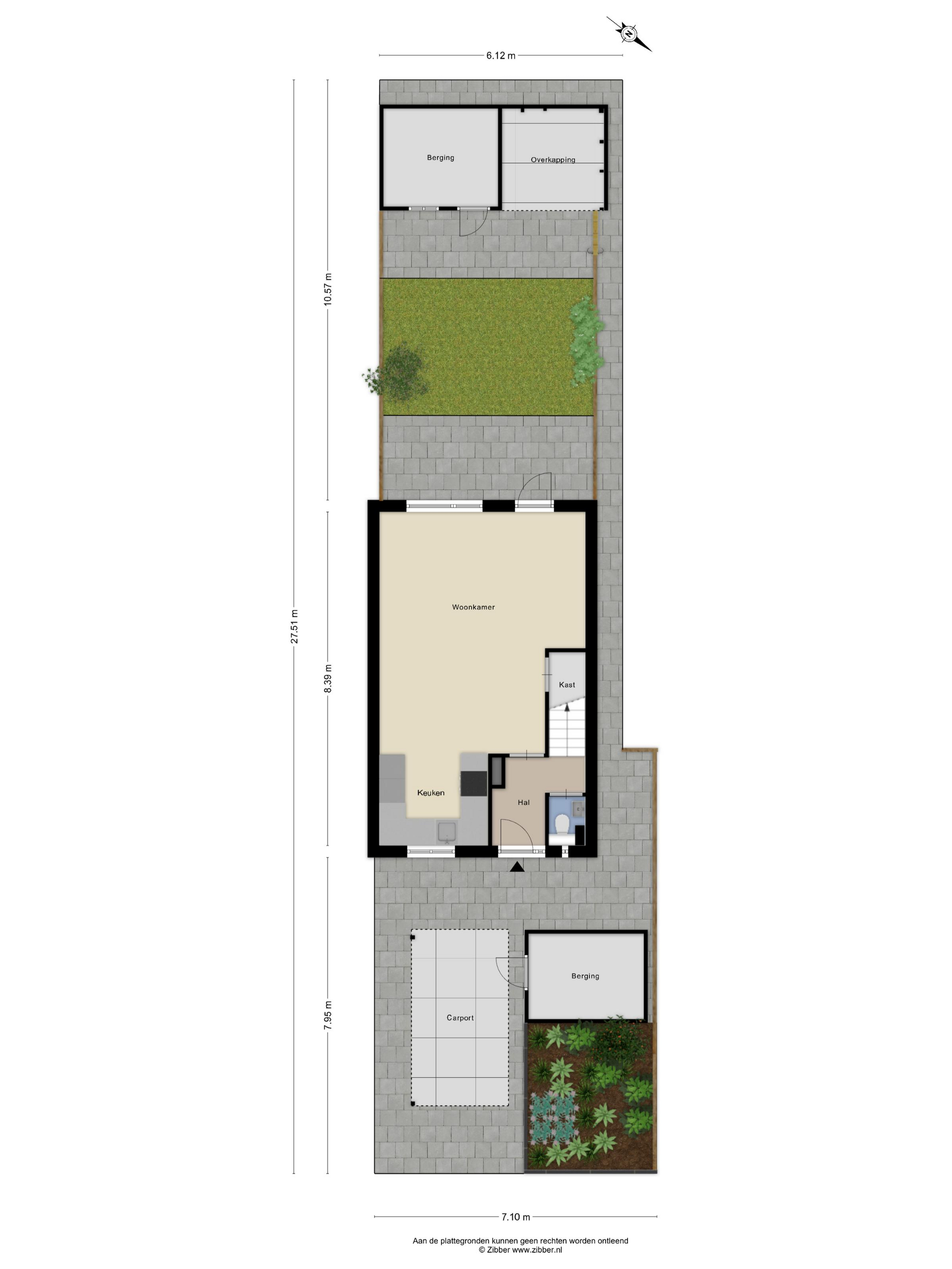 Begane grond: Via de eigen oprit met carport bereik je de voordeur van de woning.