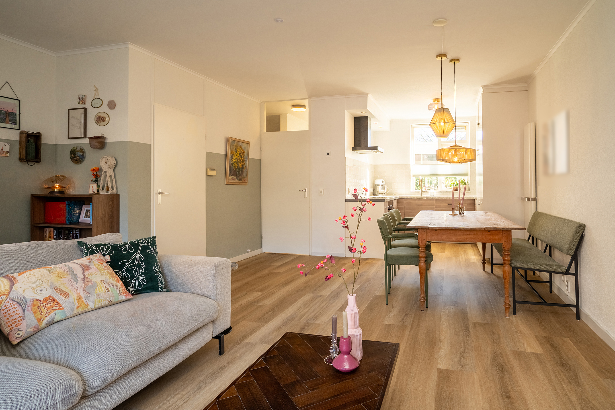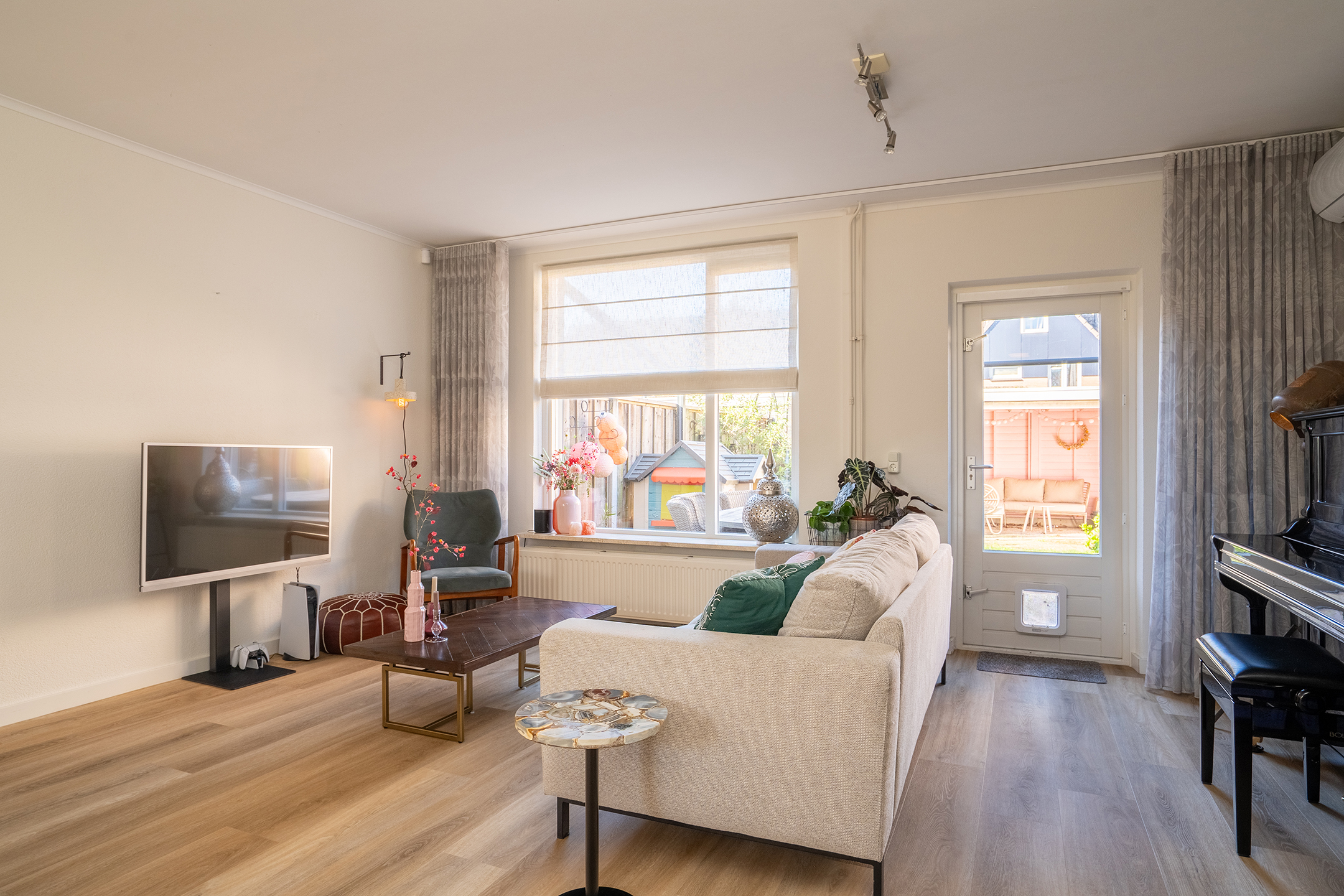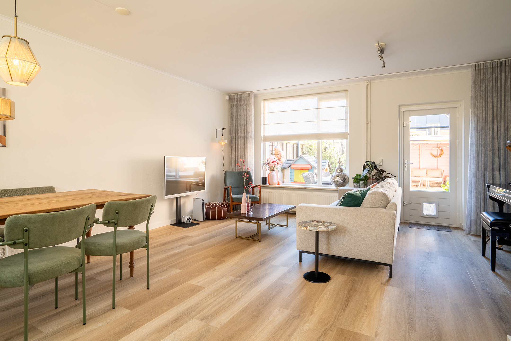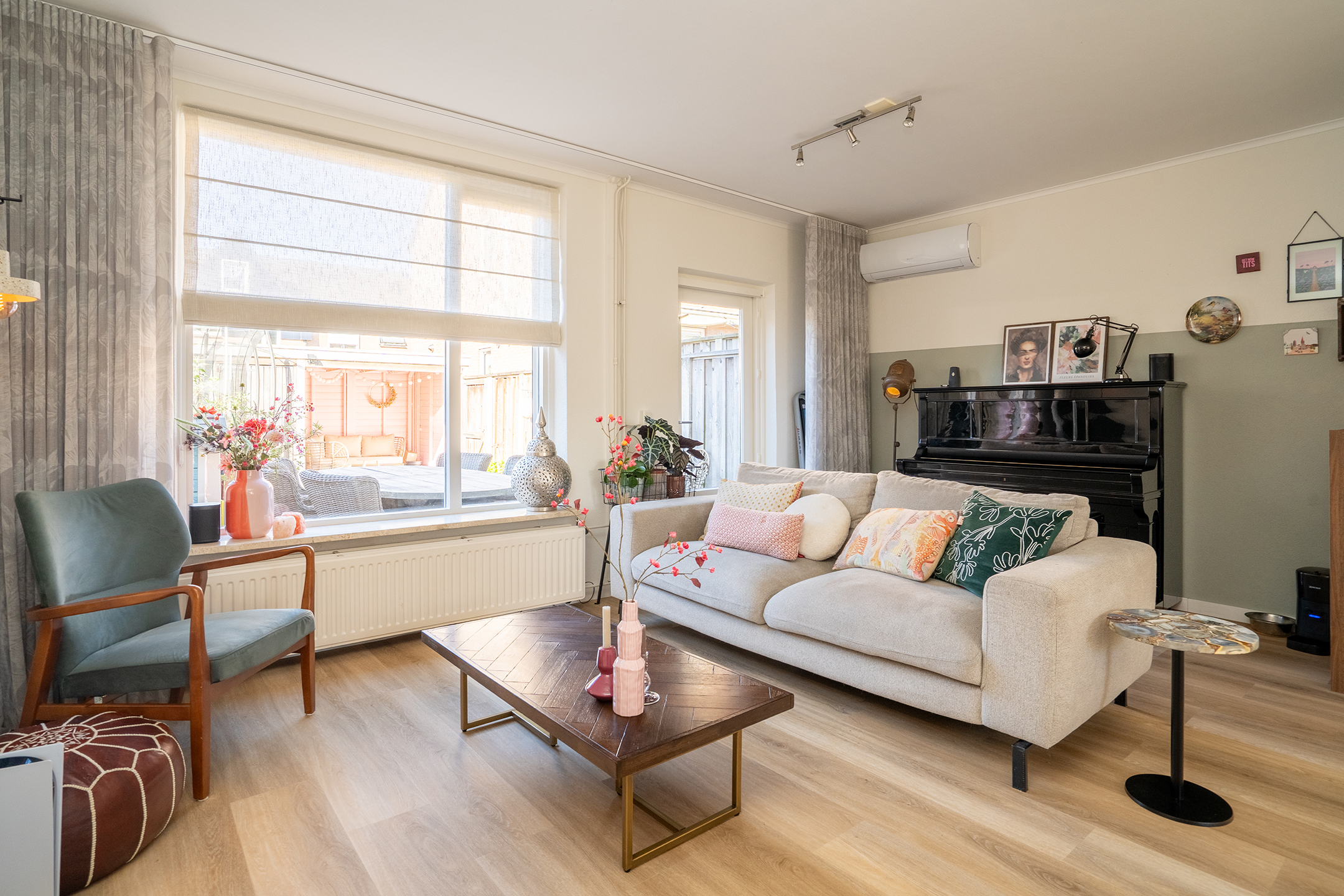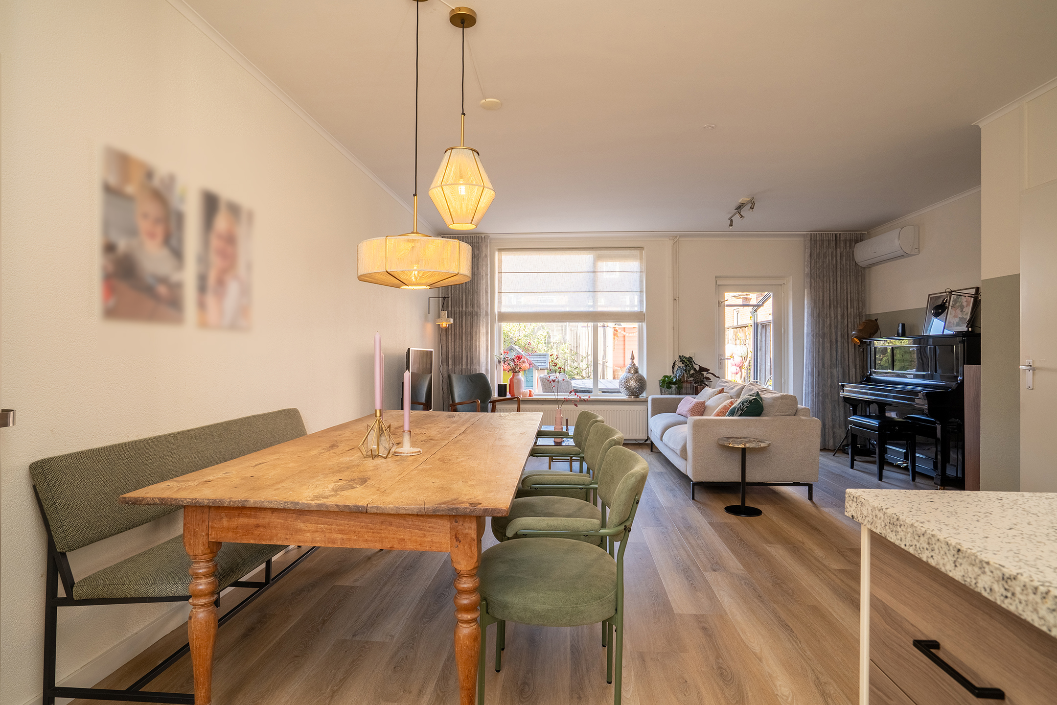 De woonkamer is heerlijk licht dankzij de raampartijen aan de achterzijde en biedt volop ruimte voor een gezellige zithoek en eethoek. De open indeling zorgt voor een fijne verbinding tussen wonen en eten. Daarnaast is de woonkamer voorzien van airconditioning, wat zorgt voor extra comfort tijdens warme dagen.