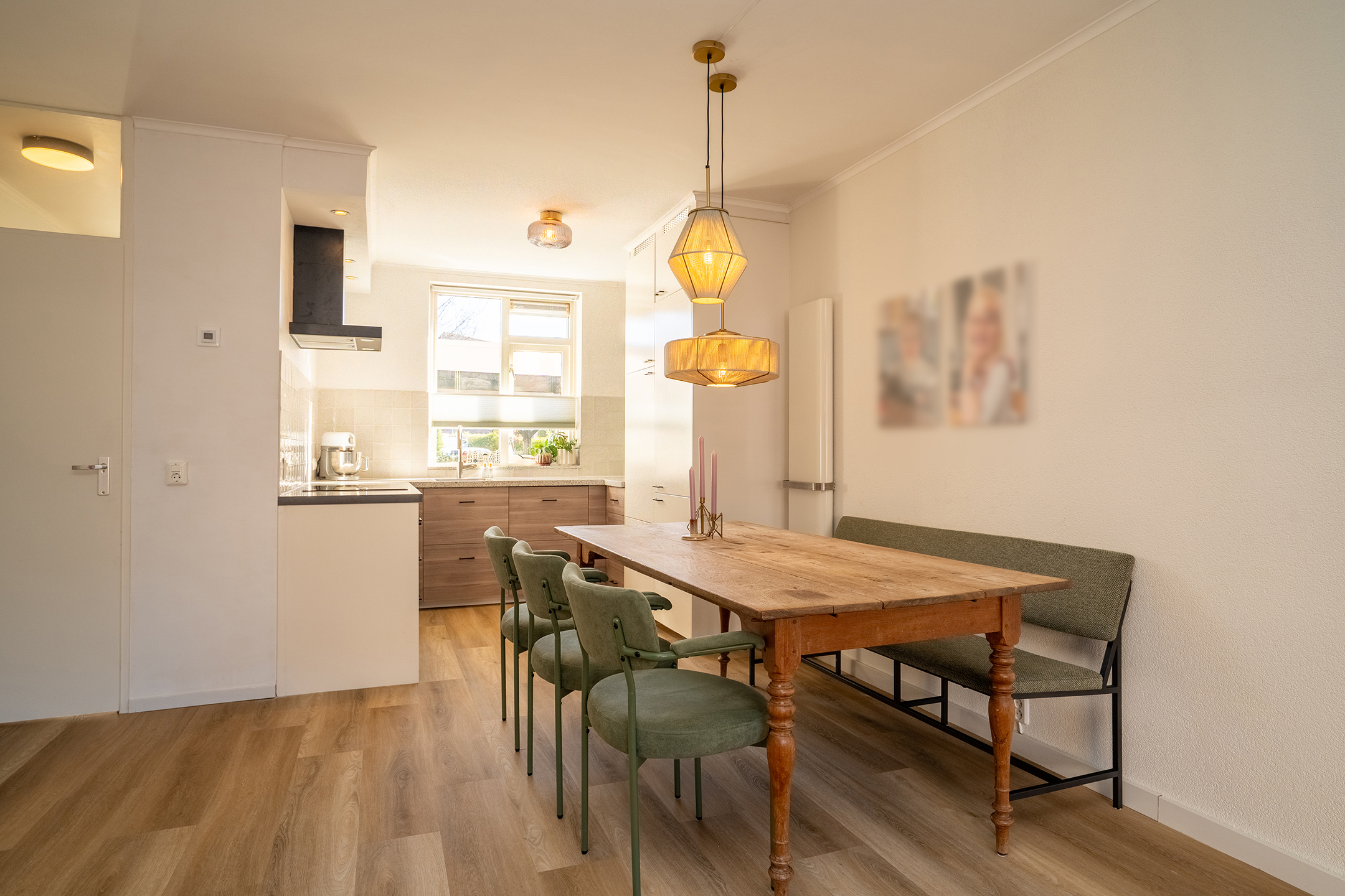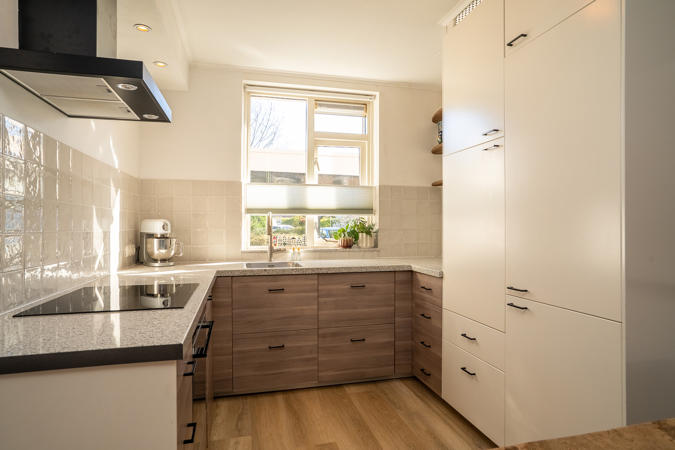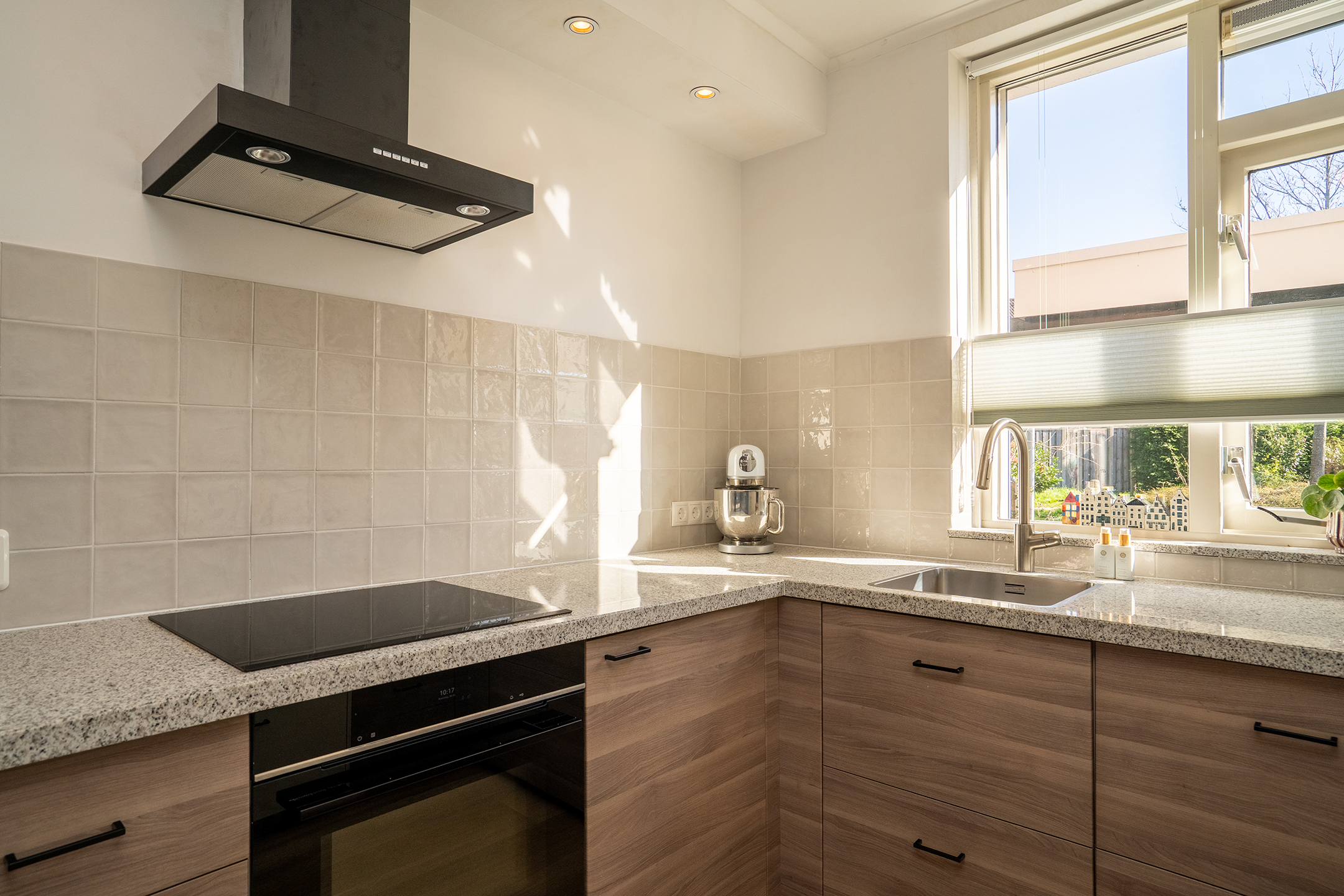 Aan de voorzijde van de woning bevindt zich de keuken. Deze is praktisch ingericht en uitgevoerd in een moderne stijl. De keuken beschikt over diverse inbouwapparatuur, waaronder een kookplaat, afzuigkap, koelkast en combi-oven. De kookplaat is vernieuwd in 2022 en de combi-oven en afzuigkap zijn vernieuwd in 2025. Daarnaast zijn het tegelwerk en het stucwerk in de keuken in 2025 en 2026 vernieuwd, wat zorgt voor een frisse en eigentijdse uitstraling.