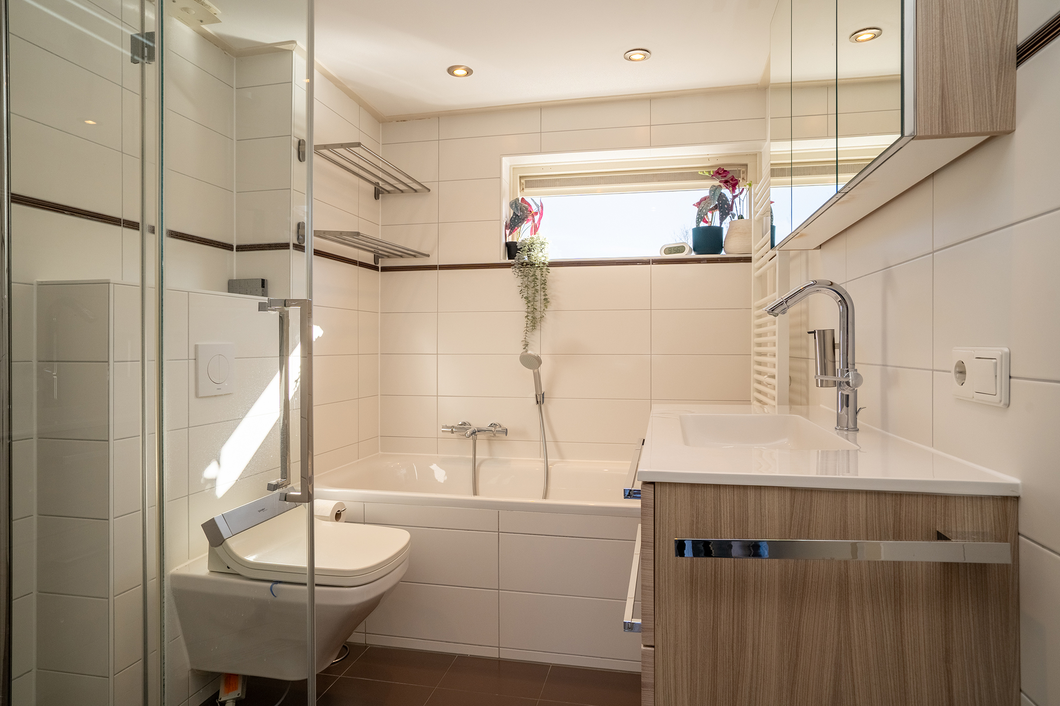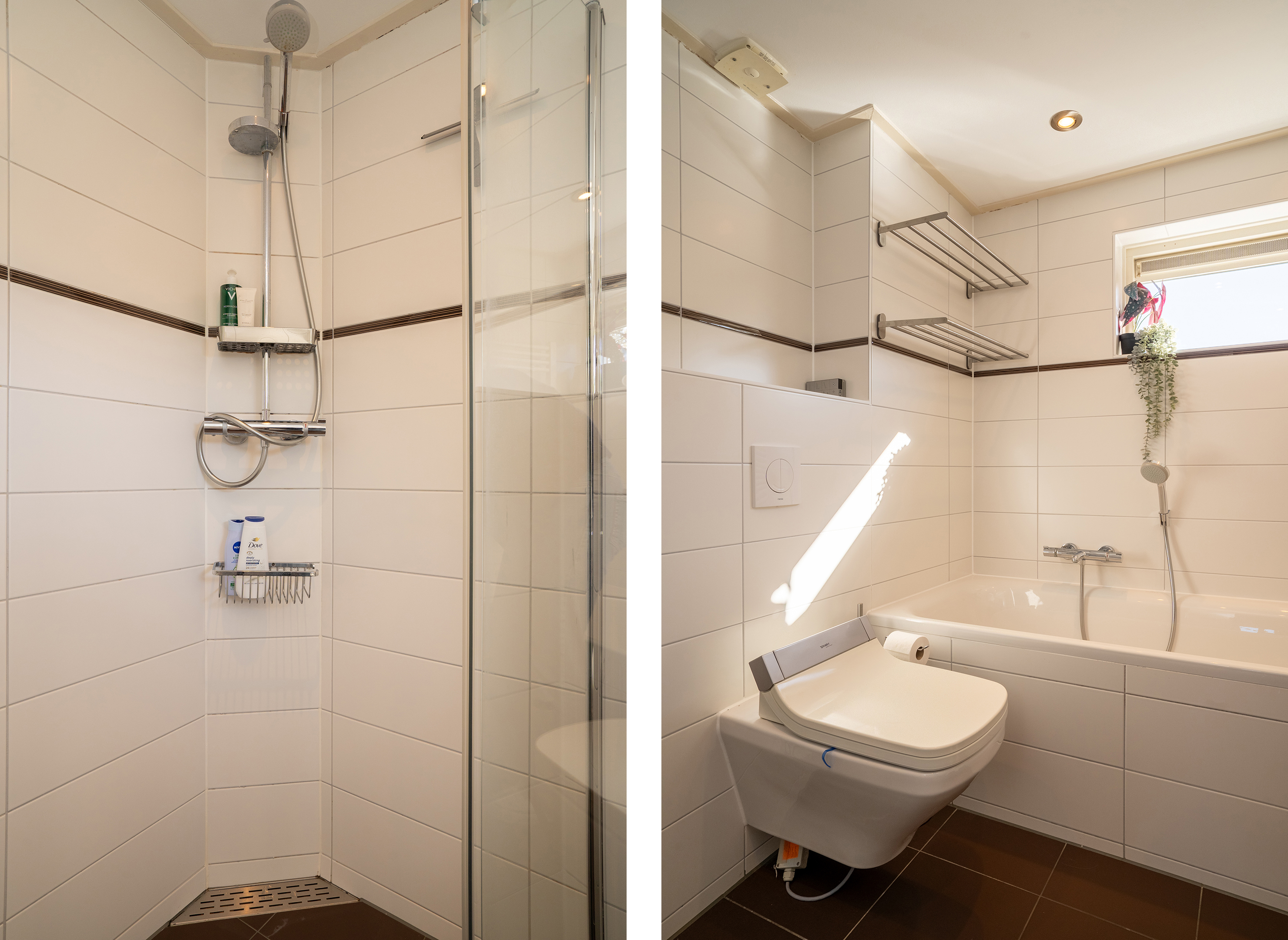De badkamer is volledig betegeld en uitgevoerd in een lichte, tijdloze kleurstelling. De ruimte is voorzien van een ligbad, aparte douche, wastafelmeubel met dubbele lade, spiegelkast en een toilet. Dankzij het aanwezige raam is er natuurlijke ventilatie en daglicht, wat bijdraagt aan het comfort.