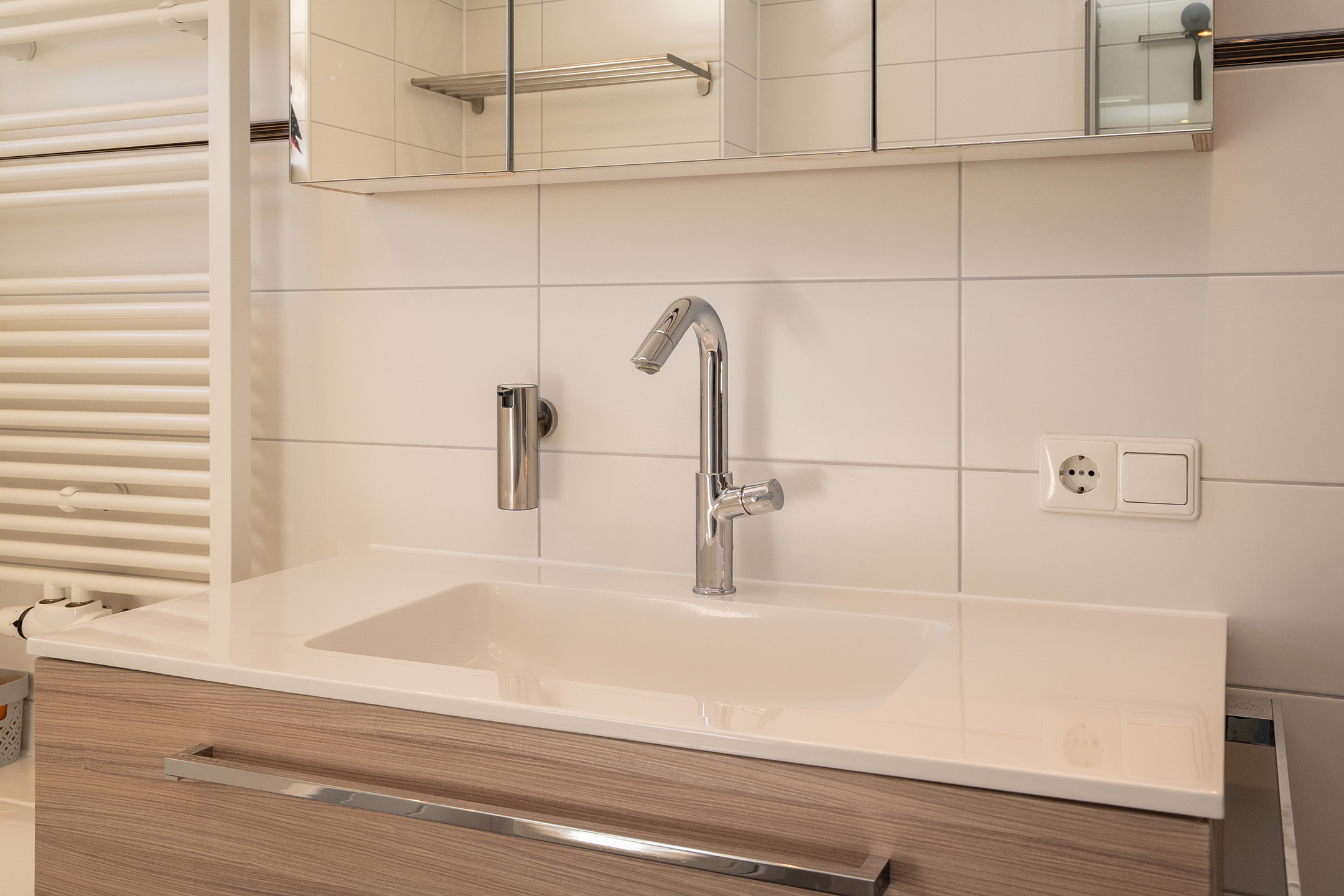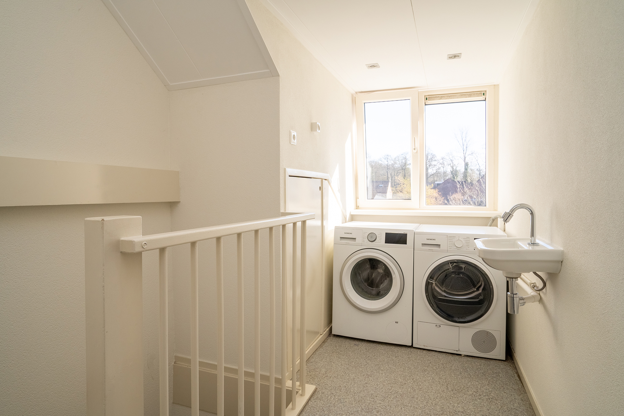 Op de overloop is tevens de opstelling voor de wasmachine en droger gerealiseerd, wat zorgt voor extra gemak in het dagelijks gebruik. Daarnaast is er een praktische wastafel aanwezig. De cv-ketel bevindt zich netjes weggewerkt achter een schot, waardoor de ruimte een verzorgde uitstraling behoudt.