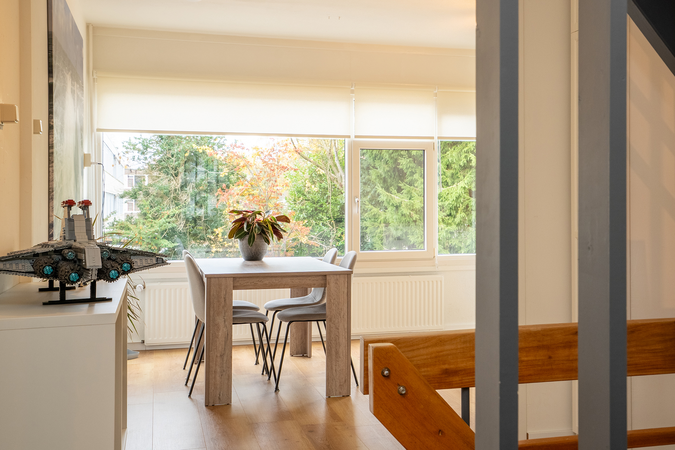 Eerste verdieping: De eerste verdieping is een open en lichte leefruimte. Aan de voorzijde bevindt zich de moderne keuken met volop werk- en kastruimte, perfect voor kookliefhebbers. Er is plaats voor een ruime eethoek en aansluitend een gezellige woonkamer aan de achterzijde, waar het grote raam voor veel lichtinval zorgt. Hier heb je een prachtig uitzicht op de tuin.