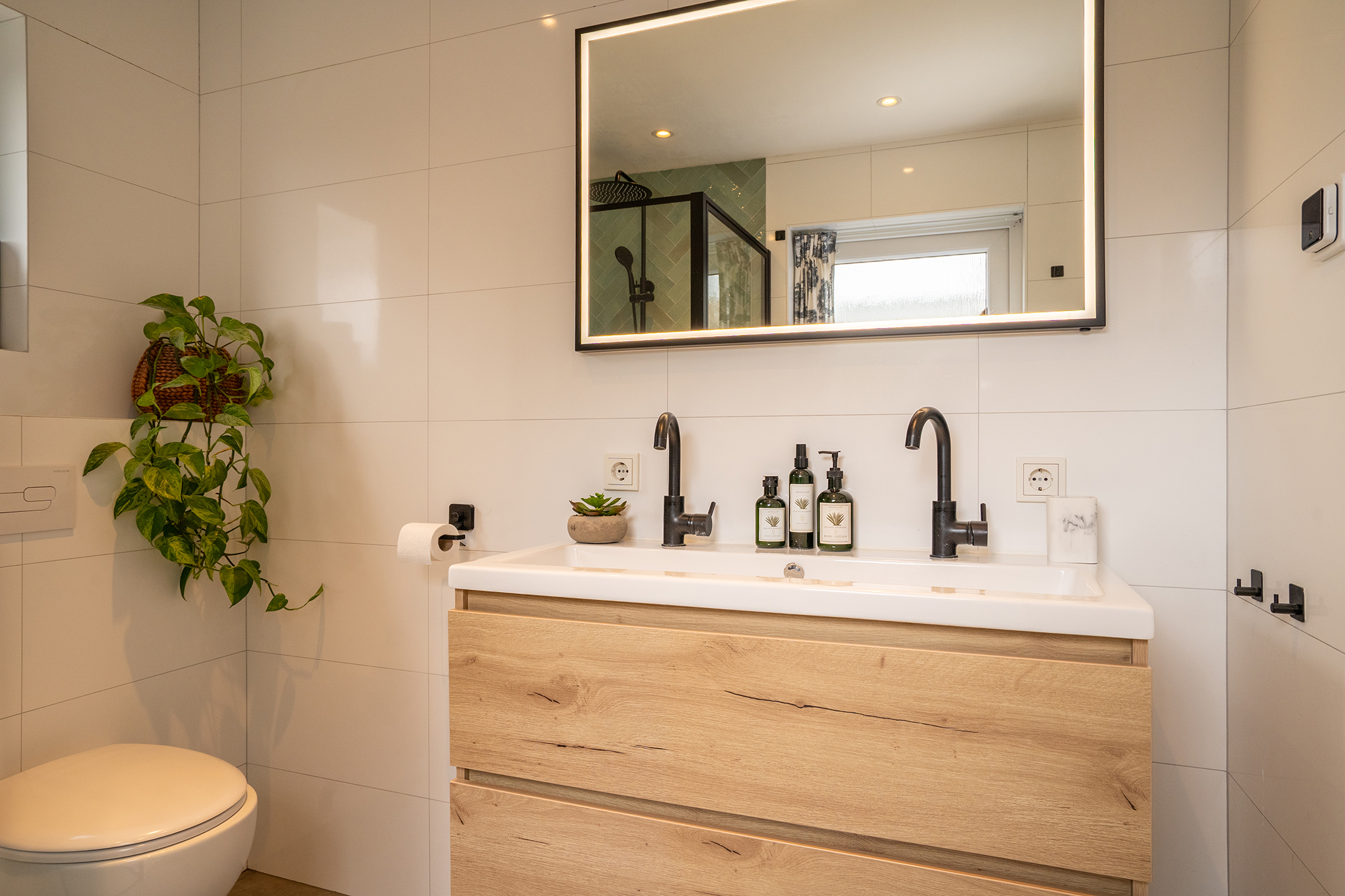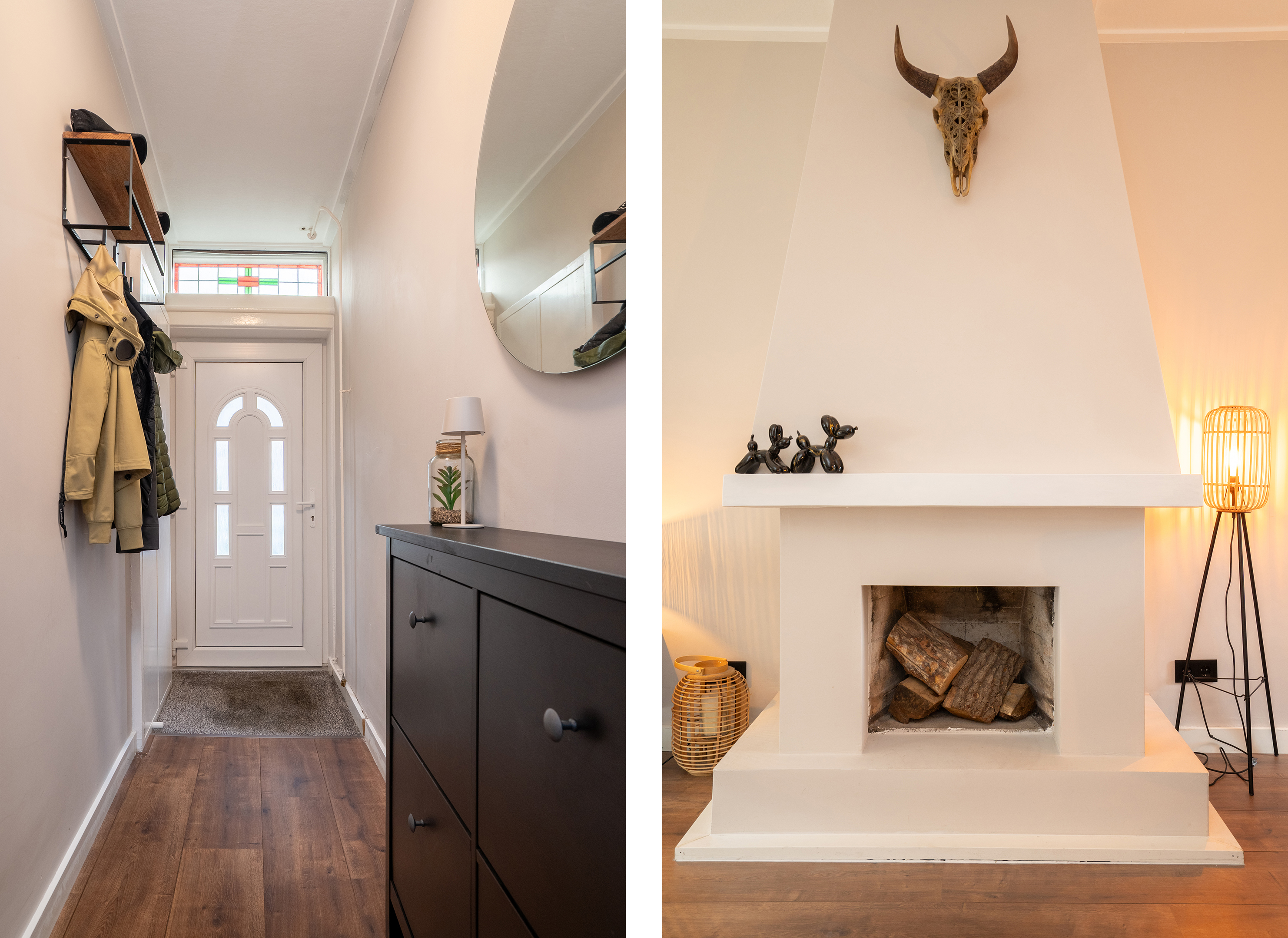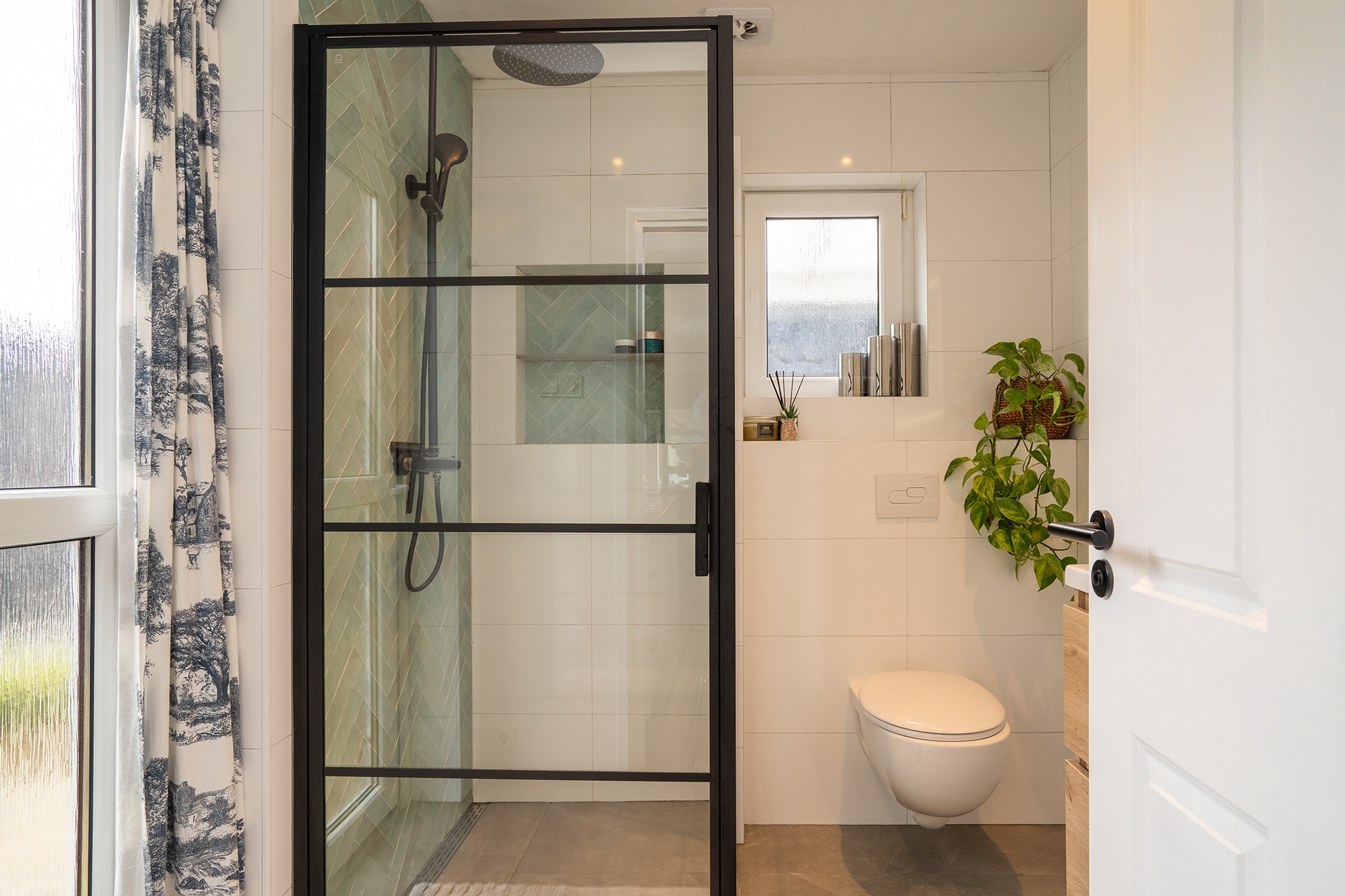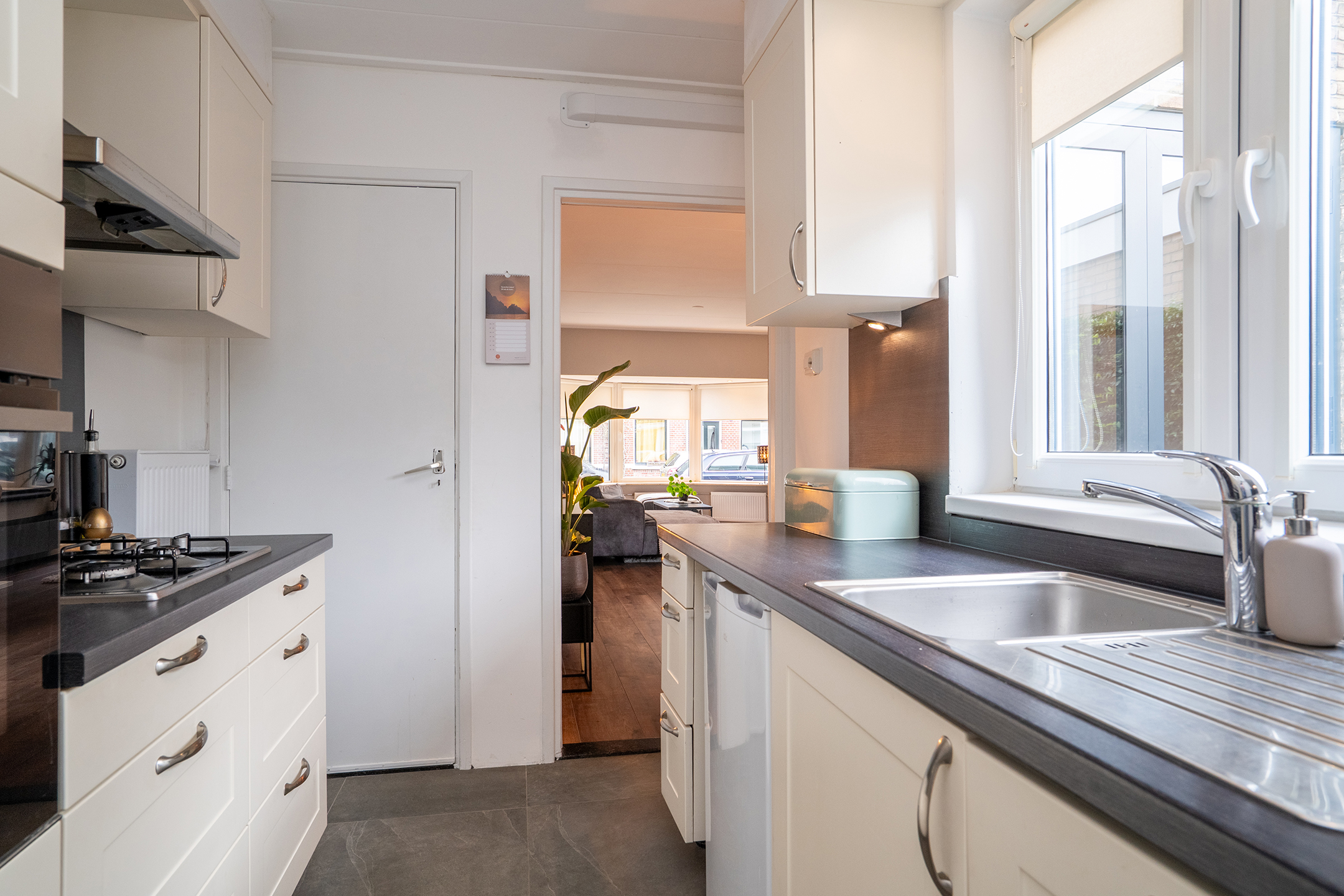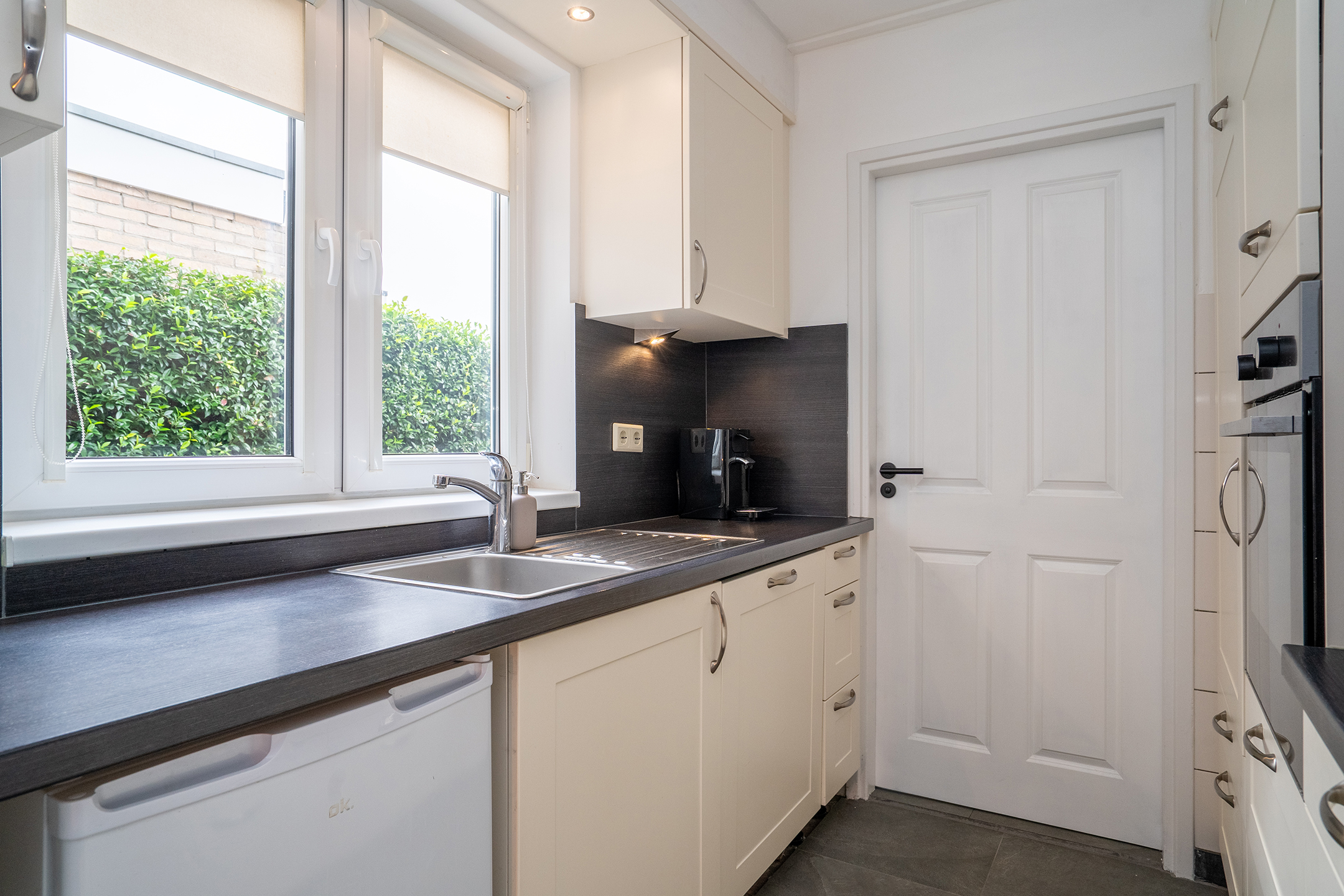 Begane grond: Je komt binnen in de lichte entree met trapopgang en toegang tot de ruime woonkamer. Dankzij de grote raampartijen aan de voorzijde is er veel natuurlijk licht. Aan de achterzijde is er ruimte voor een eethoek met direct zicht op de tuin. De keuken is compact maar praktisch ingedeeld en grenst aan de badkamer met douche, dubbele wastafel en toilet.