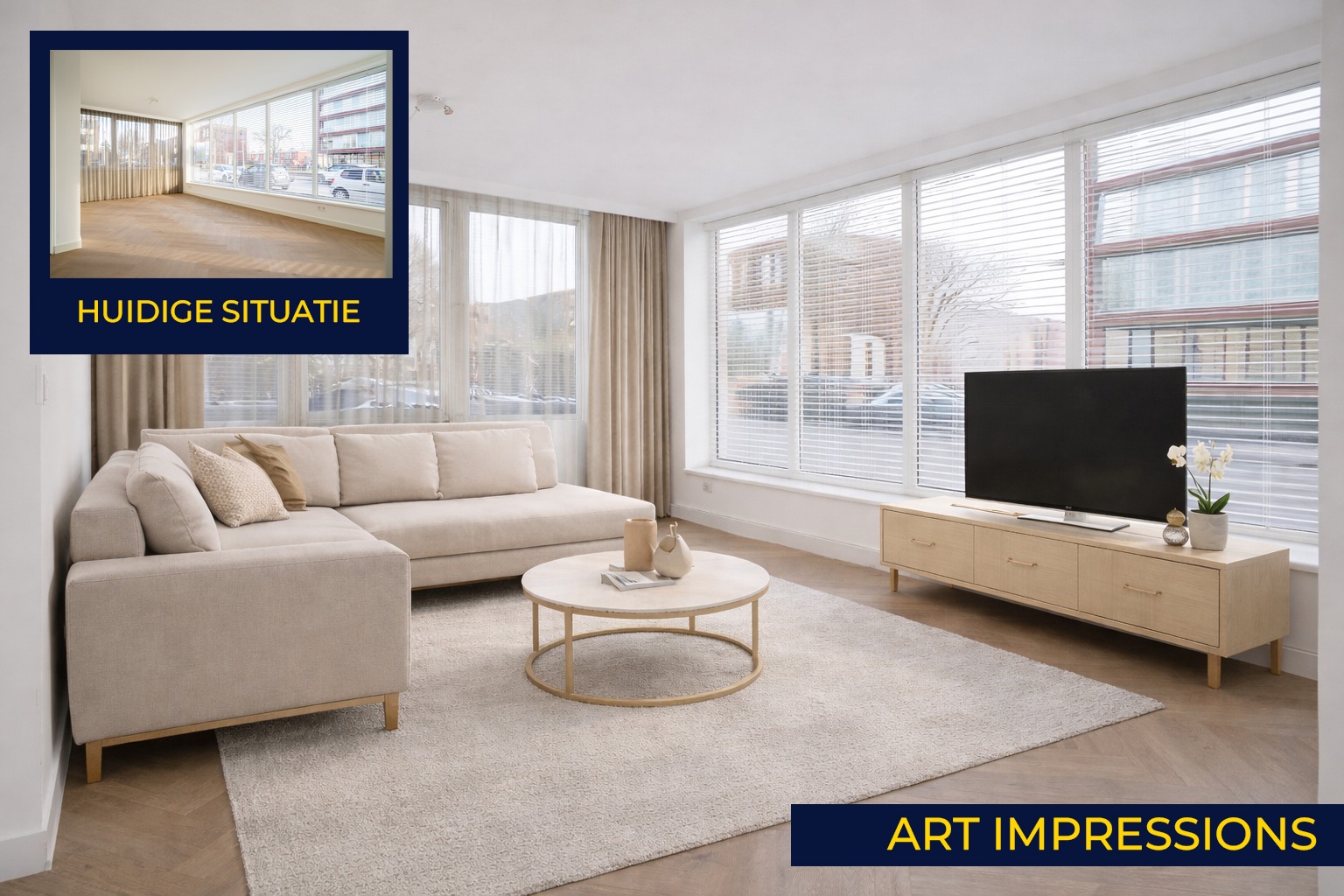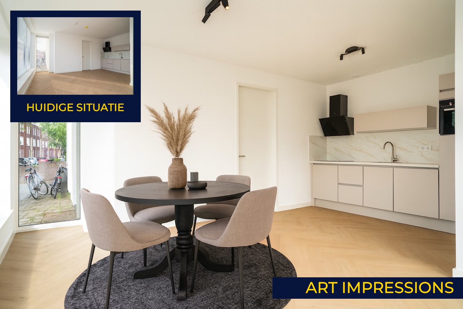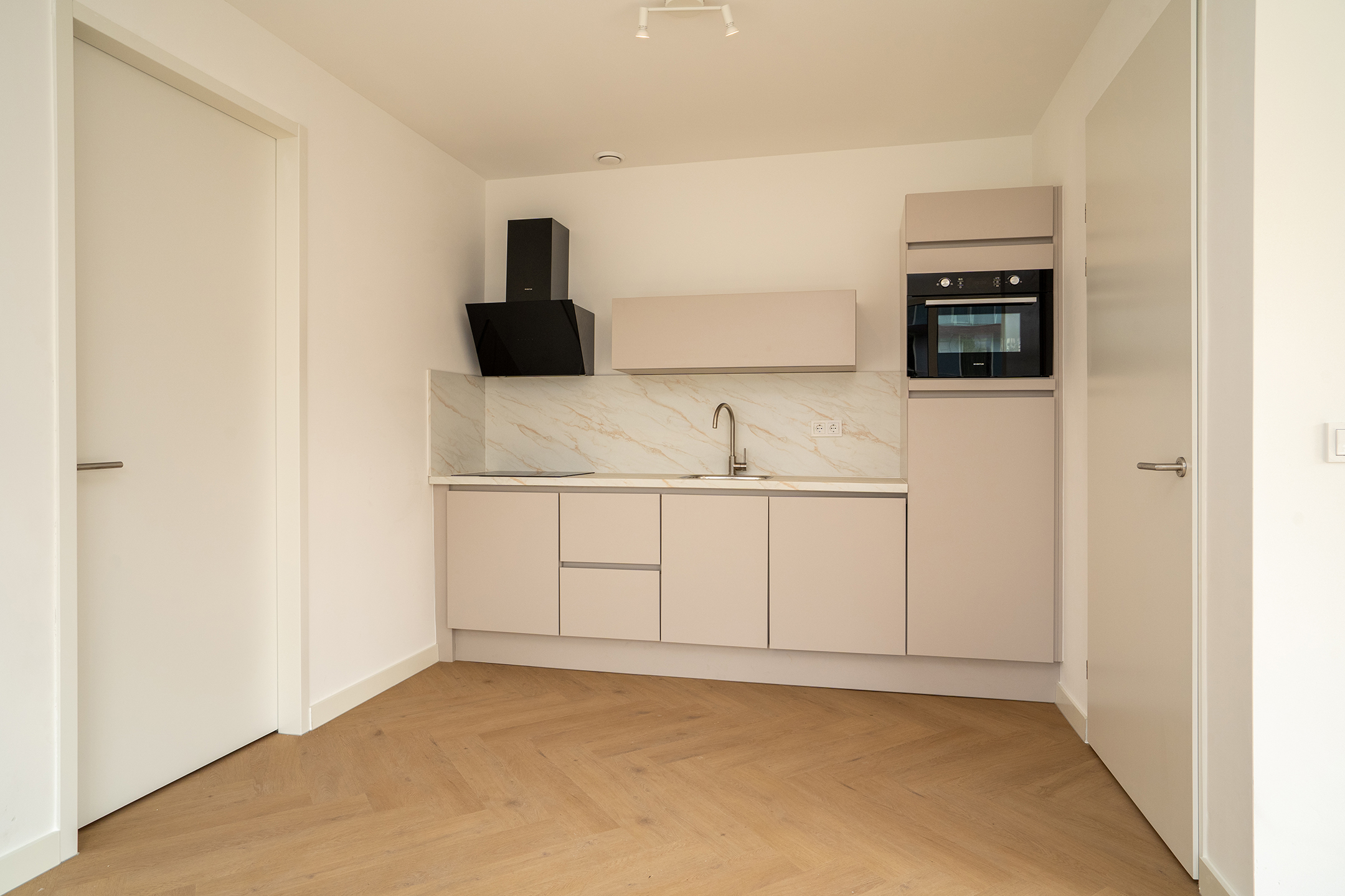 Vanuit de hal bereik je de ruime en lichte woonkamer met open keuken. Grote raampartijen zorgen hier voor een prachtige lichtinval en een aangename, open sfeer. De stijlvolle beige keuken vormt het hart van de ruimte en is strak vormgegeven met een luxe marmerlook werkblad. Uiteraard is de keuken compleet uitgerust met moderne inbouwapparatuur, waaronder een vaatwasser, combi-oven, koelkast, kookplaat en afzuigkap. Hier komen stijl en functionaliteit perfect samen.