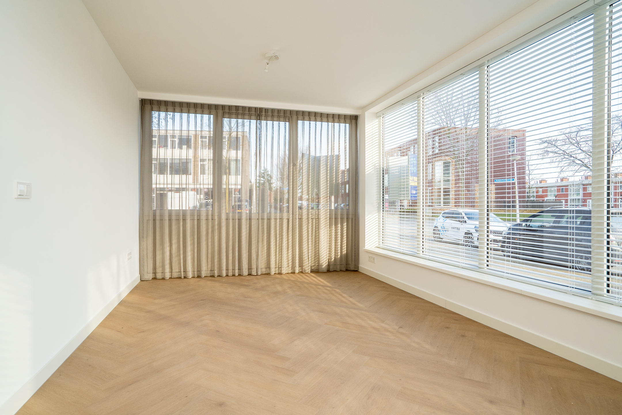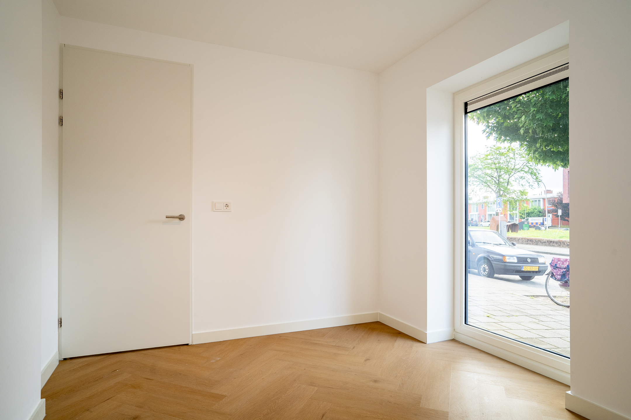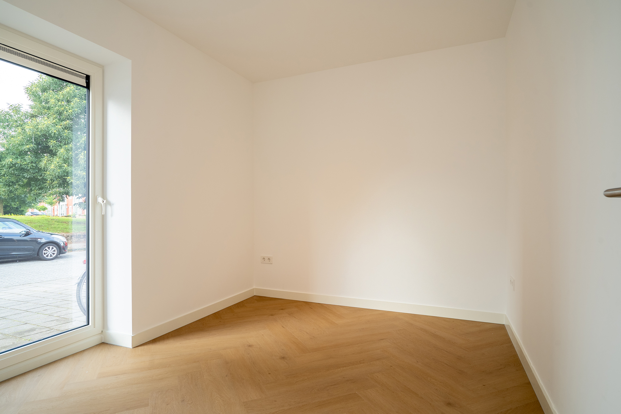 De slaapkamer is strak afgewerkt met lichte wanden en grote raampartijen. Hierdoor voelt de kamer ruim en licht aan en biedt de kamer volop mogelijkheden: als comfortabele slaapkamer, rustige thuiswerkplek of hobbyruimte.