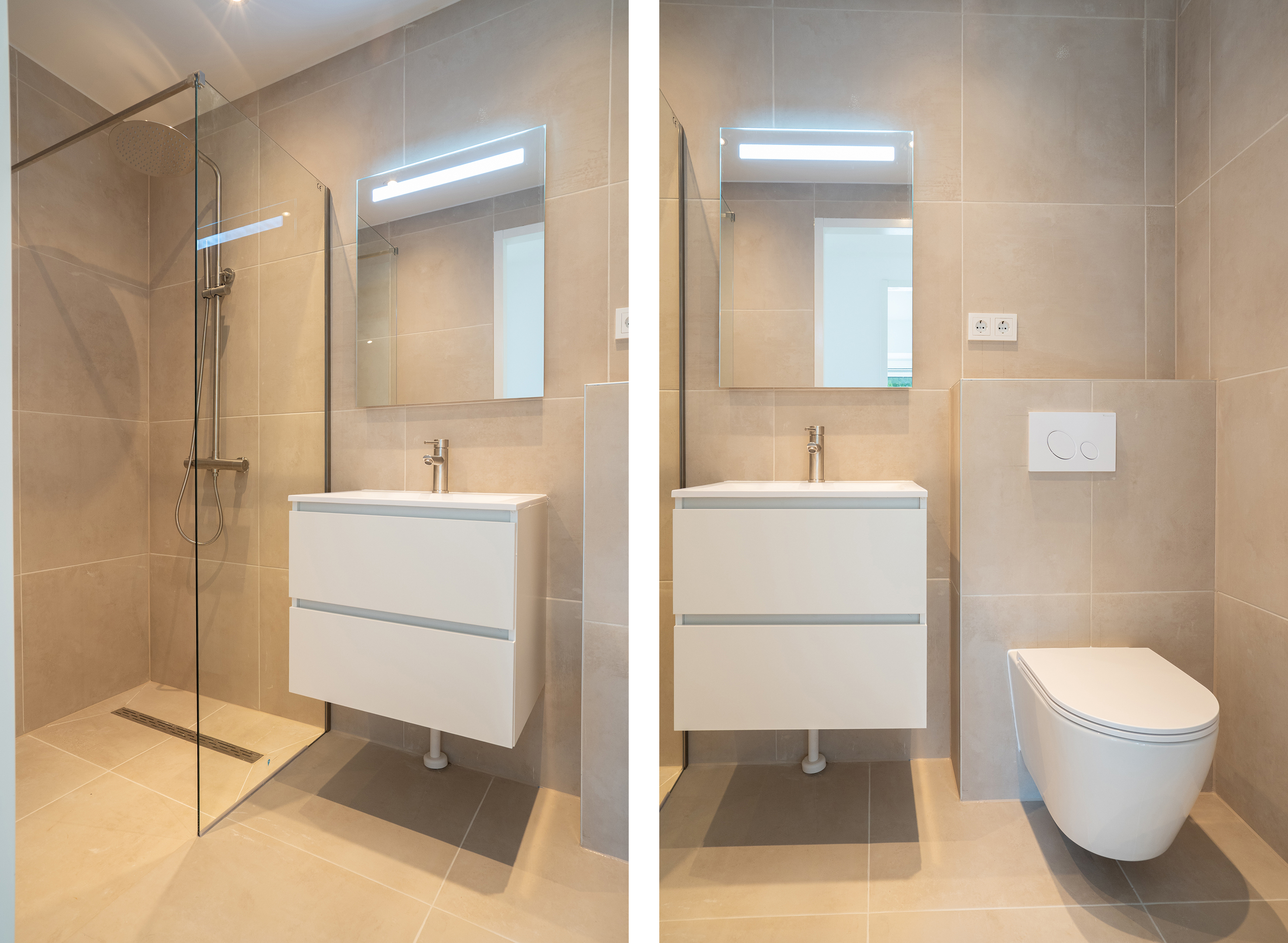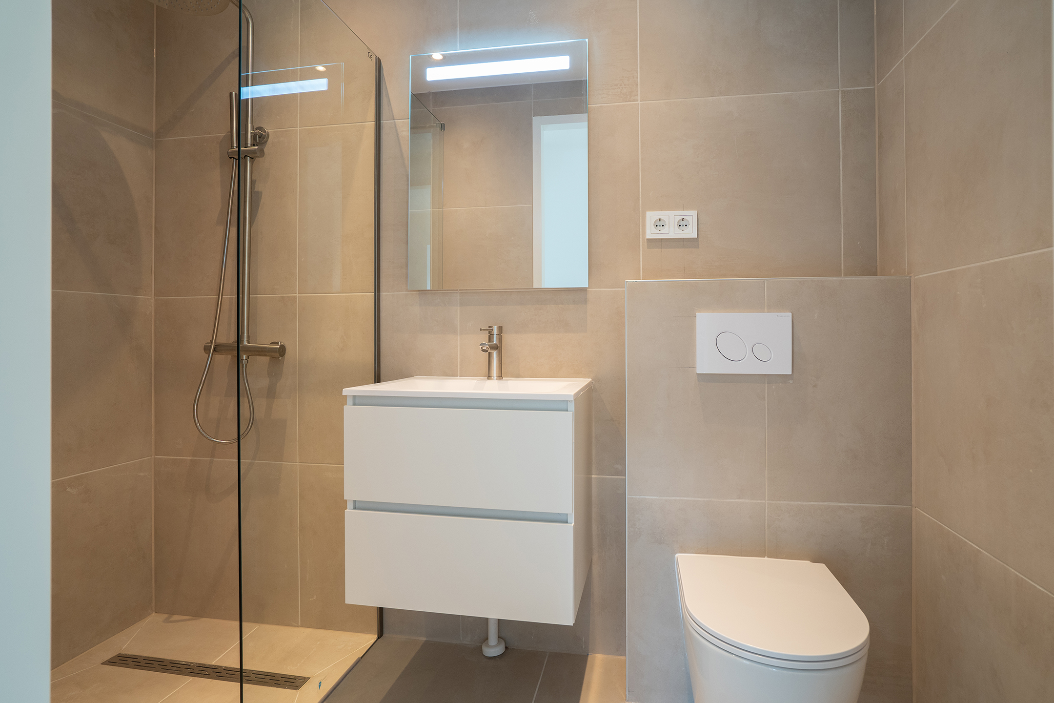 De badkamer is modern en stijlvol uitgevoerd en volledig betegeld. Hier vind je een wastafelmeubel met dubbele lades, een grote spiegel met geïntegreerde verlichting, een tweede toilet en een royale inloopdouche met zowel een handdouche als een comfortabele stortdouche. Een plek waar luxe en ontspanning samenkomen.