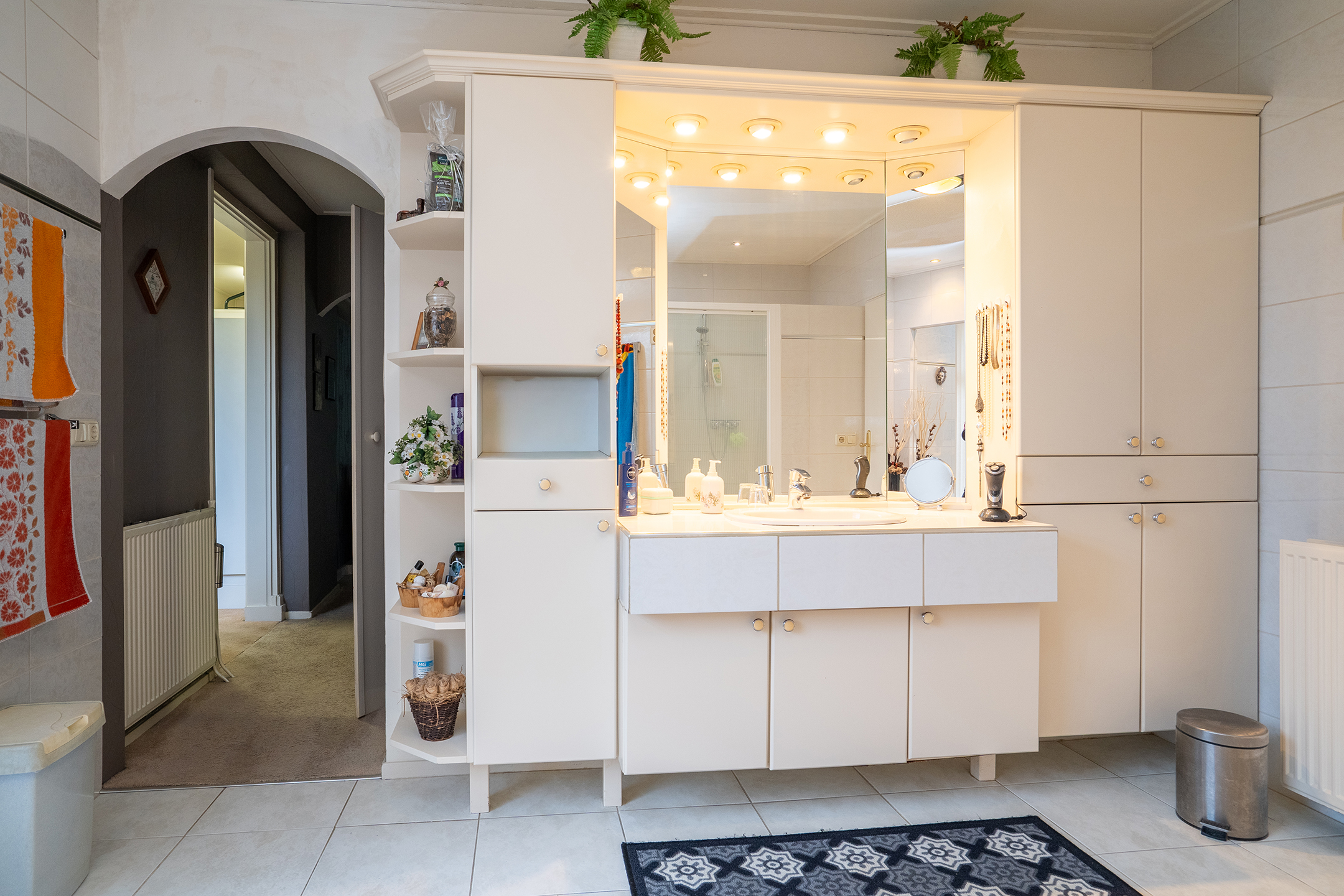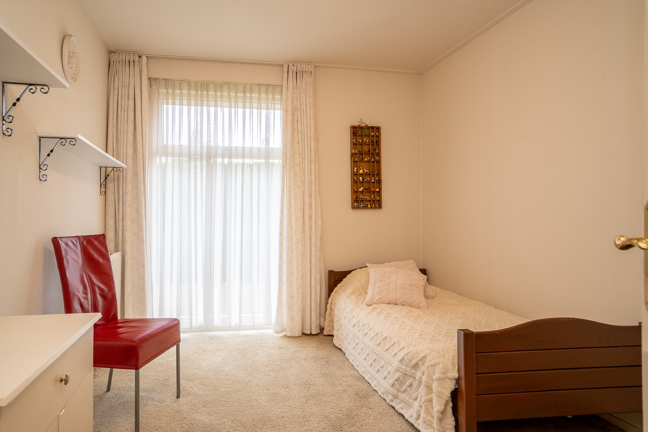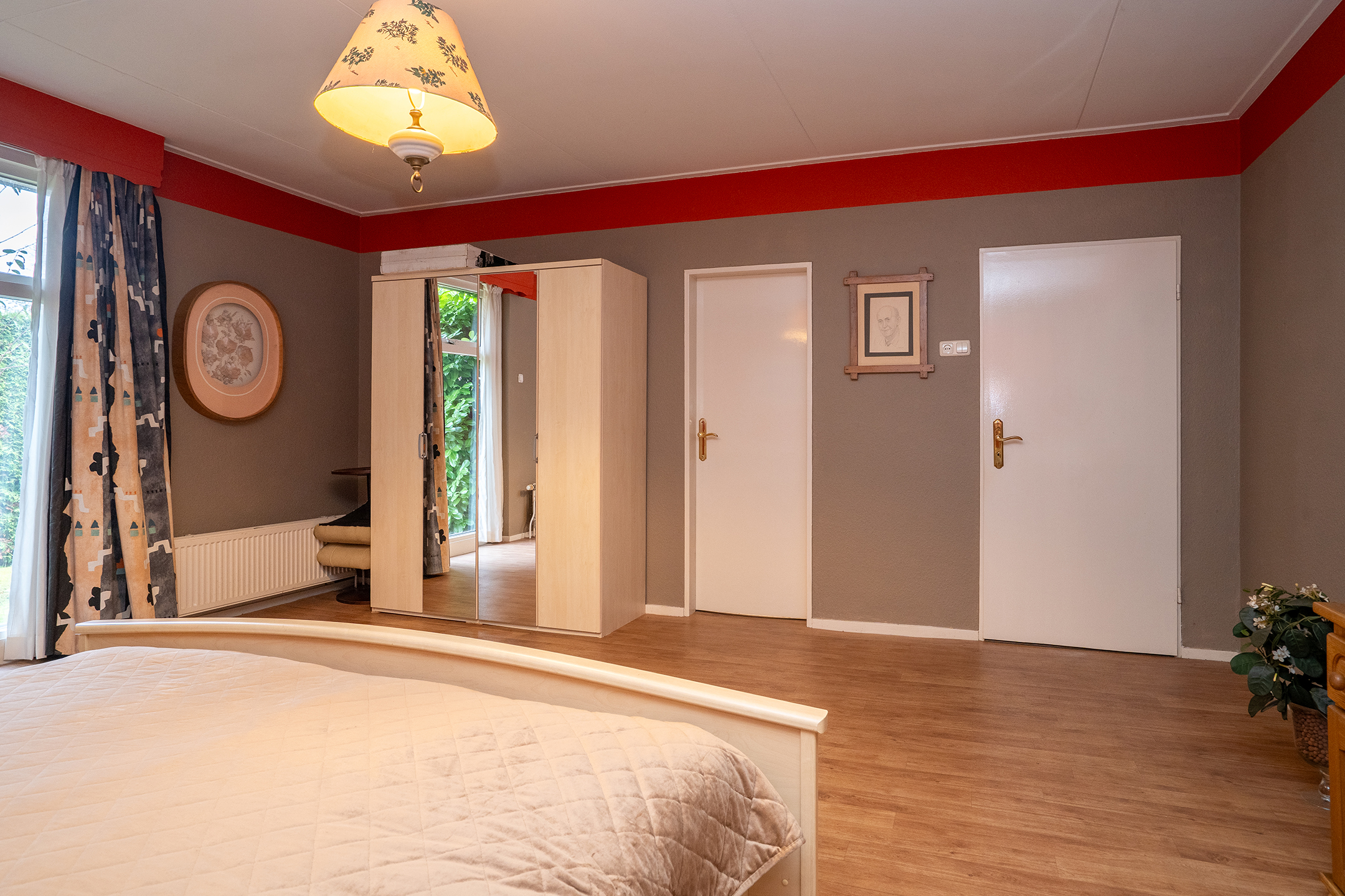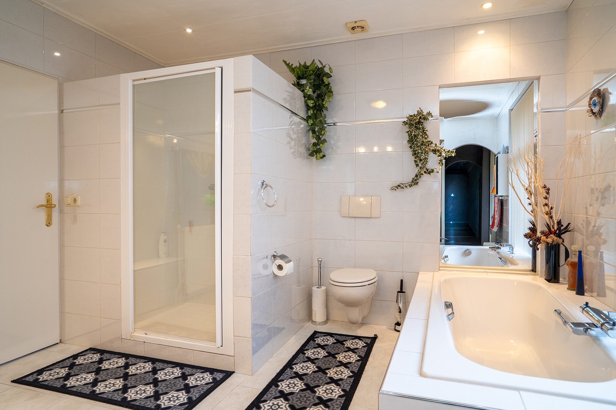 Aan de linkerzijde van de woning bevindt zich de slaapvleugel: rustig, privé en bijzonder comfortabel. De lange gang met grote ramen leidt langs twee slaapkamers, een nette badkamer en een praktische bijkeuken met zij-entree en wasruimte. De badkamers zijn goed onderhouden, maar zijn klaar om volledig naar eigen stijl te vernieuwen.