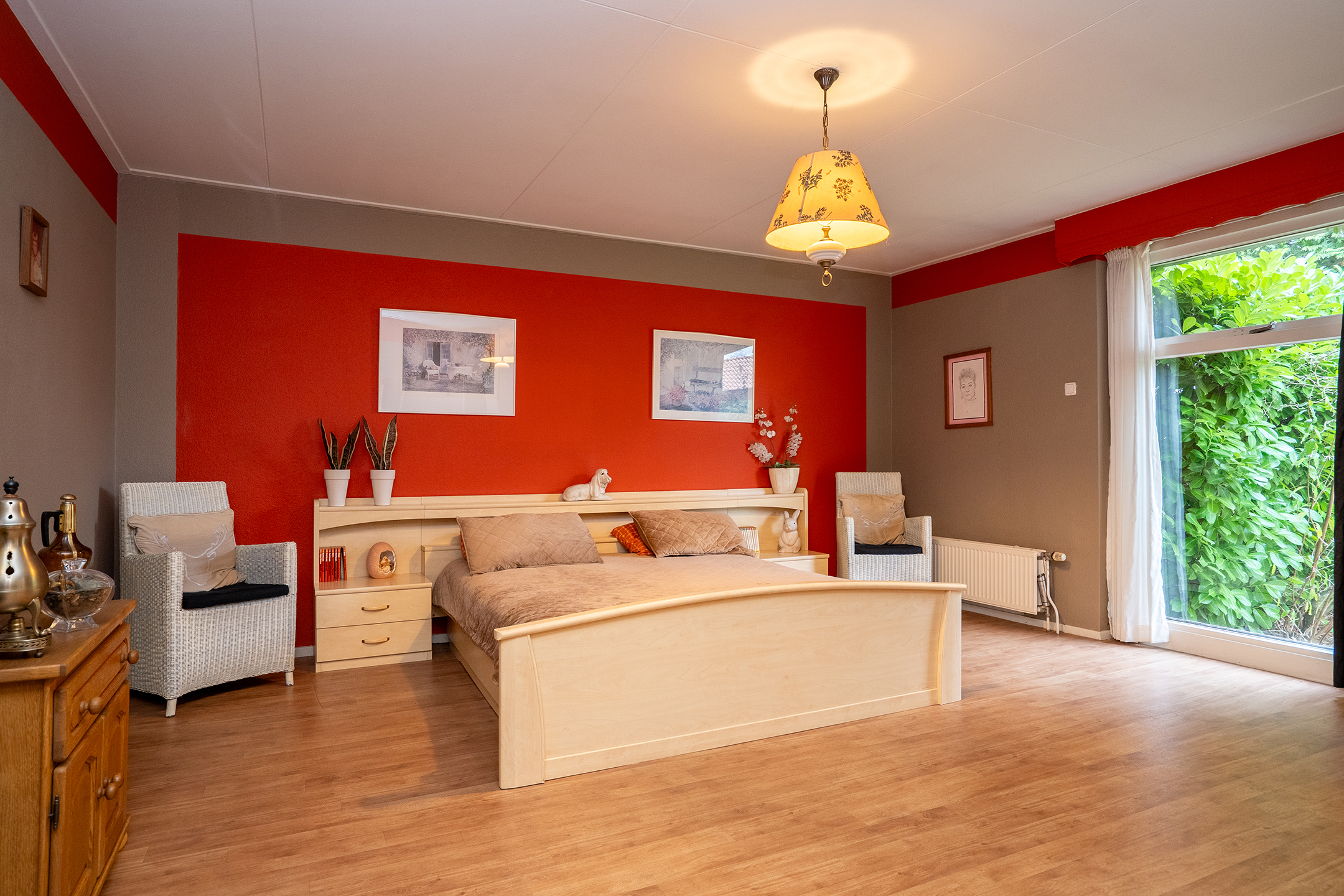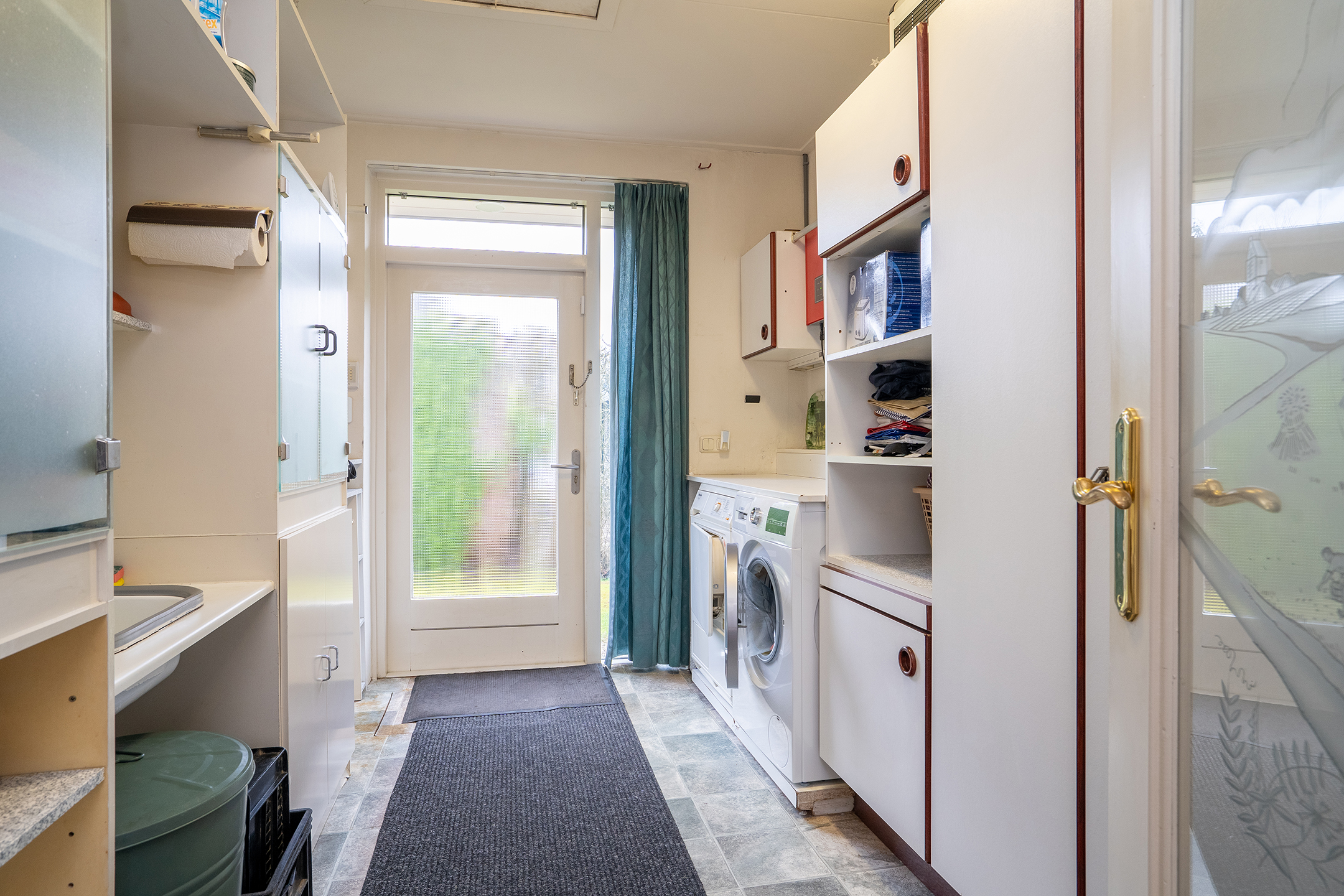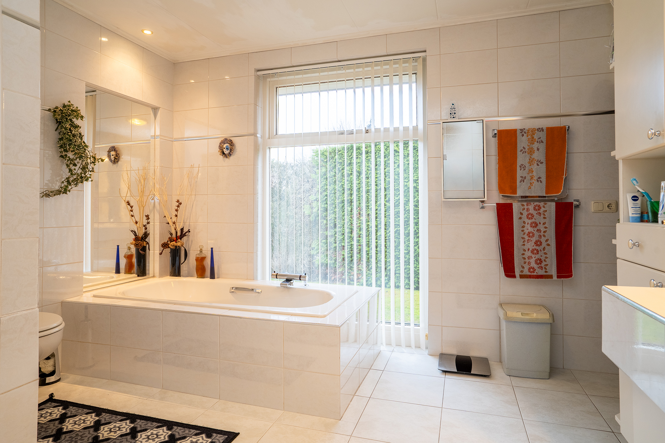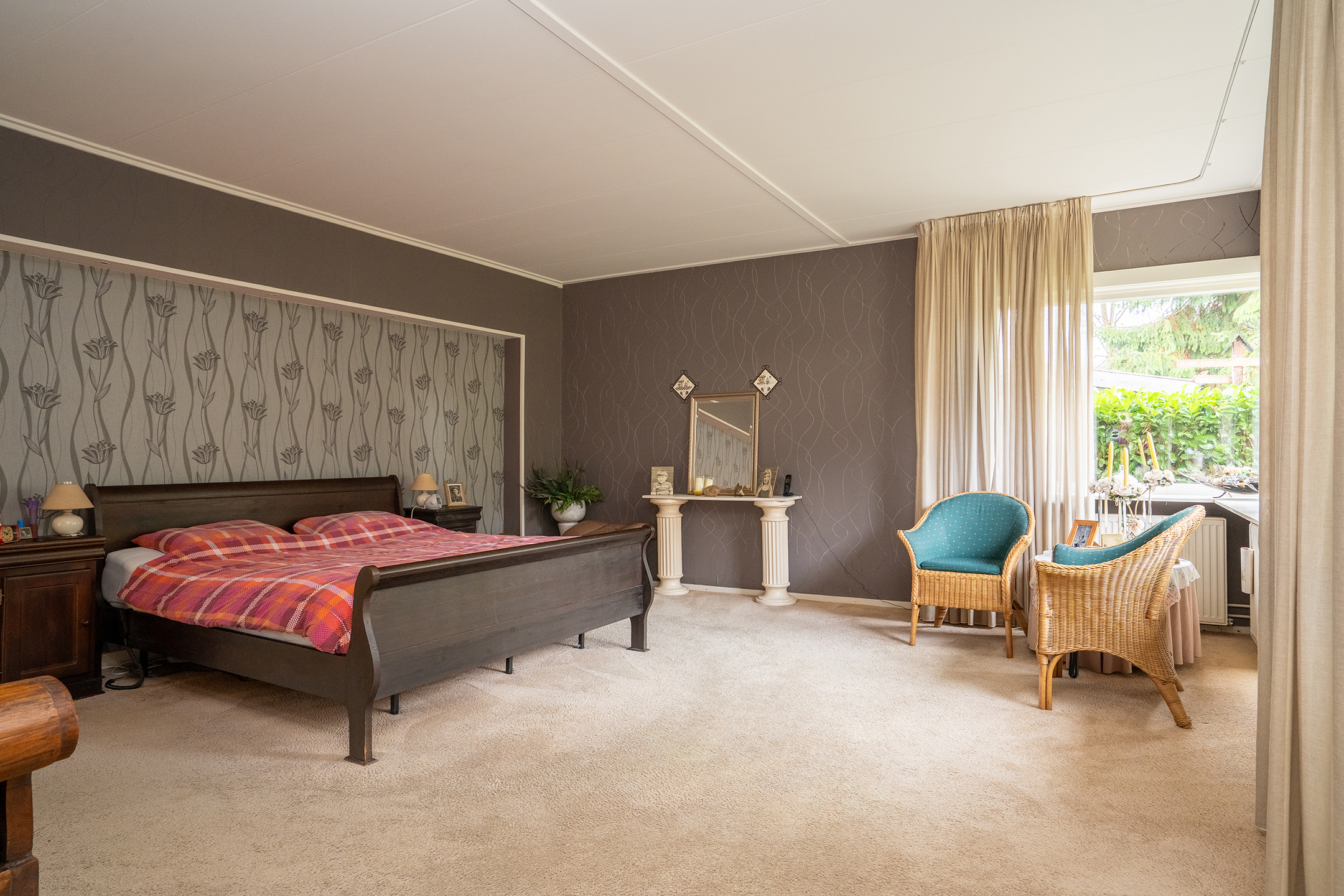 Aan de linkerzijde van de woning bevindt zich de slaapvleugel: rustig, privé en bijzonder comfortabel. De lange gang met grote ramen leidt langs twee slaapkamers, een nette badkamer en een praktische bijkeuken met zij-entree en wasruimte. De badkamers zijn goed onderhouden, maar zijn klaar om volledig naar eigen stijl te vernieuwen.