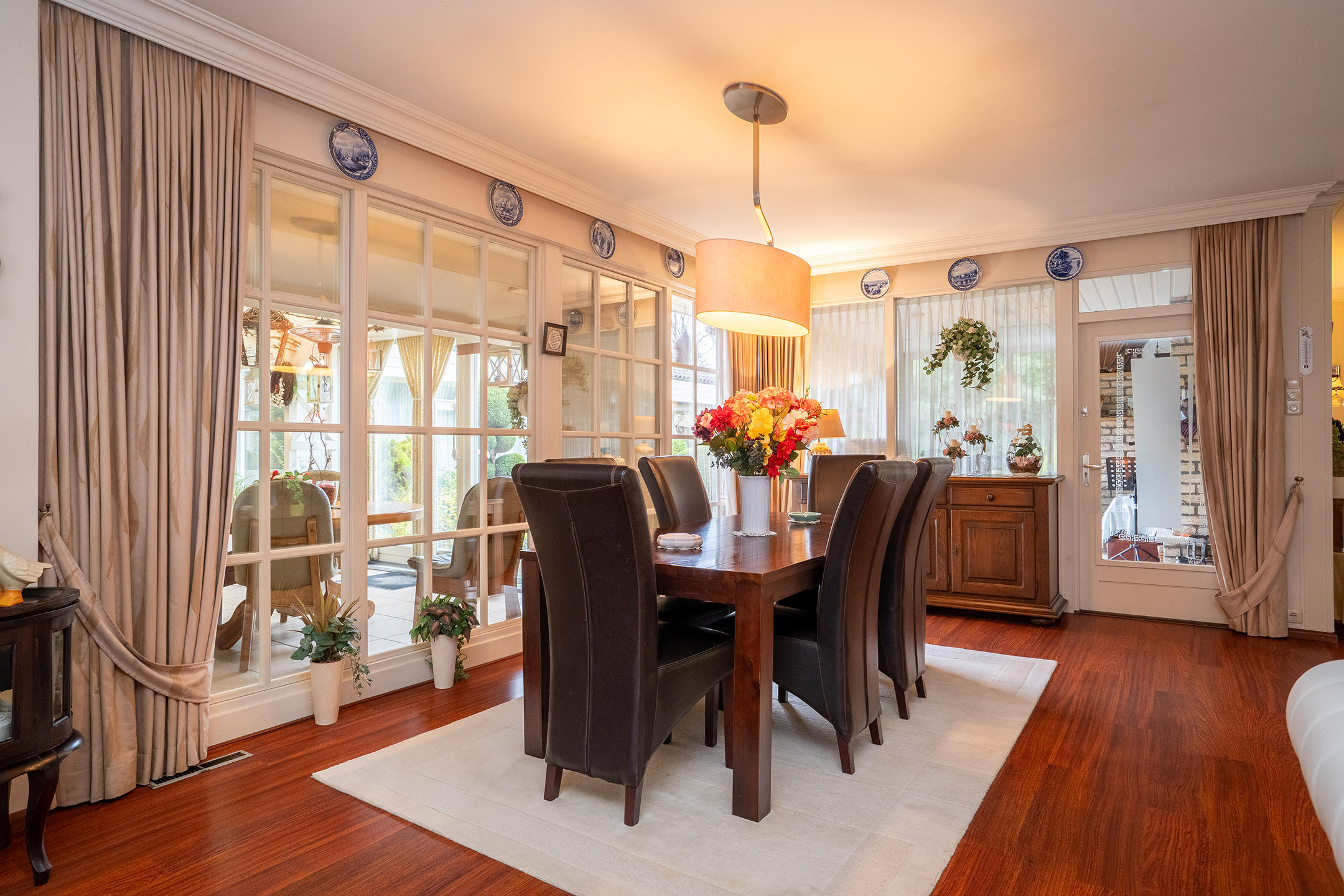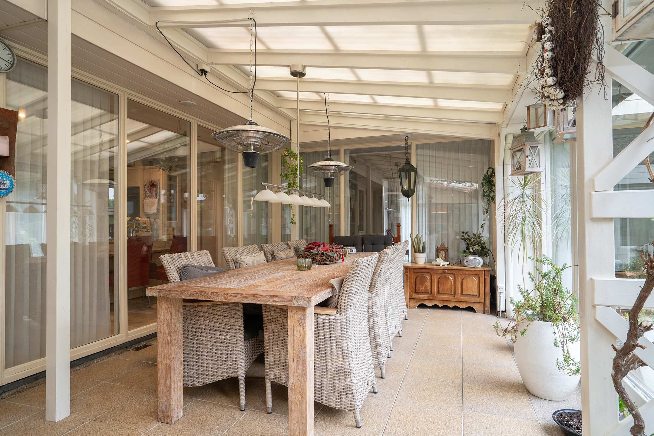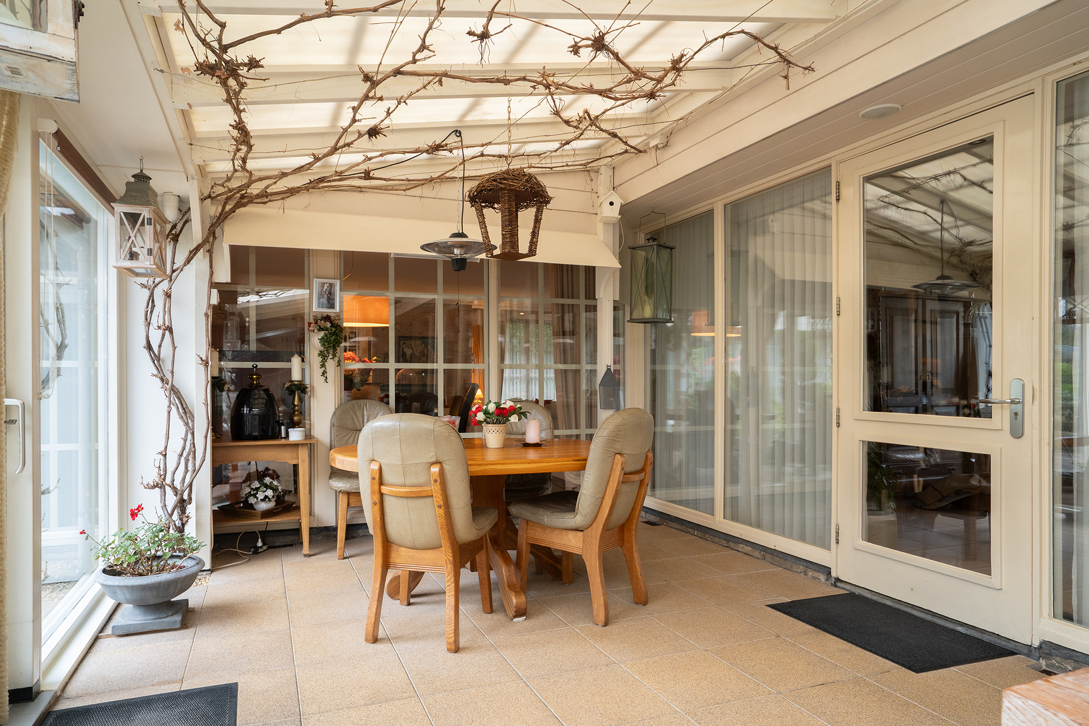 Via een brede glazen pui stap je de lichte serre in — het hart van de woning. Hier geniet je van ontbijt in de ochtendzon, lange avonden met vrienden of een prachtig zicht op de tuin. De druivenrank boven het terras geeft deze plek een uniek en sfeervol karakter.