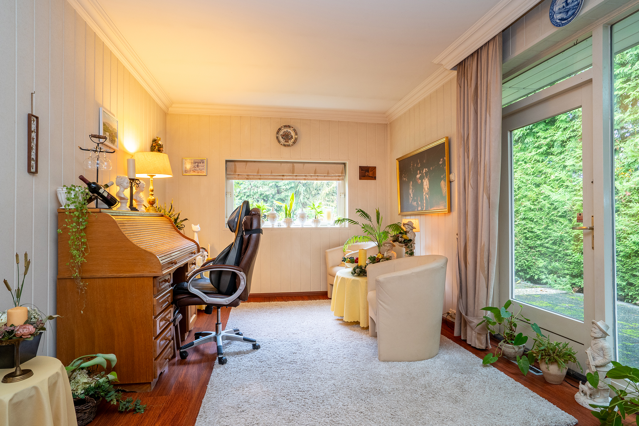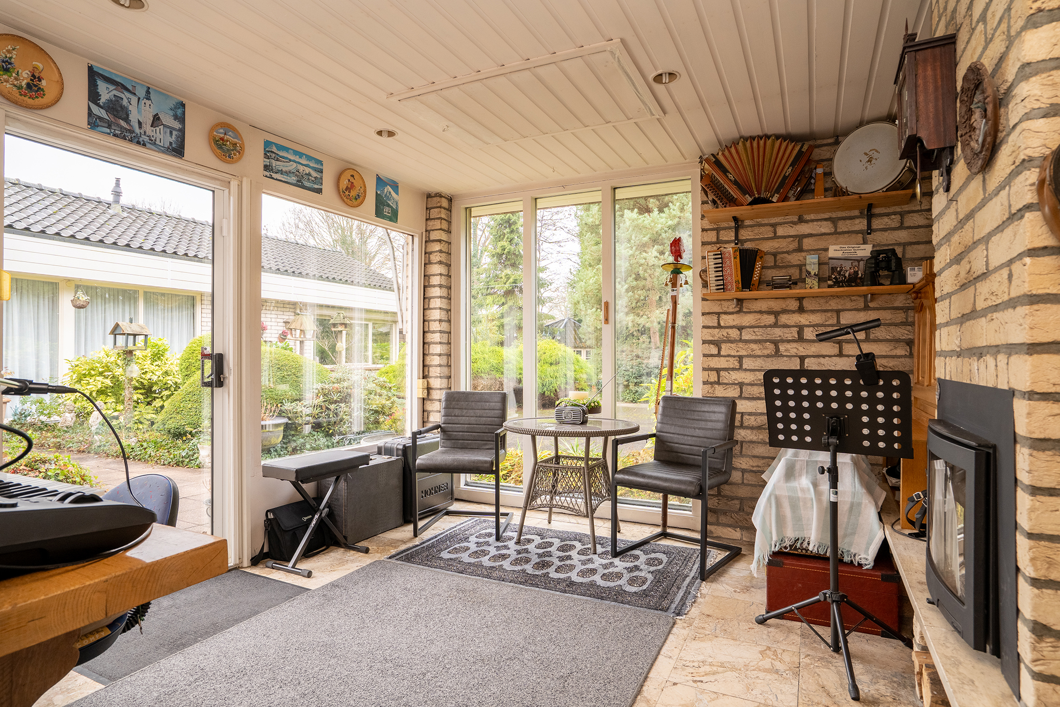 Aangrenzend ligt de tuinkamer, eveneens met open haard: een ideale plek voor wie graag leest, werkt, creëert of simpelweg geniet van het uitzicht.