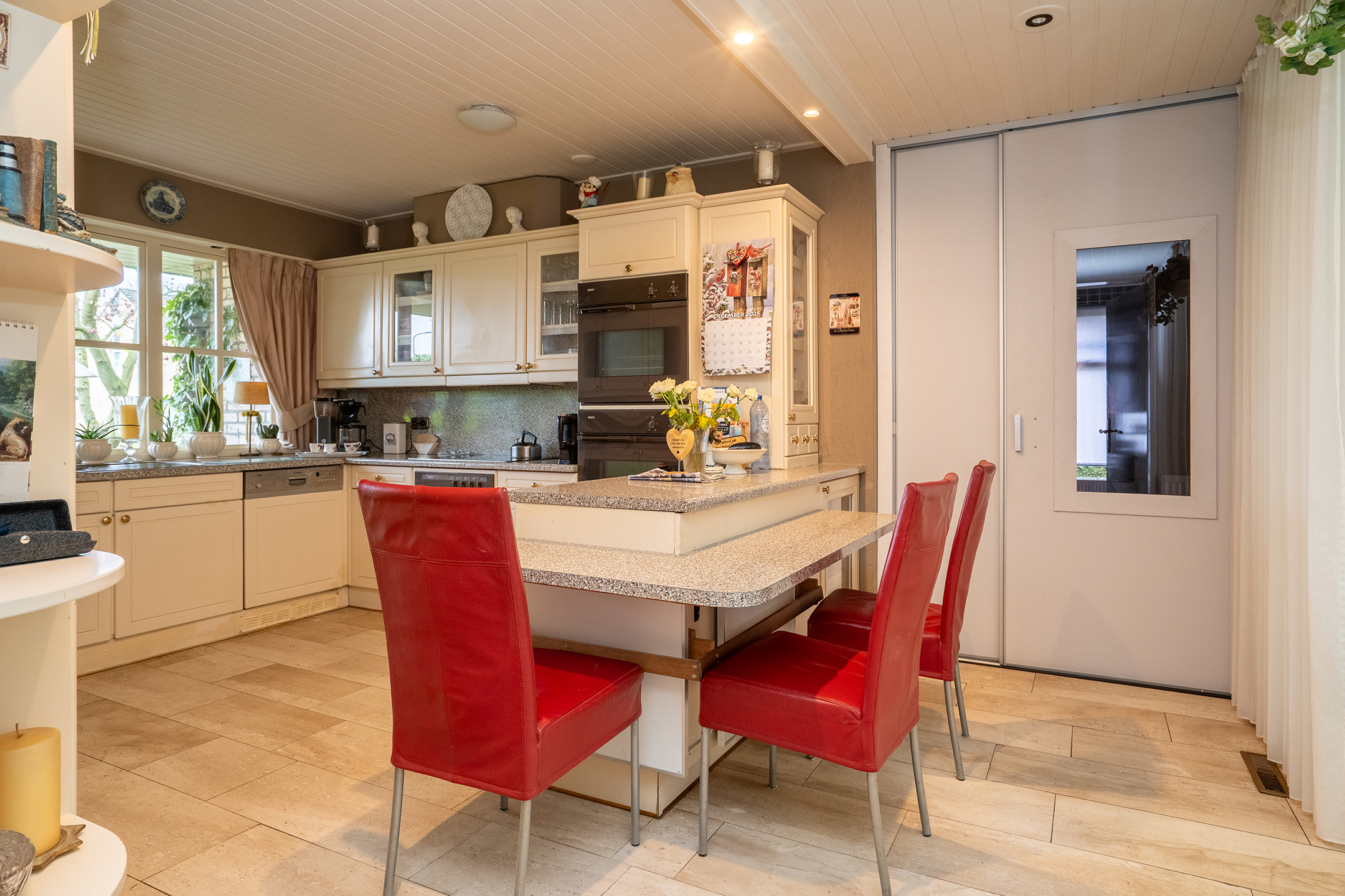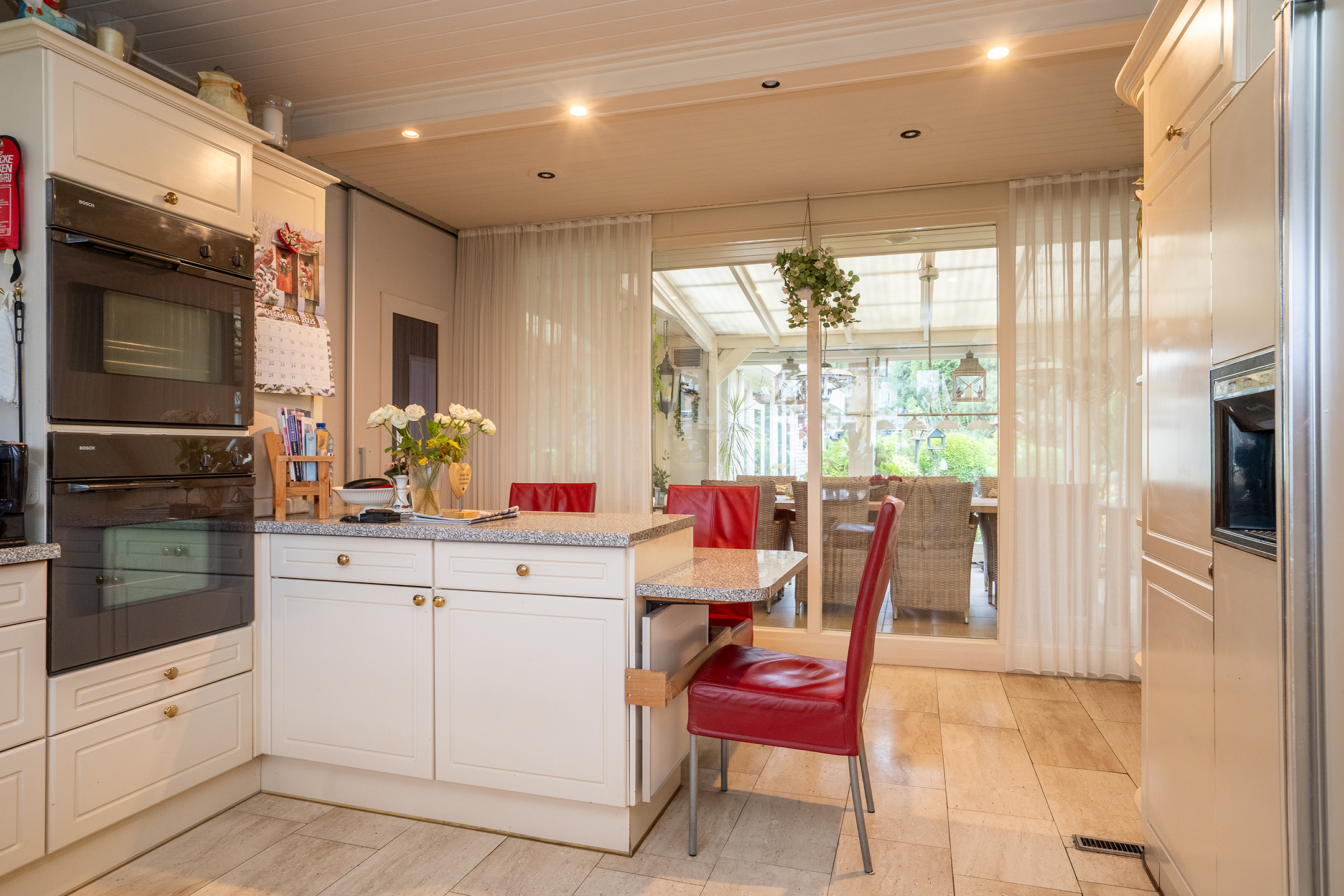 De open keuken is ruim opgezet en functioneel ingericht, met o.a. een grote koelkast met ijsblokjesfunctie, twee ovens en een keramische kookplaat. De ruimte is netjes onderhouden, maar biedt volop kansen voor een moderne update.