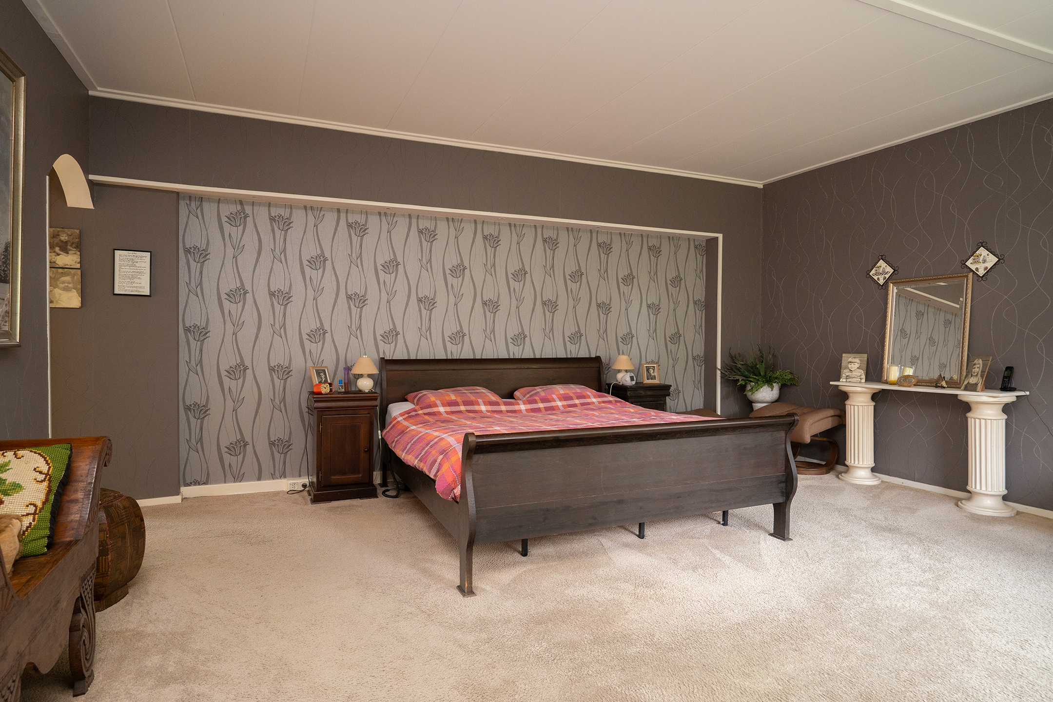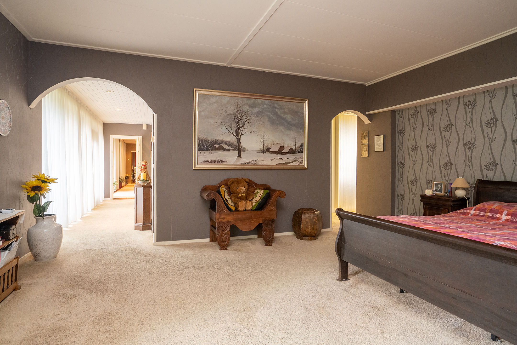 De grootste slaapkamer voelt als een hotelkamer, met een eigen hal, royale slaapkamer van 25 m², dubbele walk-in kleedkamer en een privébadkamer — eveneens perfect om te moderniseren tot een luxe wellnessruimte.