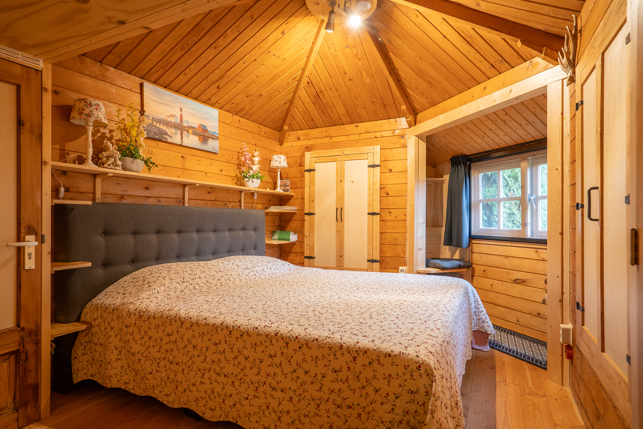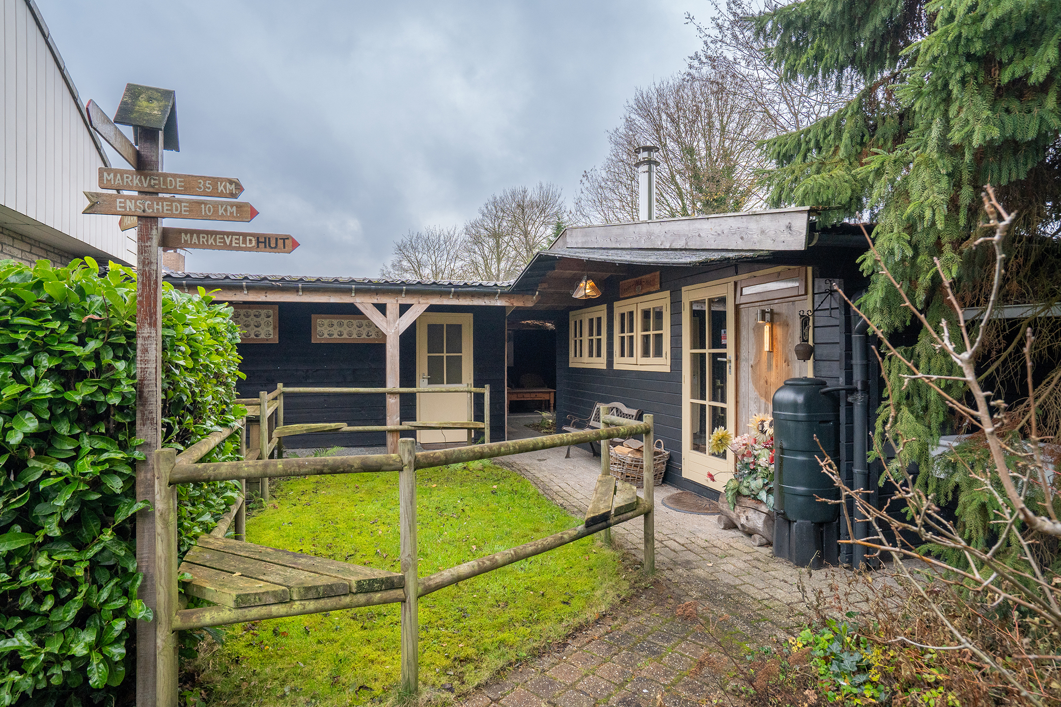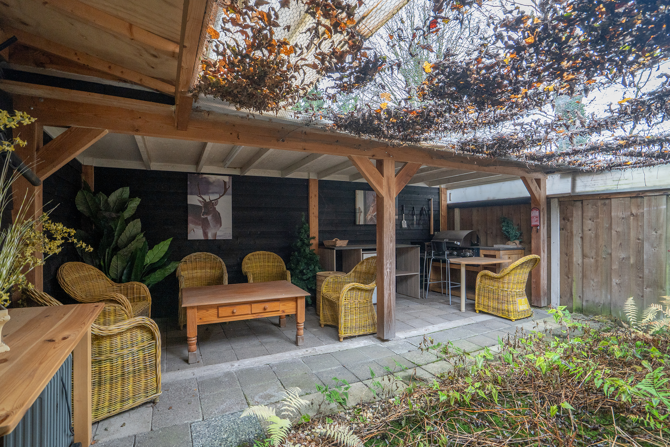 Op het perceel staat een sfeervol gastenverblijf met besloten patiotuin: volledig ingericht en perfect voor logees die graag hun eigen plek hebben. De houten afwerking en overkapping maken het een knusse, volwaardige plek voor ieder seizoen.