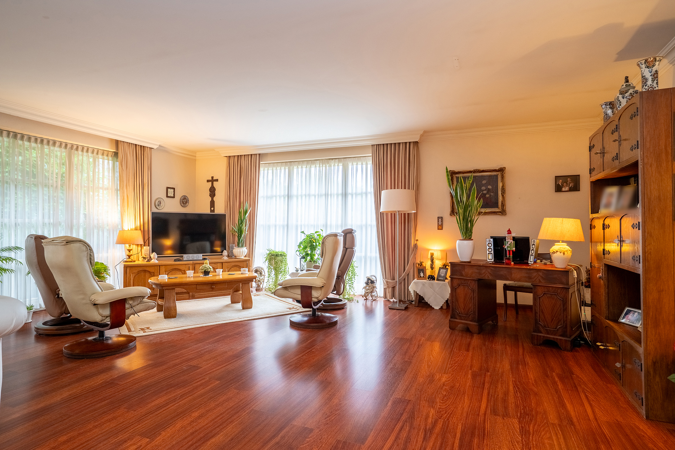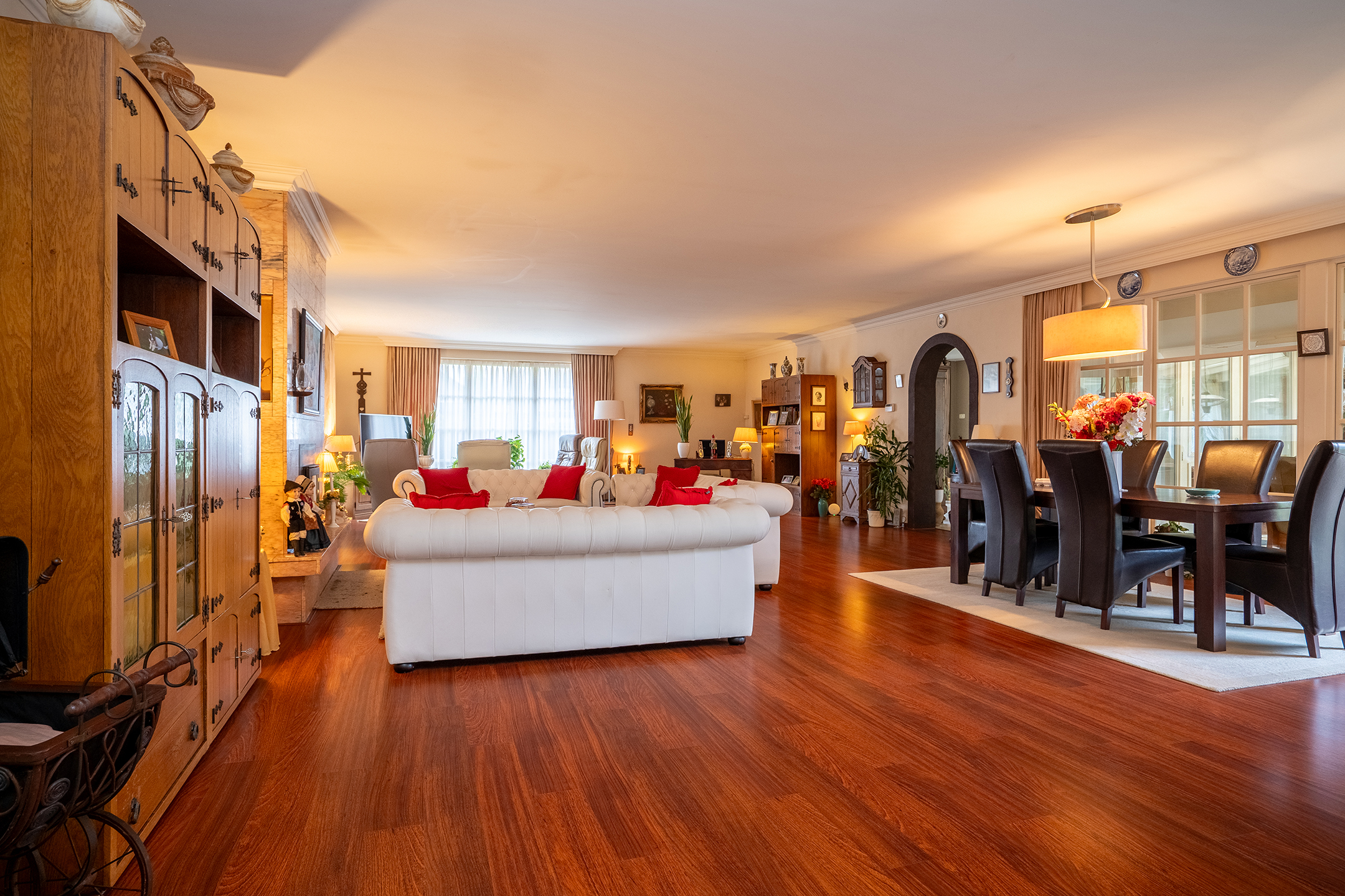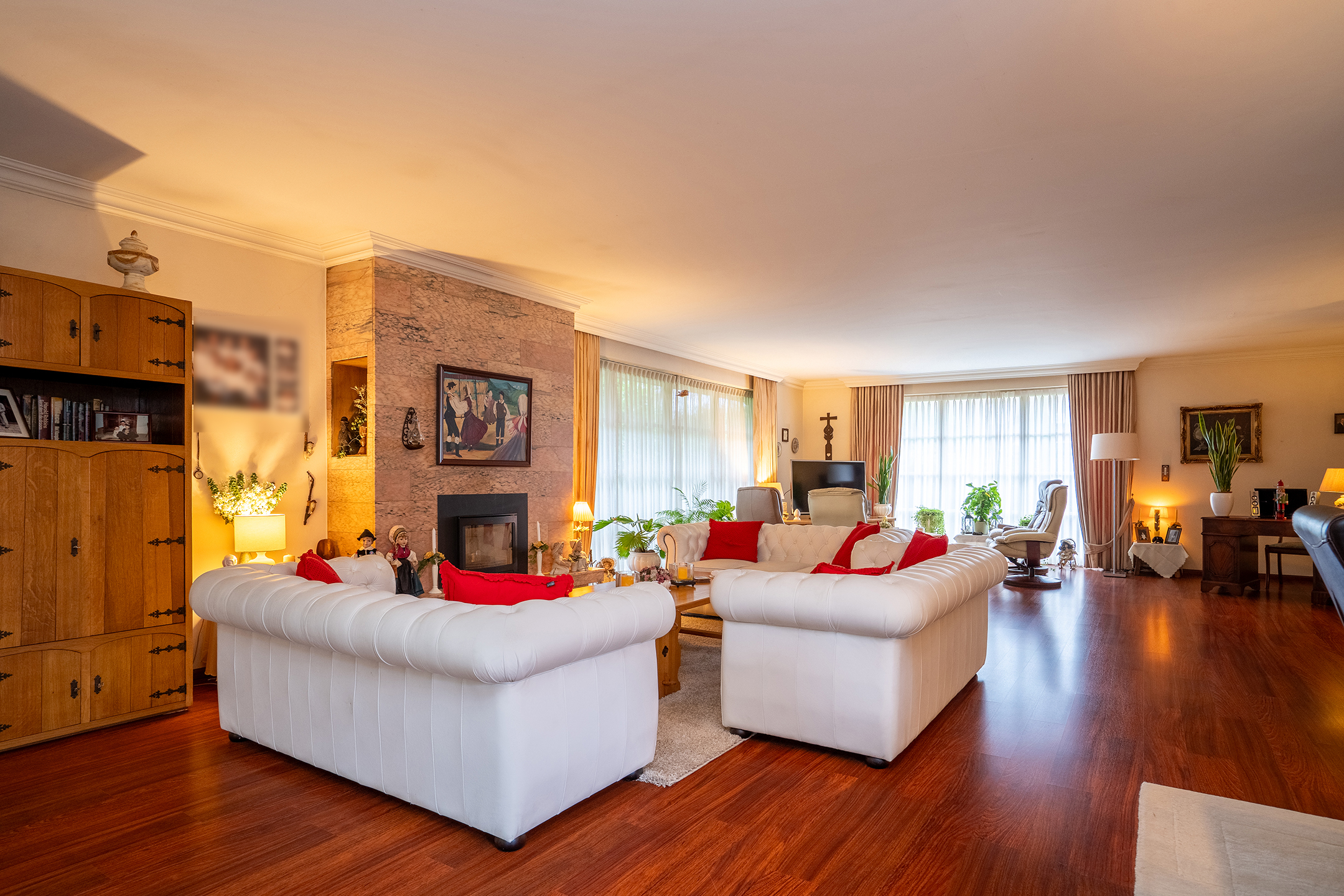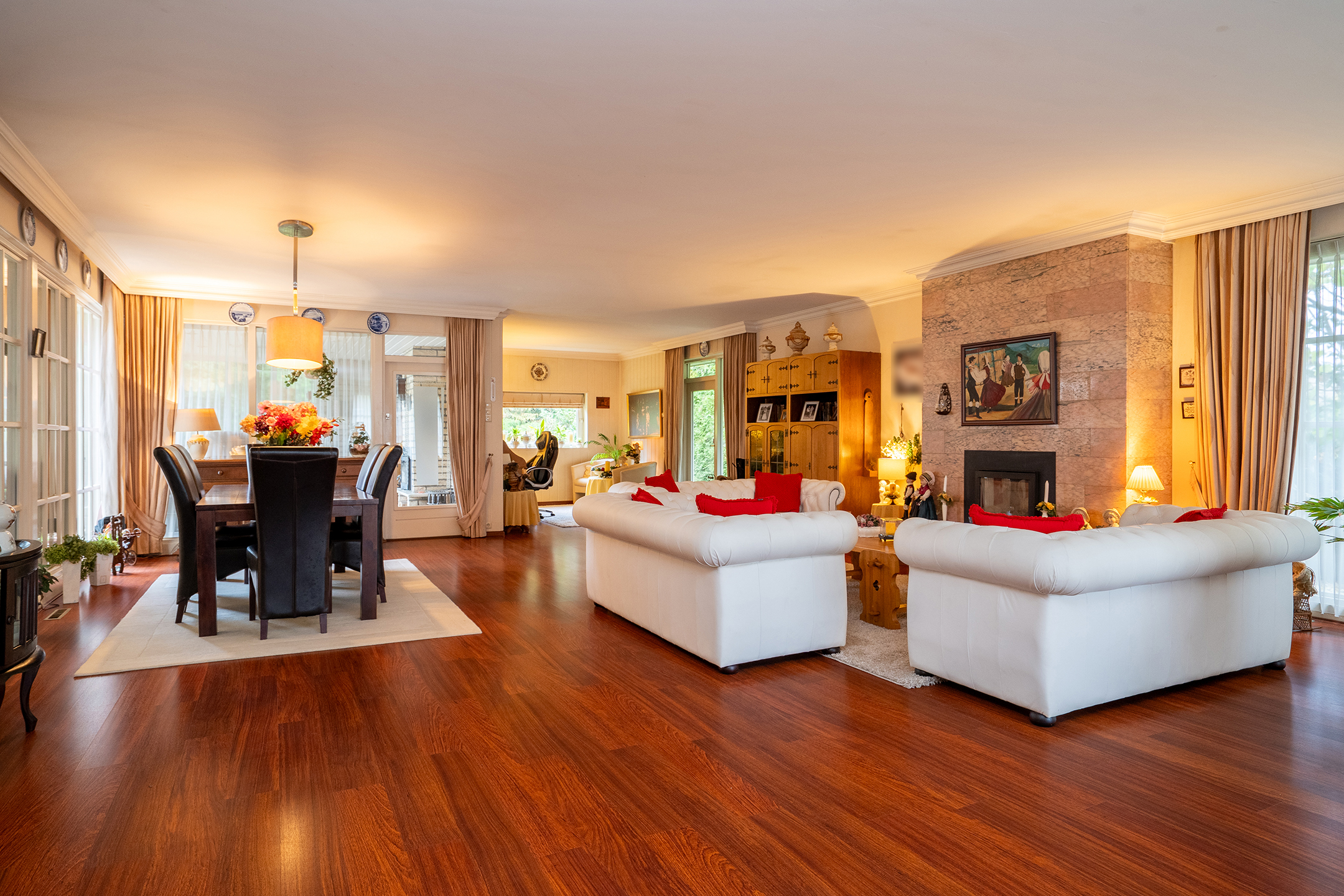 Via de centrale hal met elegante travertinvloer betreed je de woning met een gevoel van stijl en ruimte. Aan de rechterzijde vind je de woonvleugel met een indrukwekkende living van ca. 90 m². Grote raampartijen brengen de tuin overal naar binnen, terwijl de schouw met houthaard zorgt voor een warme en uitnodigende sfeer.